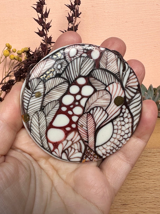 Sepia and red ‘seafoam’ design, hand painted pendant with gold lustre detail