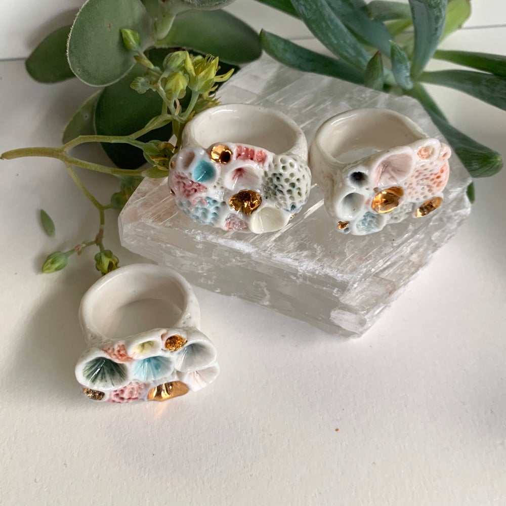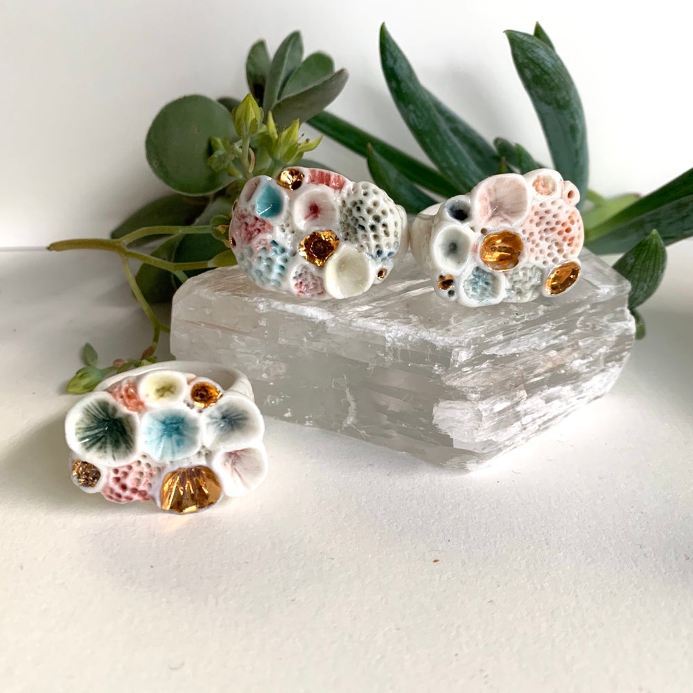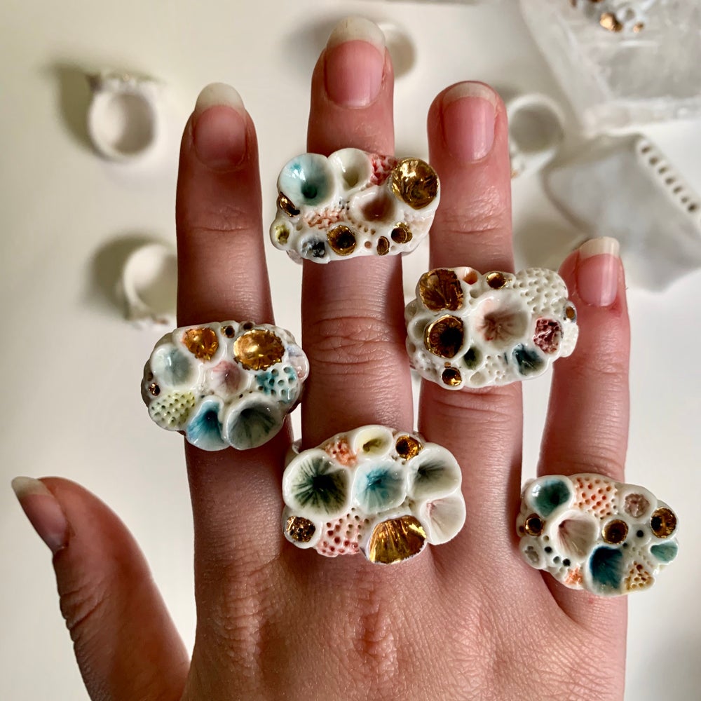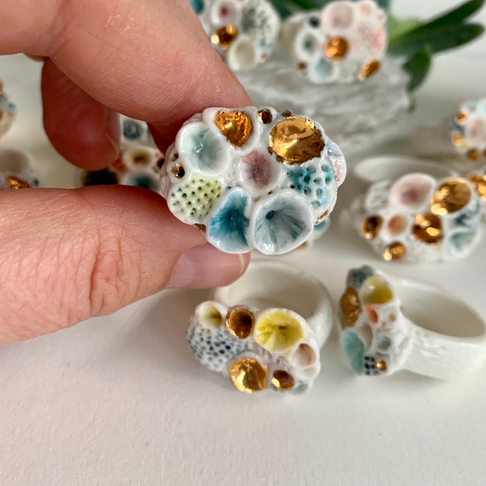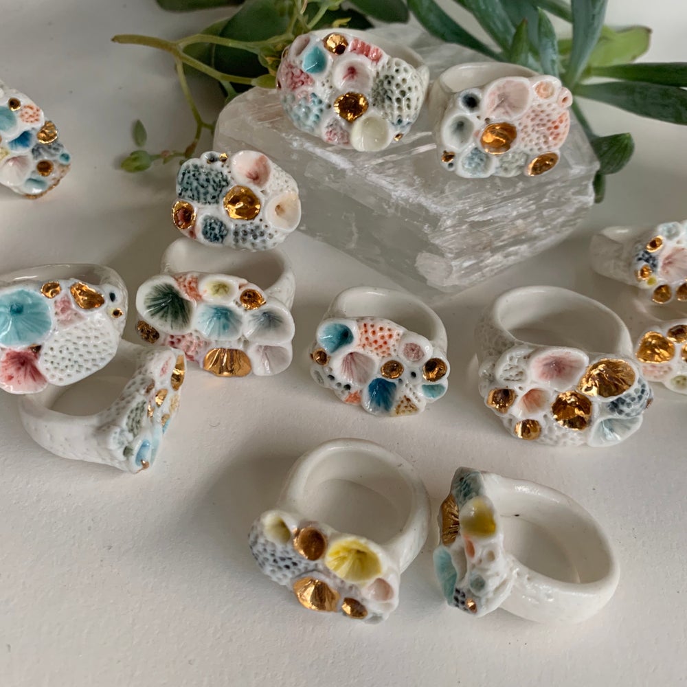 This is a one off handmade ring made by Katherine in her home studio in Castlemaine, Victoria. One 'Rock coral’ hand formed and textured porcelain ring, painted with watercolour style detail. These rings are inspired by beach combing and collecting and looking at treasures along the shoreline and in rock pools. Mimicking the shapes and textures of coral and shell.