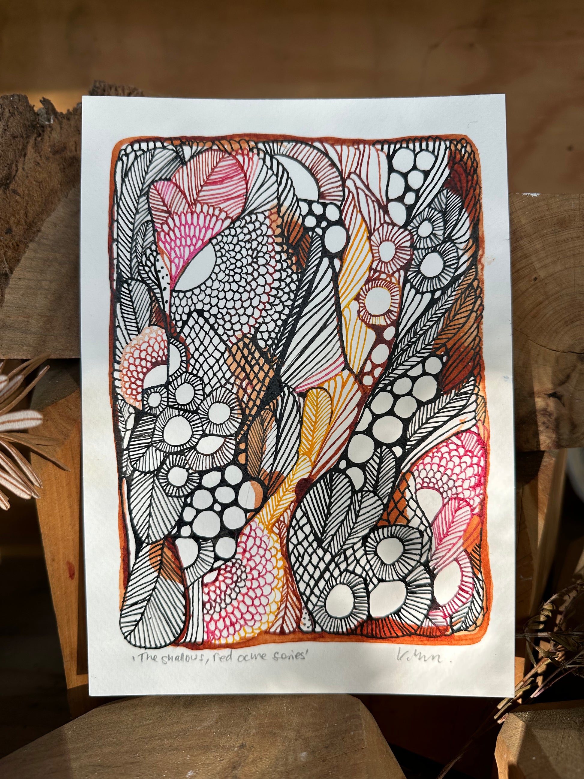 Pen and ink, and watercolour original drawing on 100 % cotton, 300gsm cold pressed, textured watercolour paper.