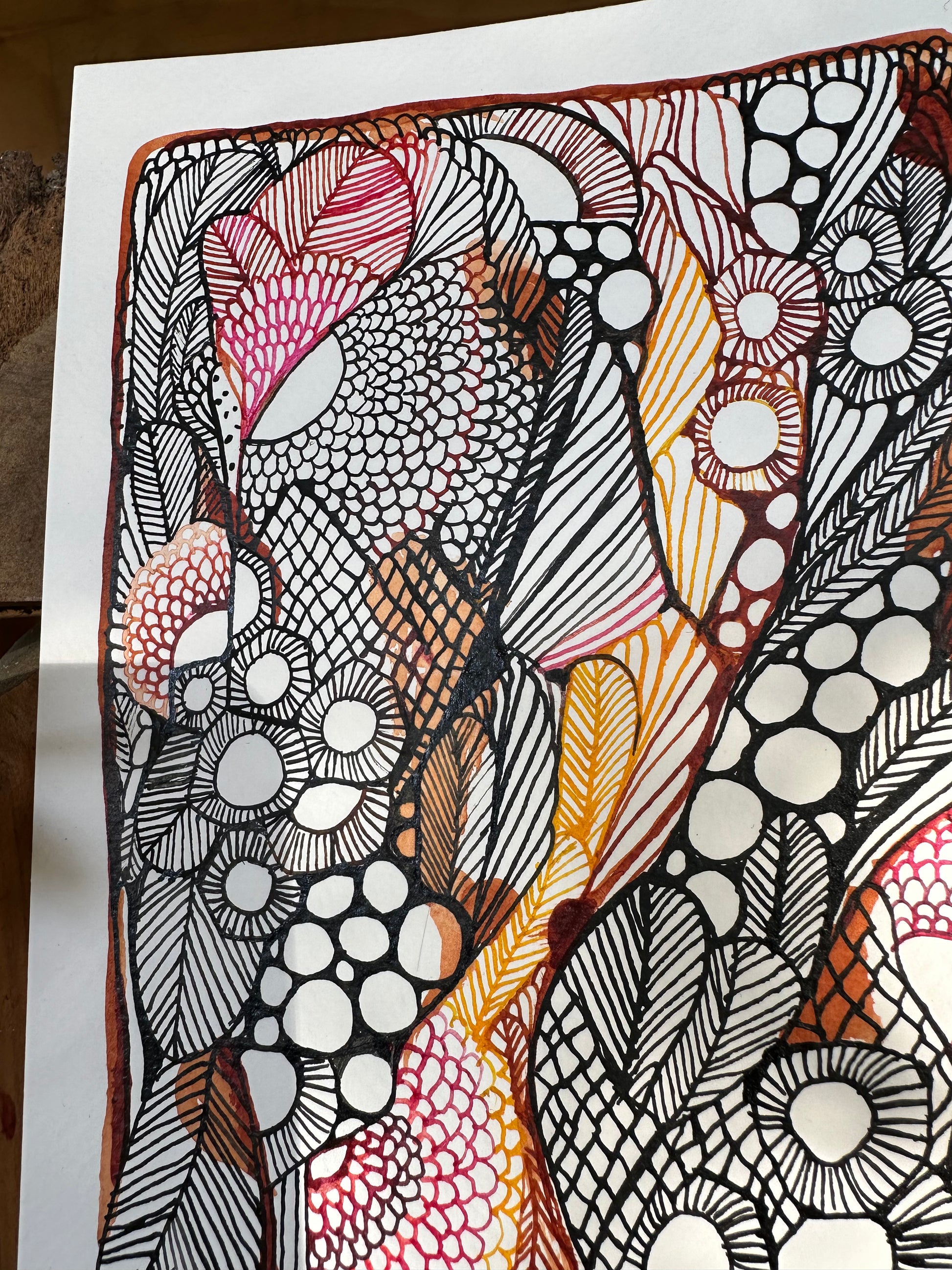 I draw intuitively, with possibly a colour palette and shape in mind, letting the end result emerge as it is drawn.