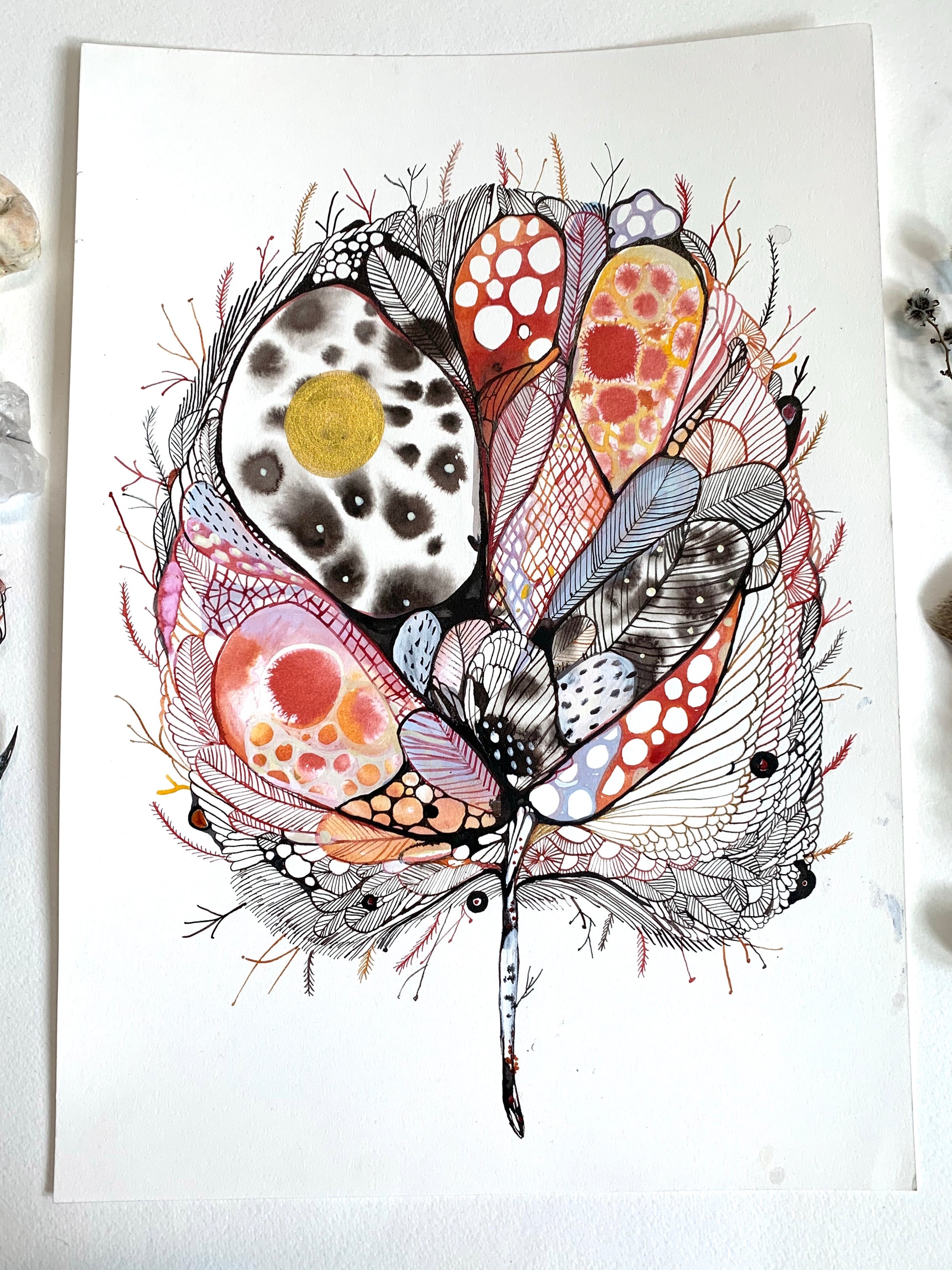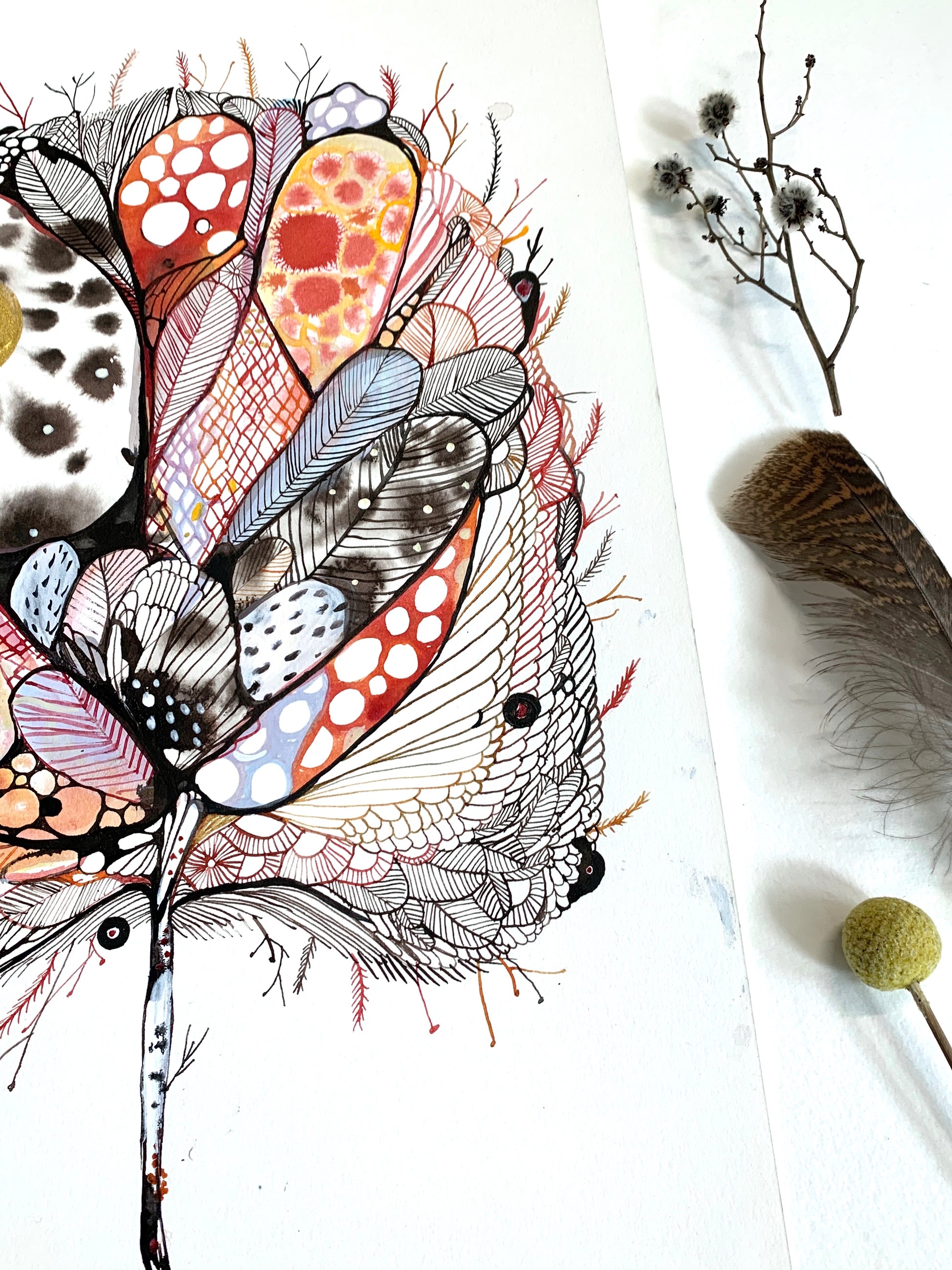 Pen and ink, and brush and ink original drawing on Arches 100 % cotton, 300gsm hot pressed watercolour paper.