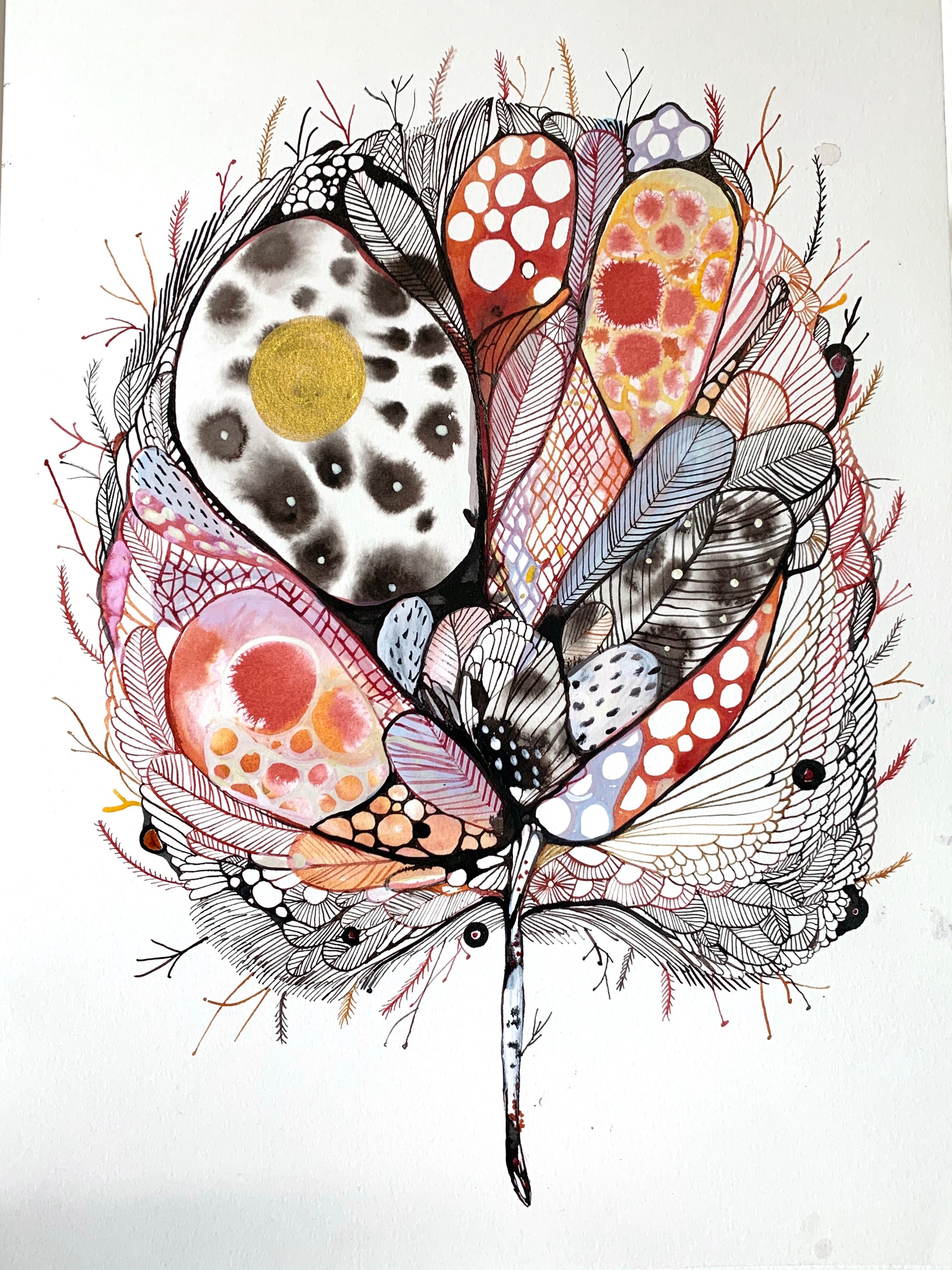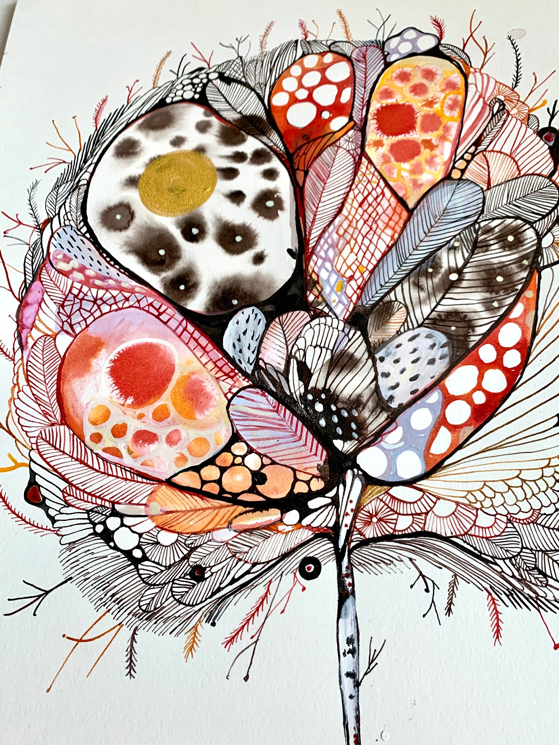 I draw intuitively, with possibly a colour palette and shape in mind, letting the end result emerge as it is drawn.