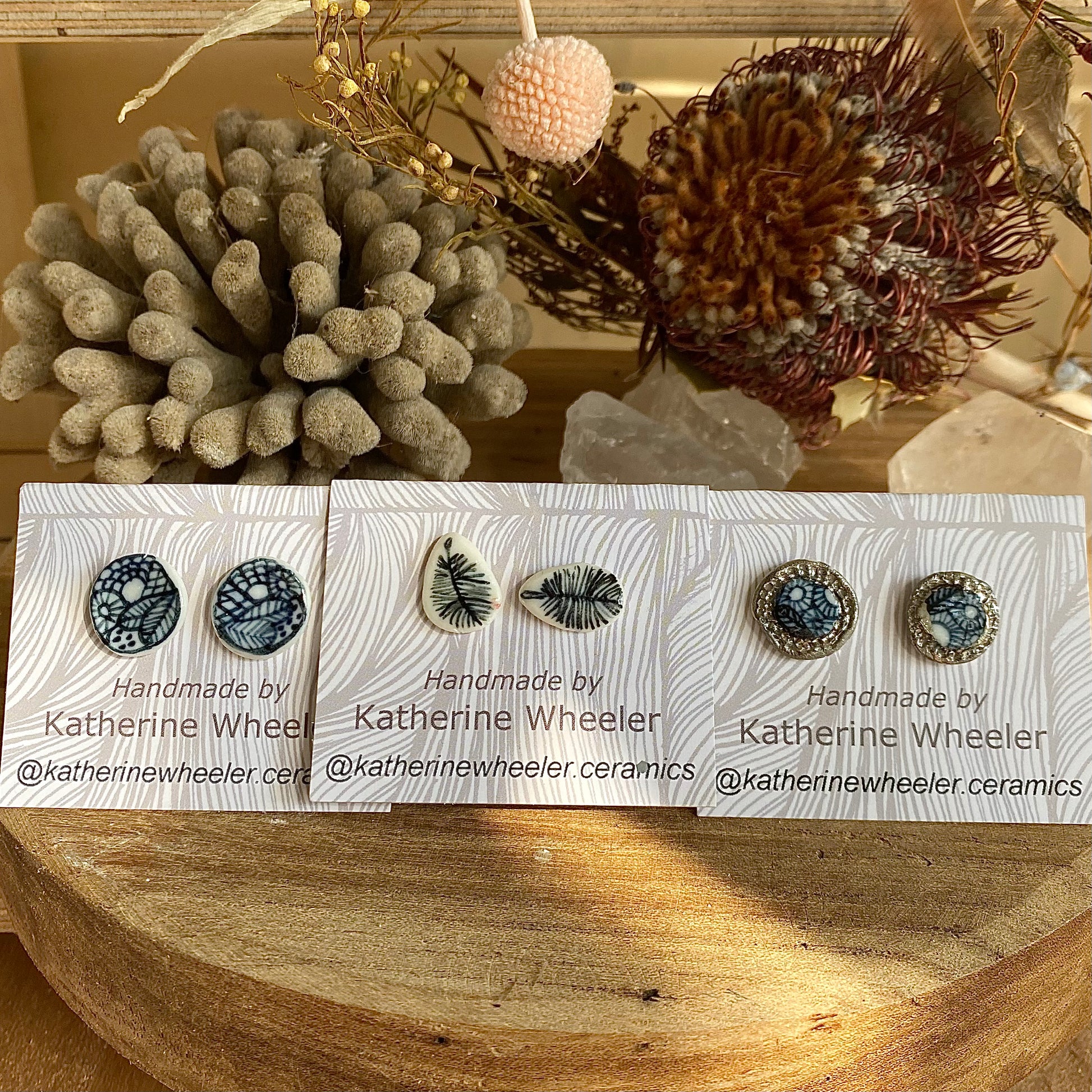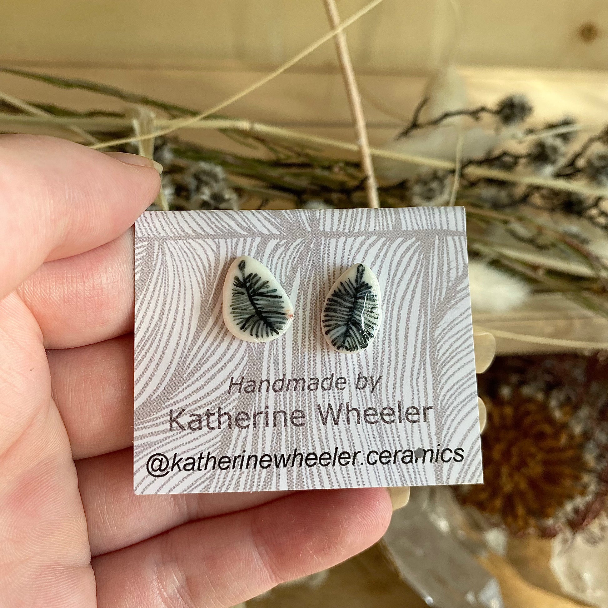 Hand made porcelain stud earrings, on surgical steel posts. Each piece is hand painted on southern ice porcelain, the illustrated design is inspired by the textures and shapes observed while beach combing.