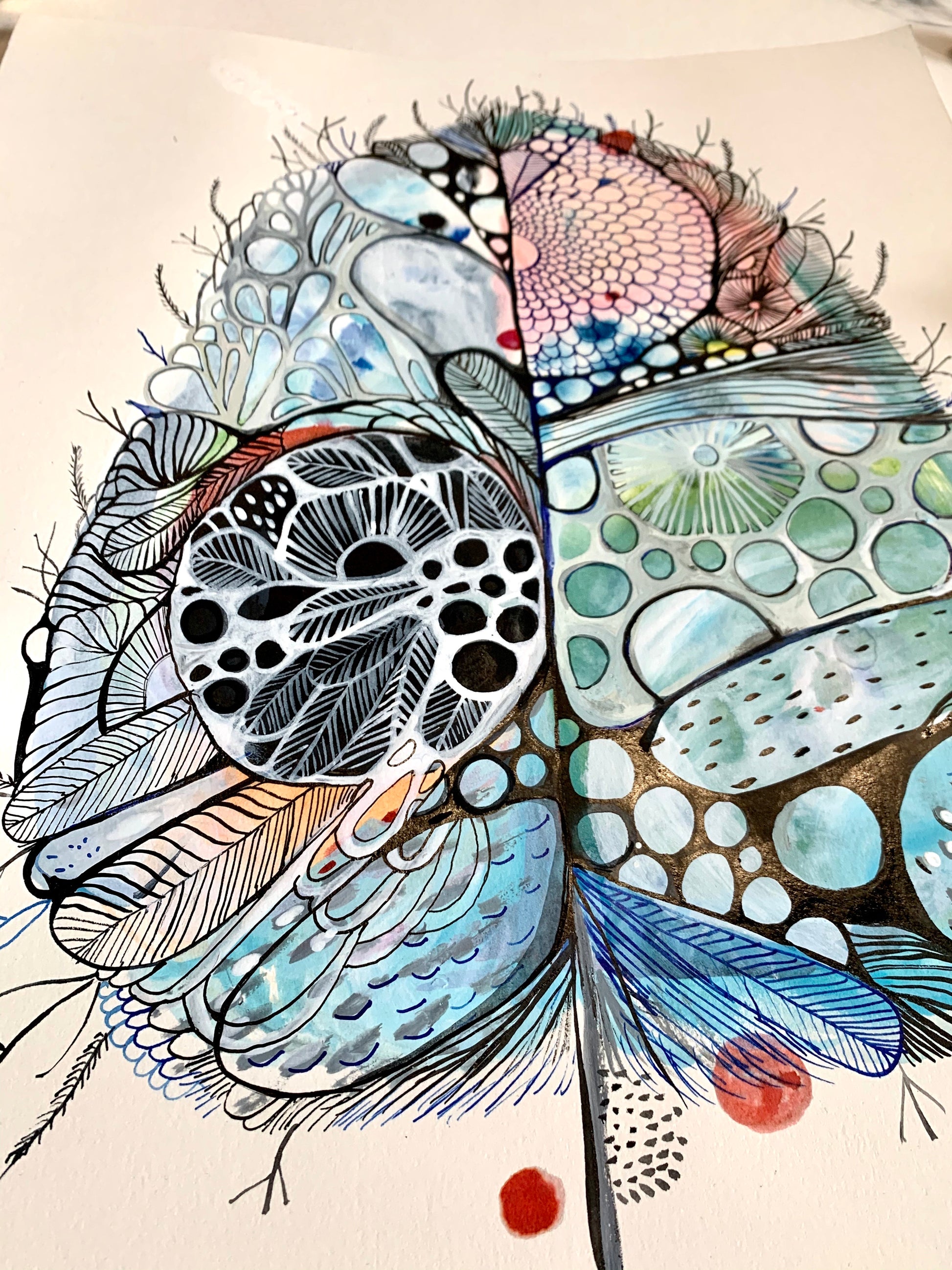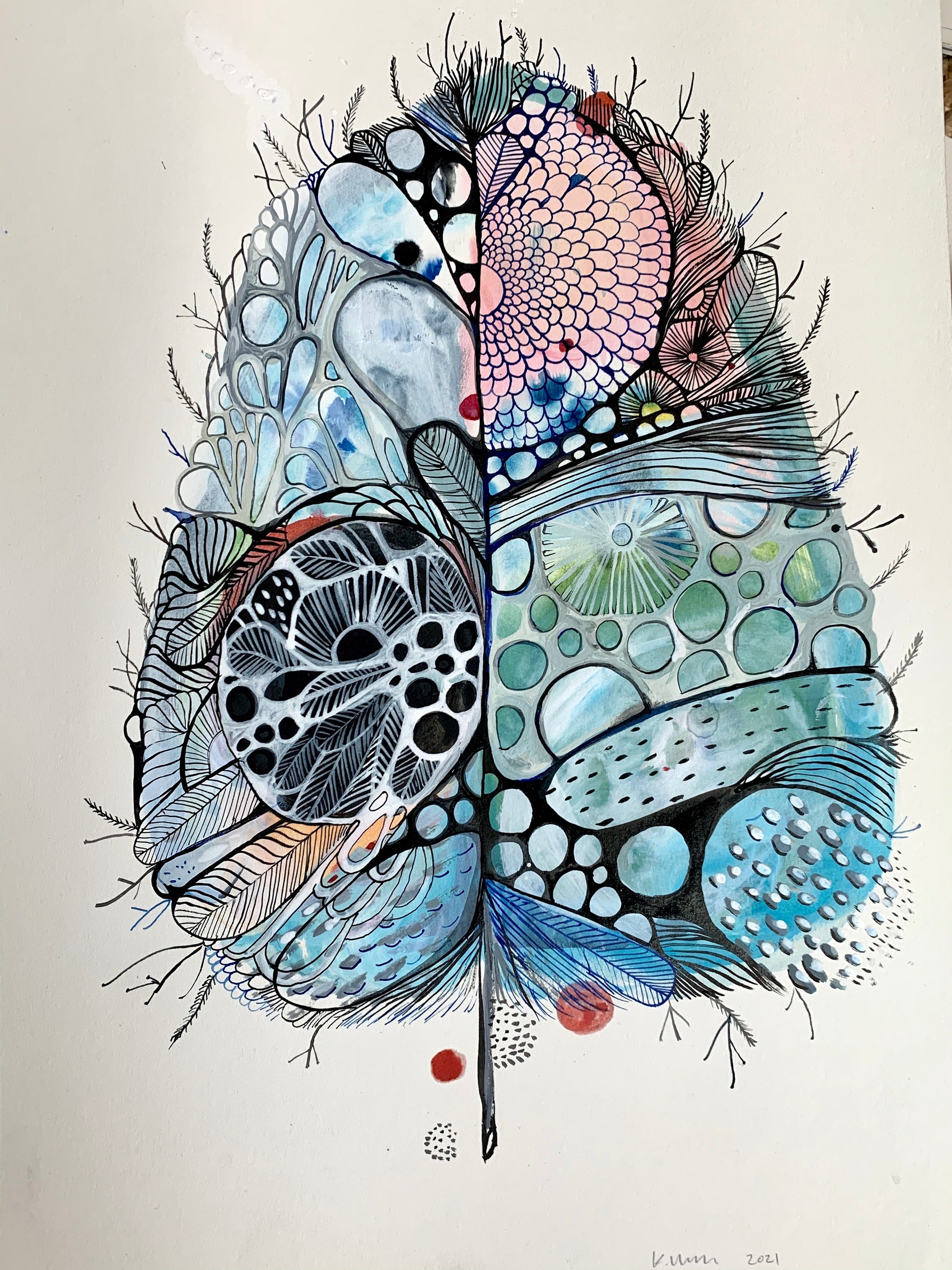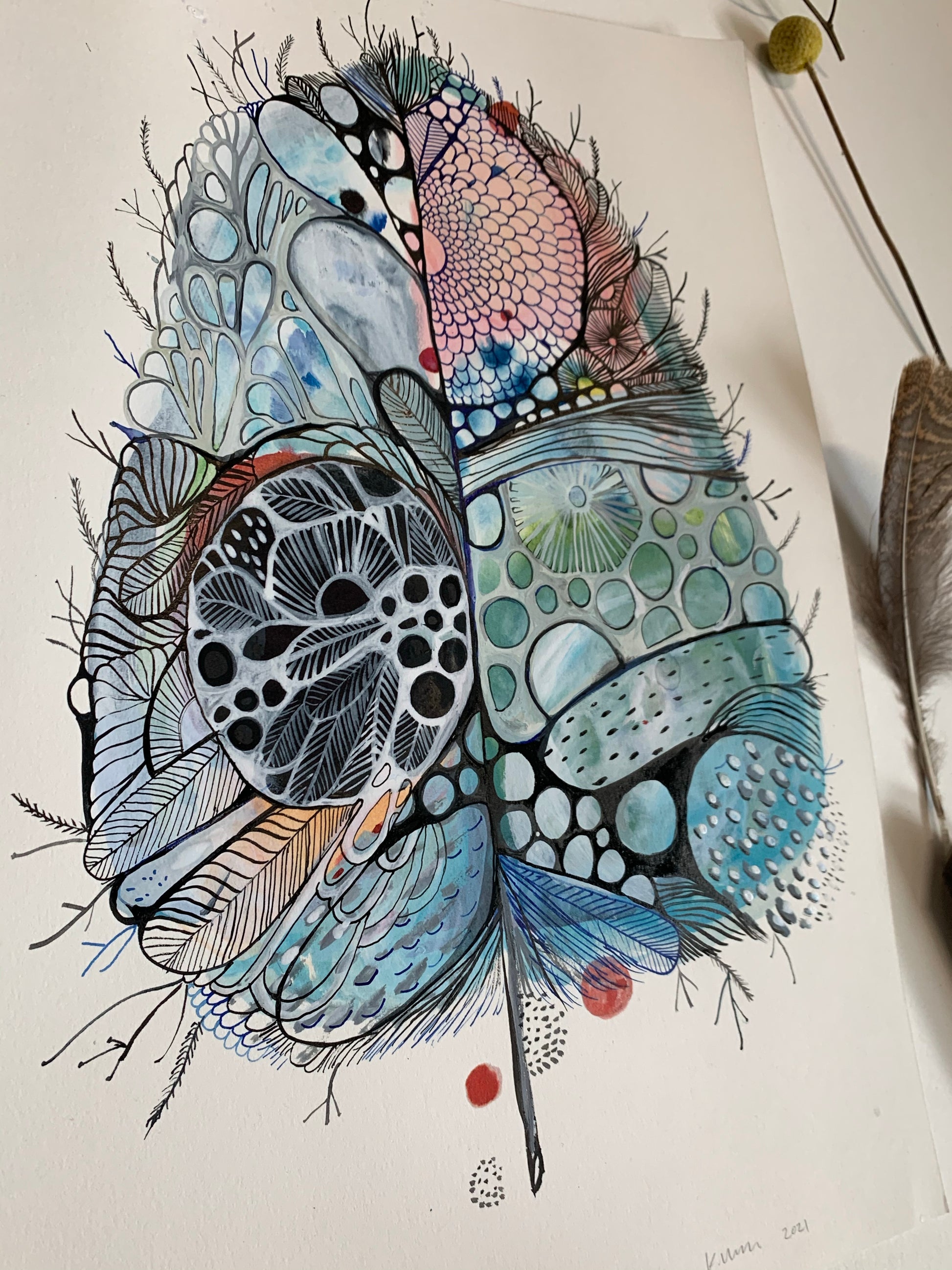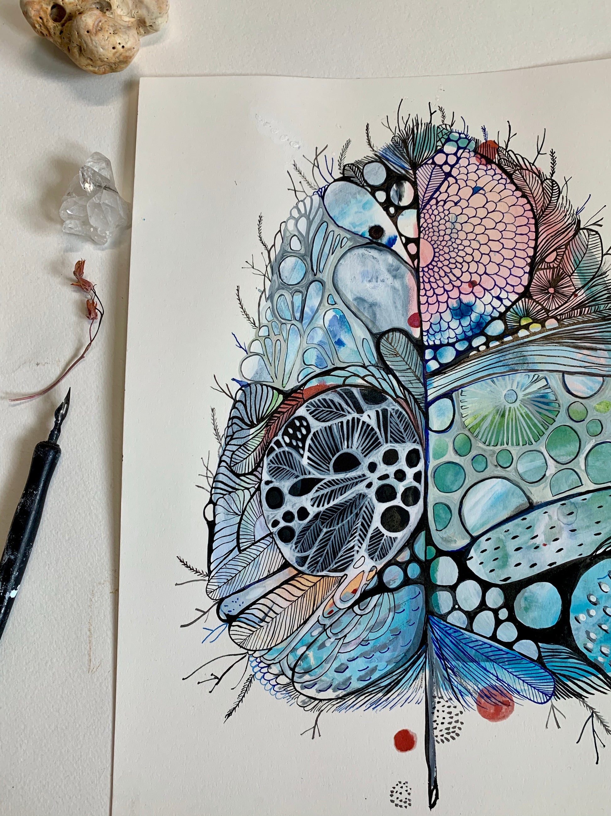 I draw intuitively, with possibly a colour palette and shape in mind, letting the end result emerge as it is drawn.