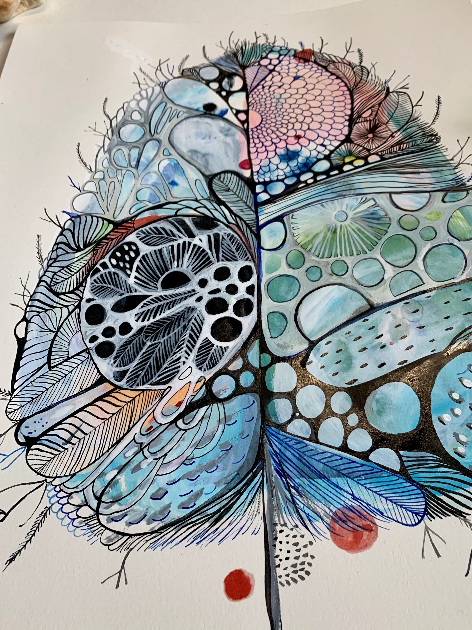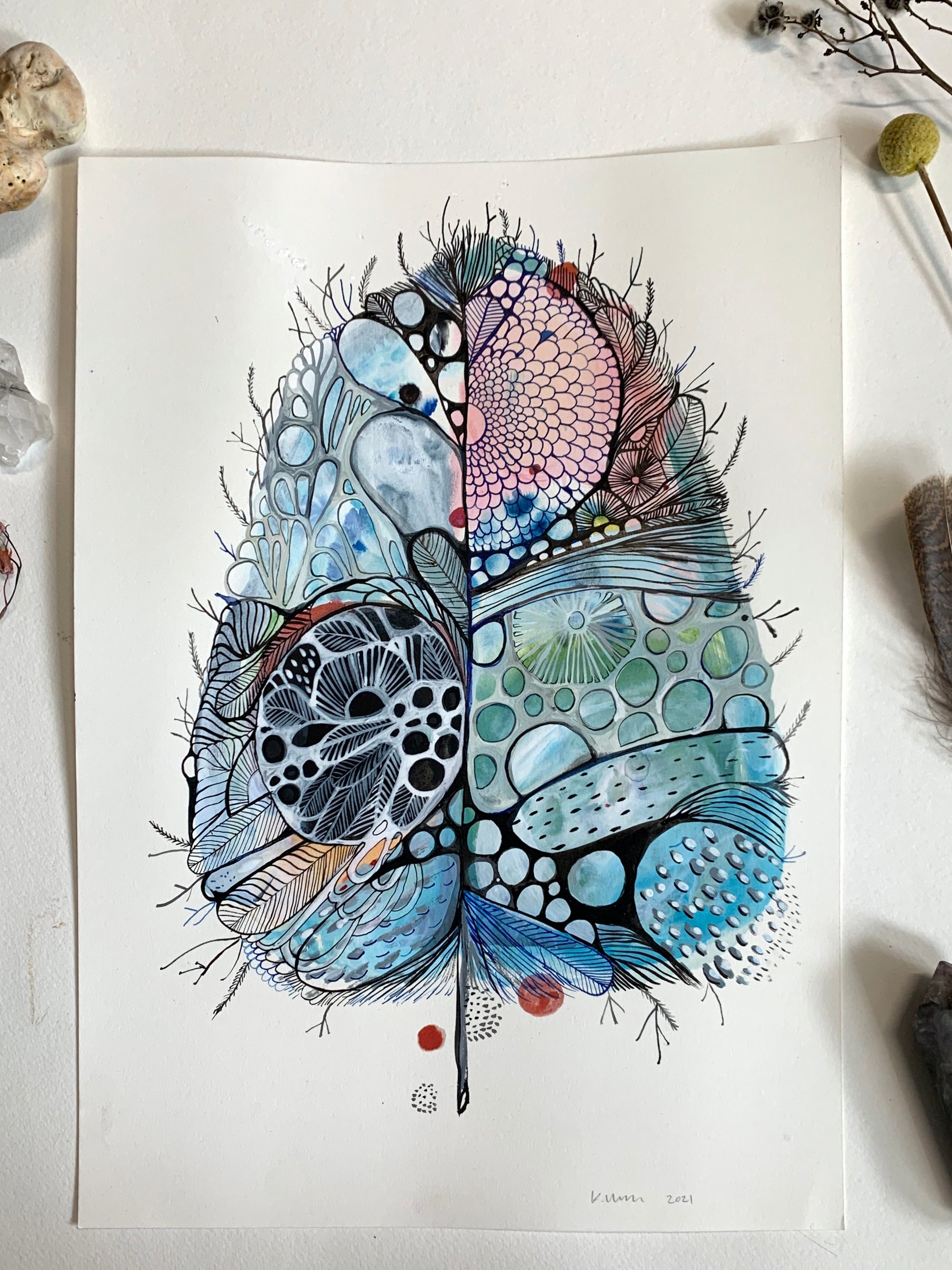 I combine the textures, patterns and colours found at the edge of the ocean, with imagery of feathers, leaf veins, mosses and lichens observed in the Victorian bush.