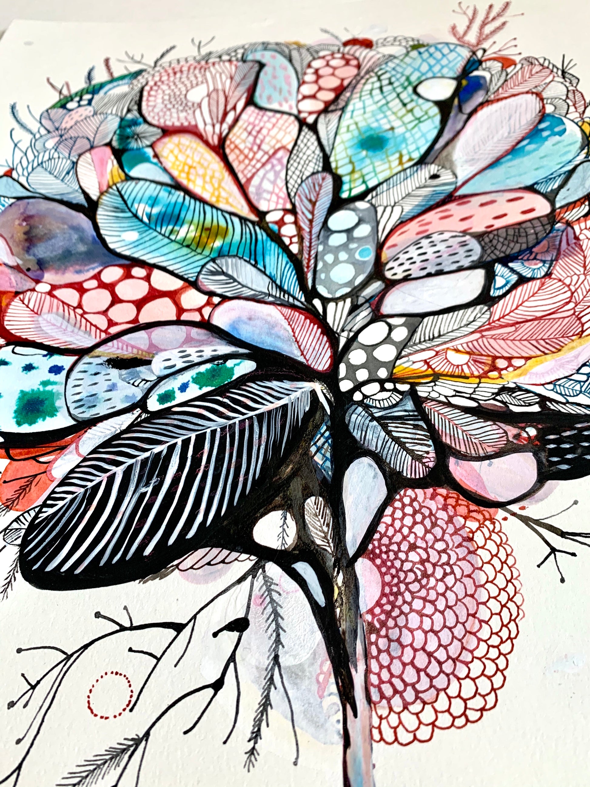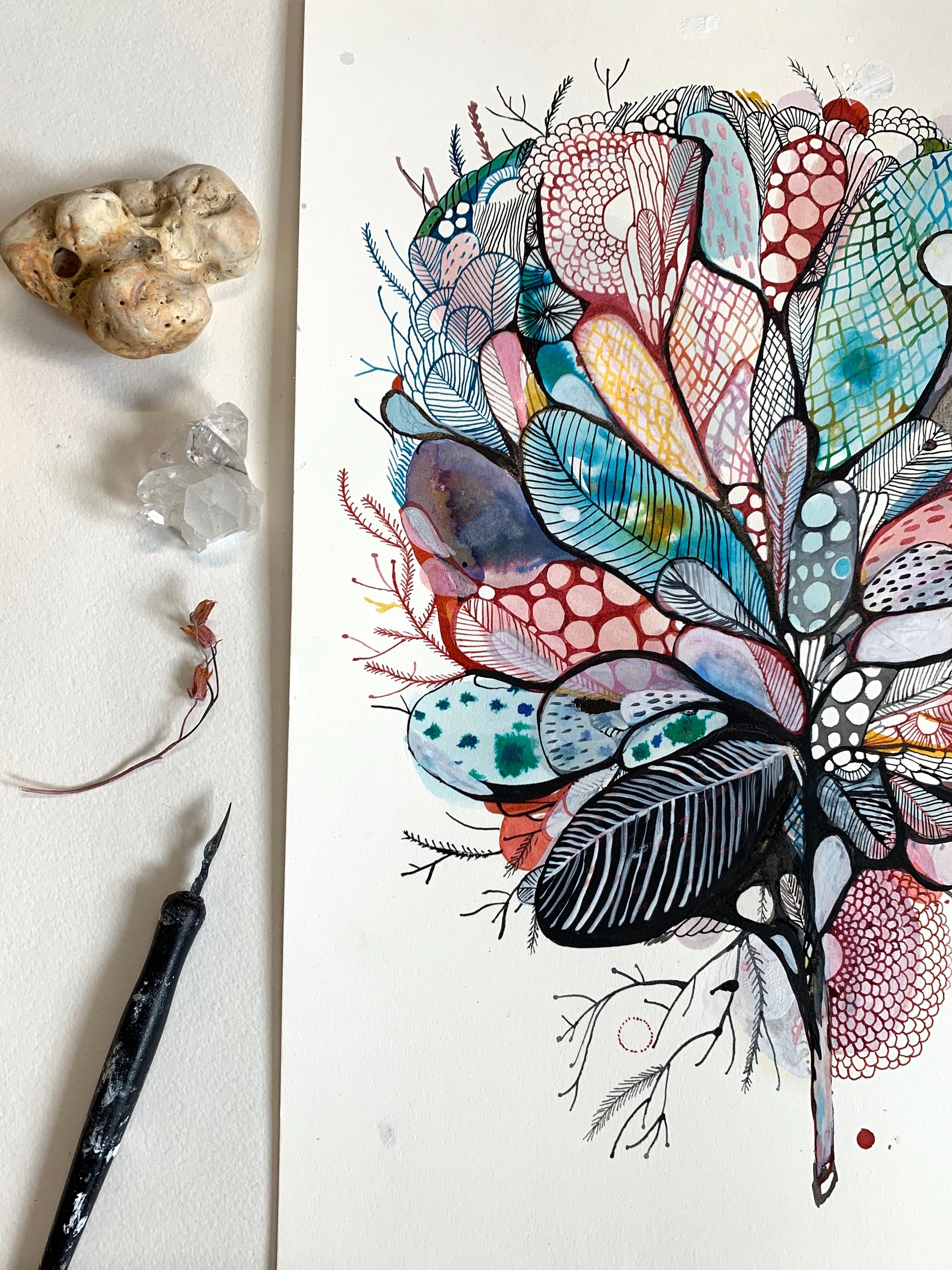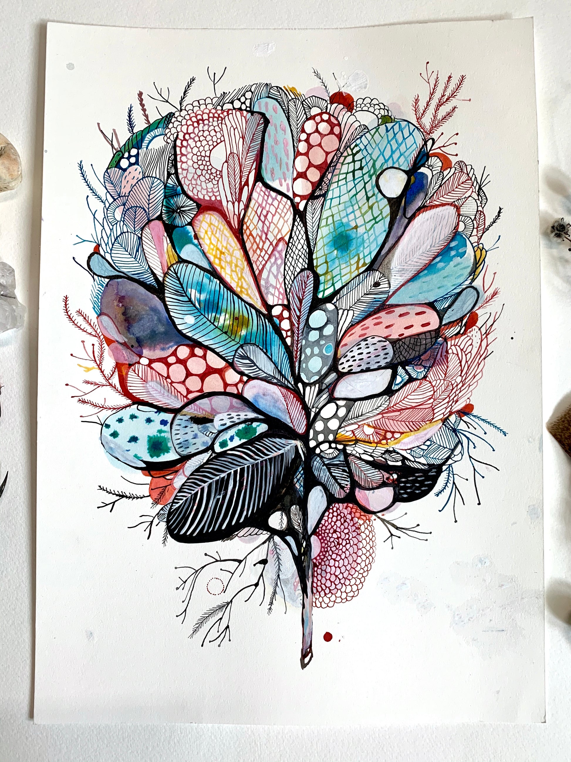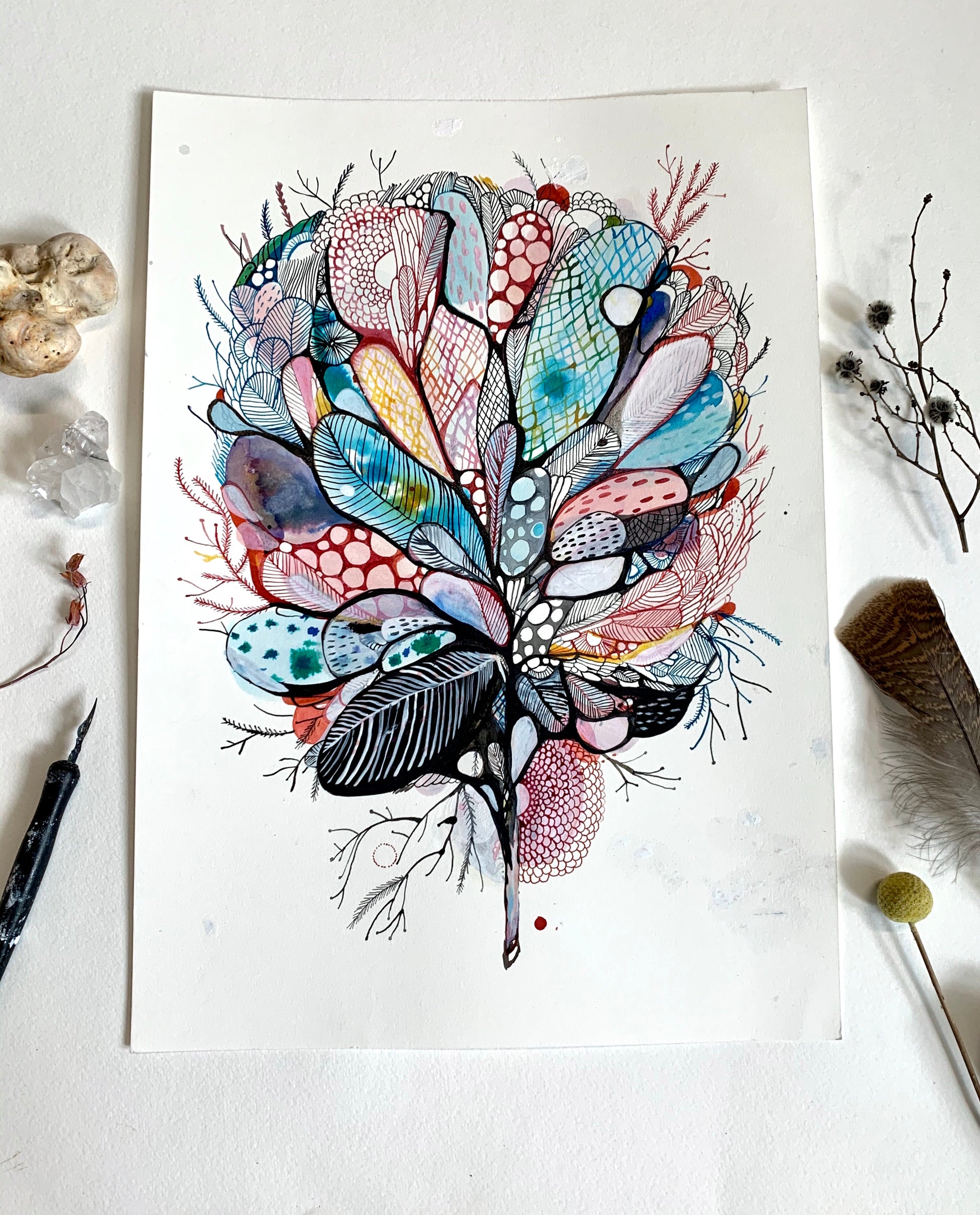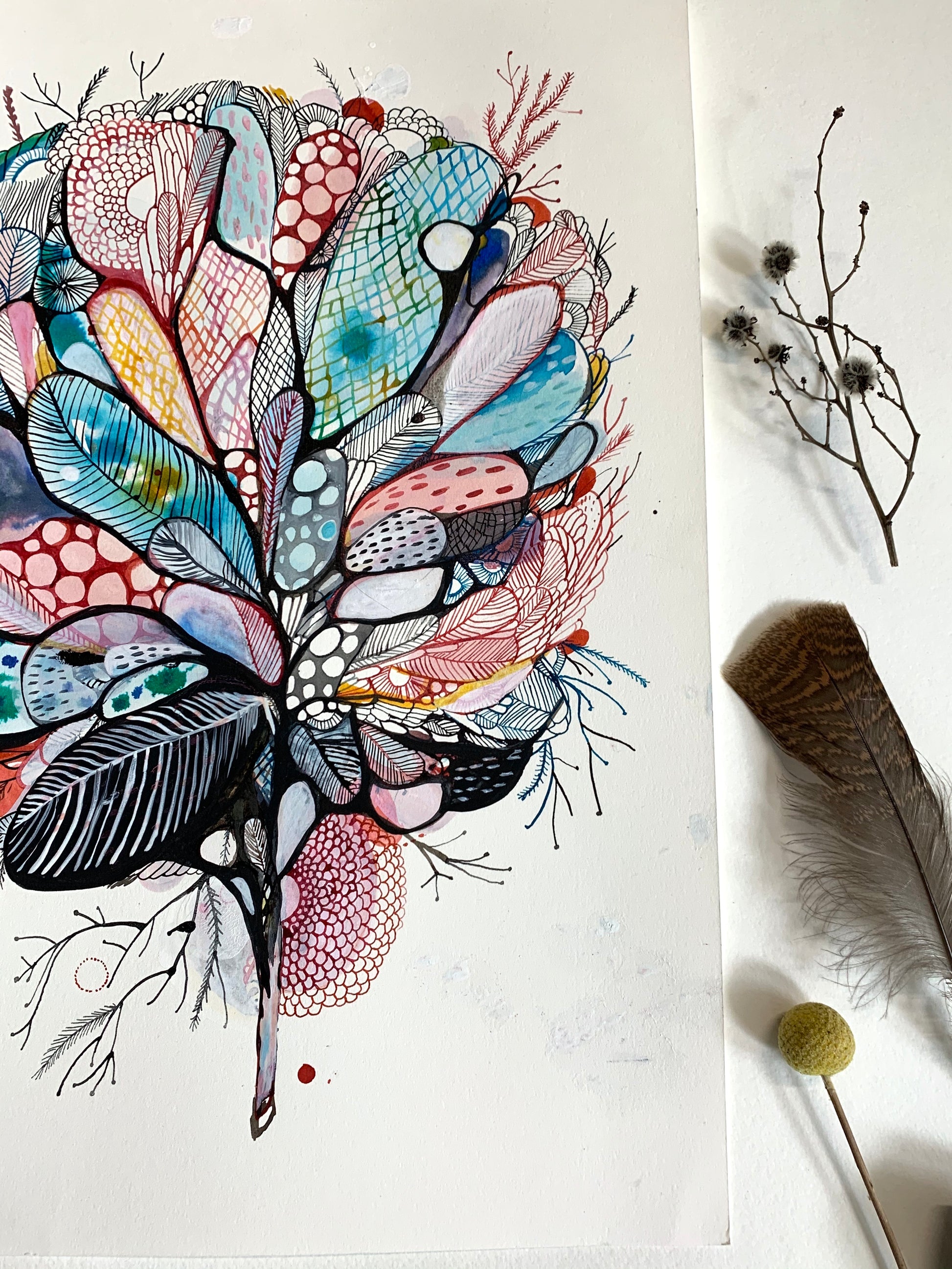 I draw intuitively, with possibly a colour palette and shape in mind, letting the end result emerge as it is drawn.