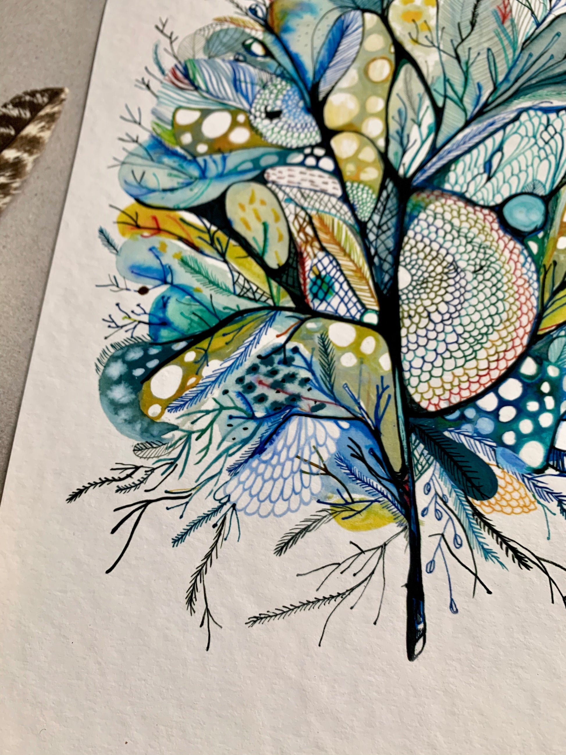 My drawings are inspired by pattern and texture found in natural objects. I love beach combing and examining things that wash up- or looking at the shapes and colours of bones found bleached in the bush. I create my own odd 'imaginary' beings, which have elements shapes and textures from both from sea and land creatures.