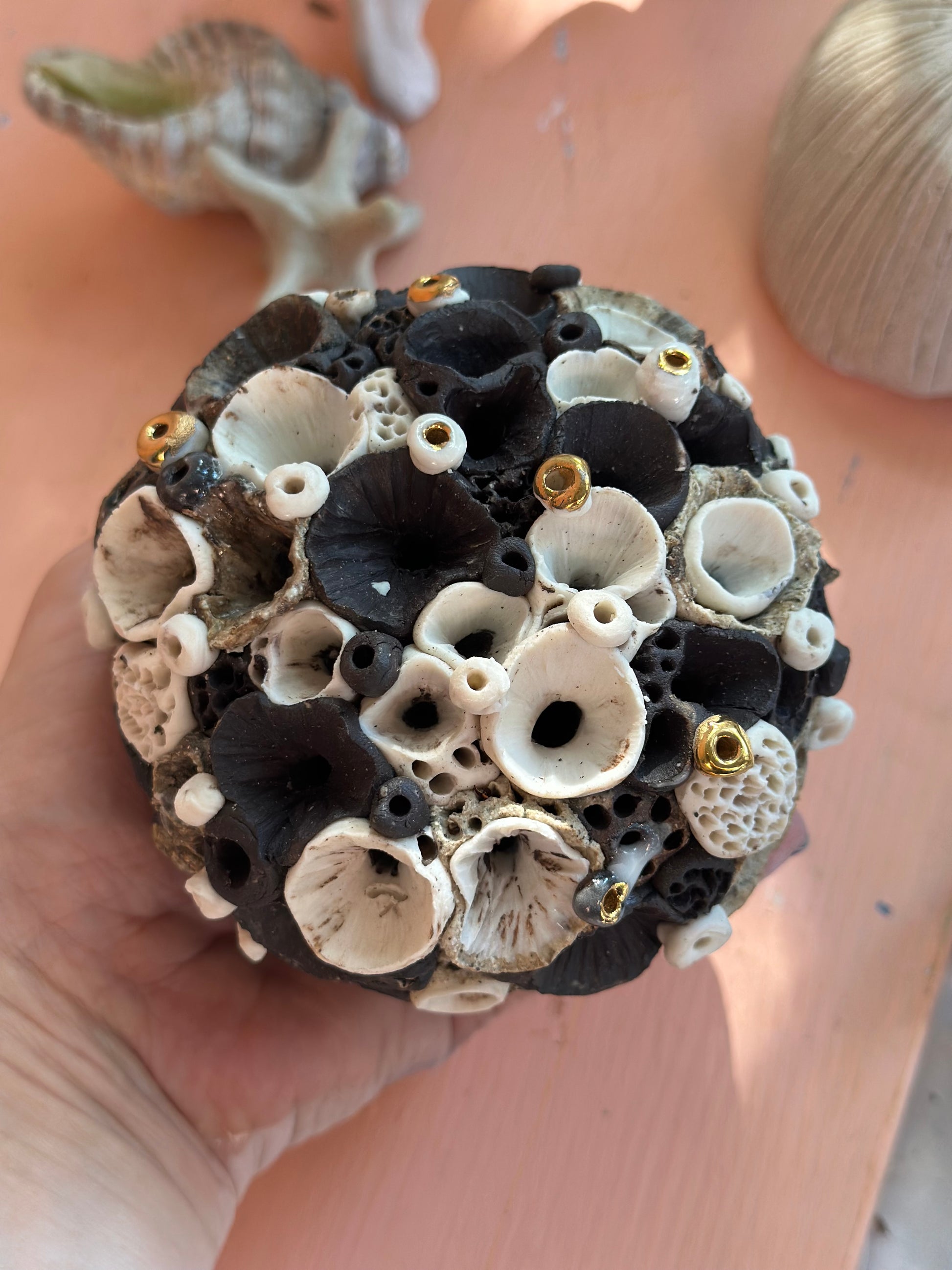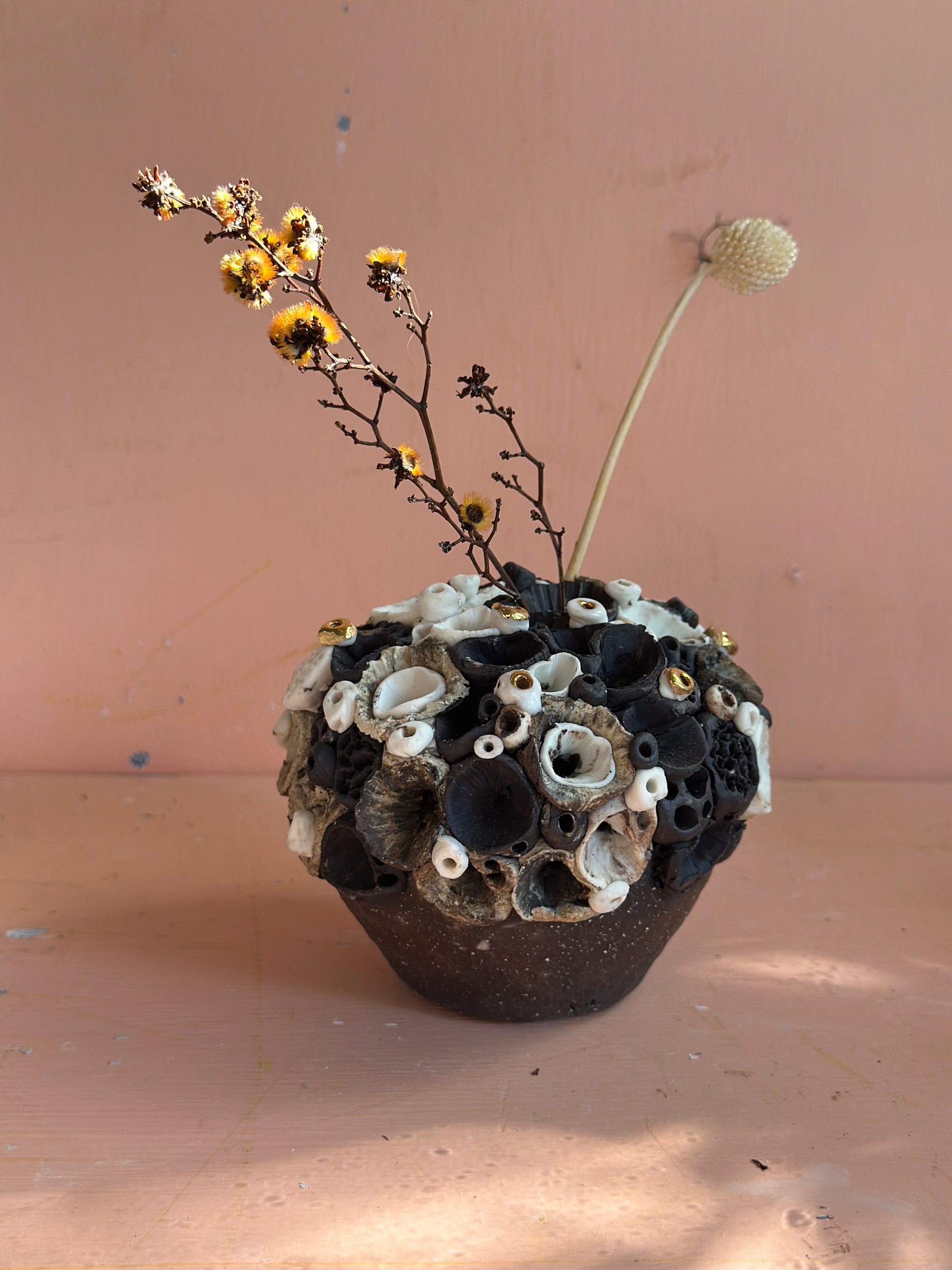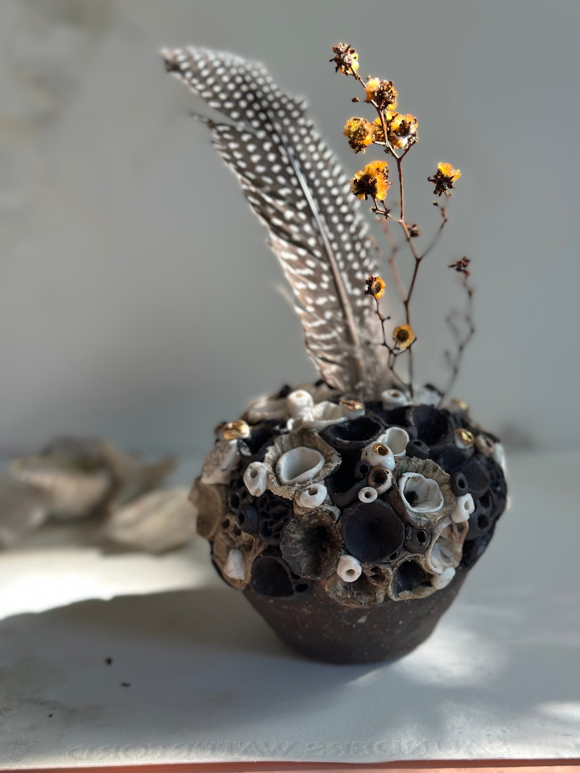 The design is inspired by corals picked up while beach combing. And the idea that you can bring home foraged treasures to display in the small holes in the top of the piece.