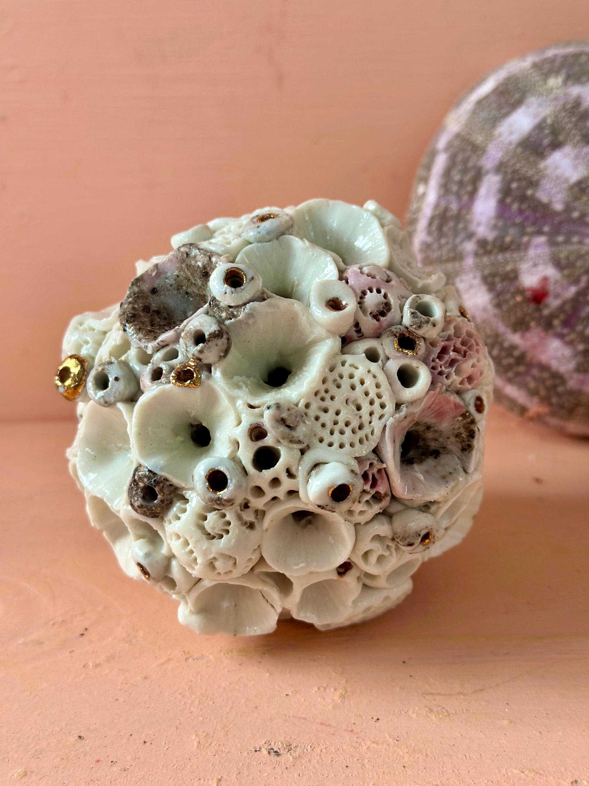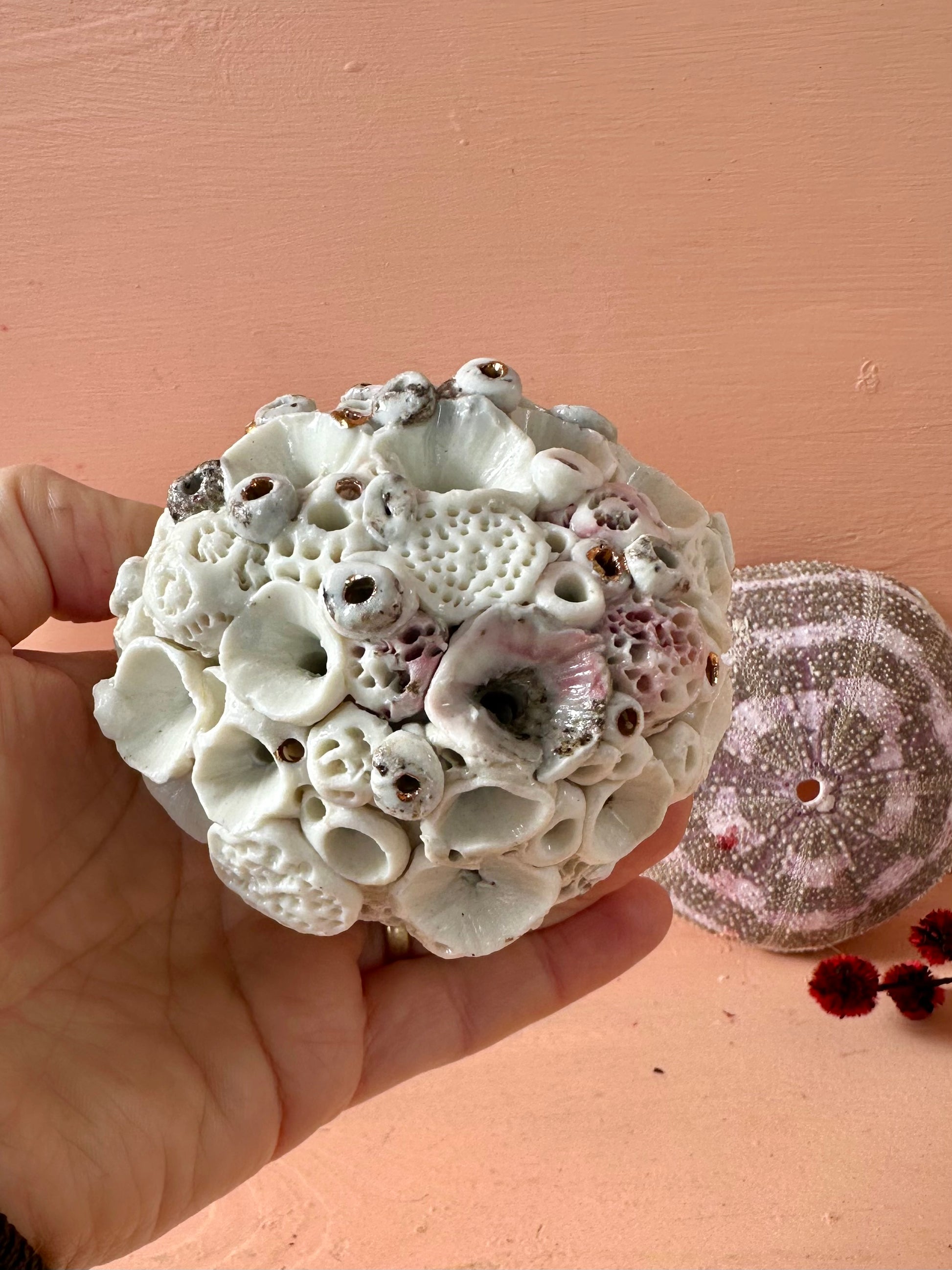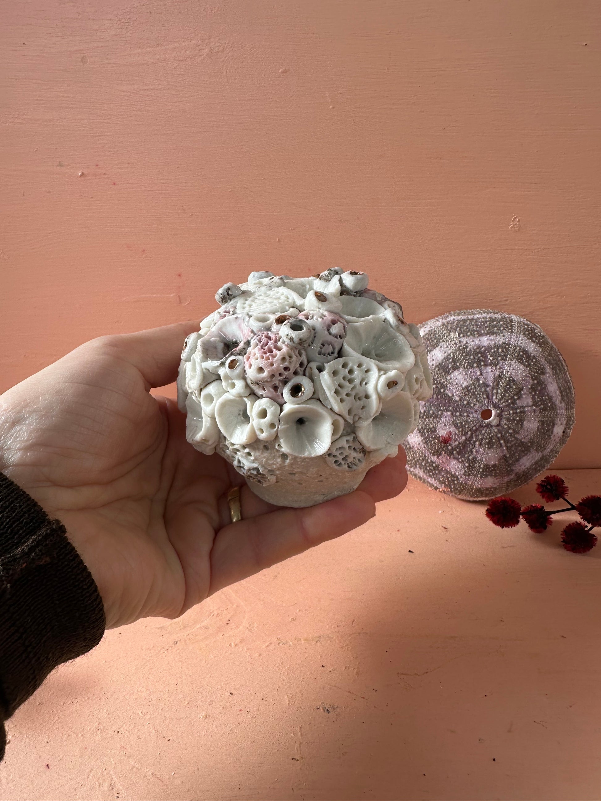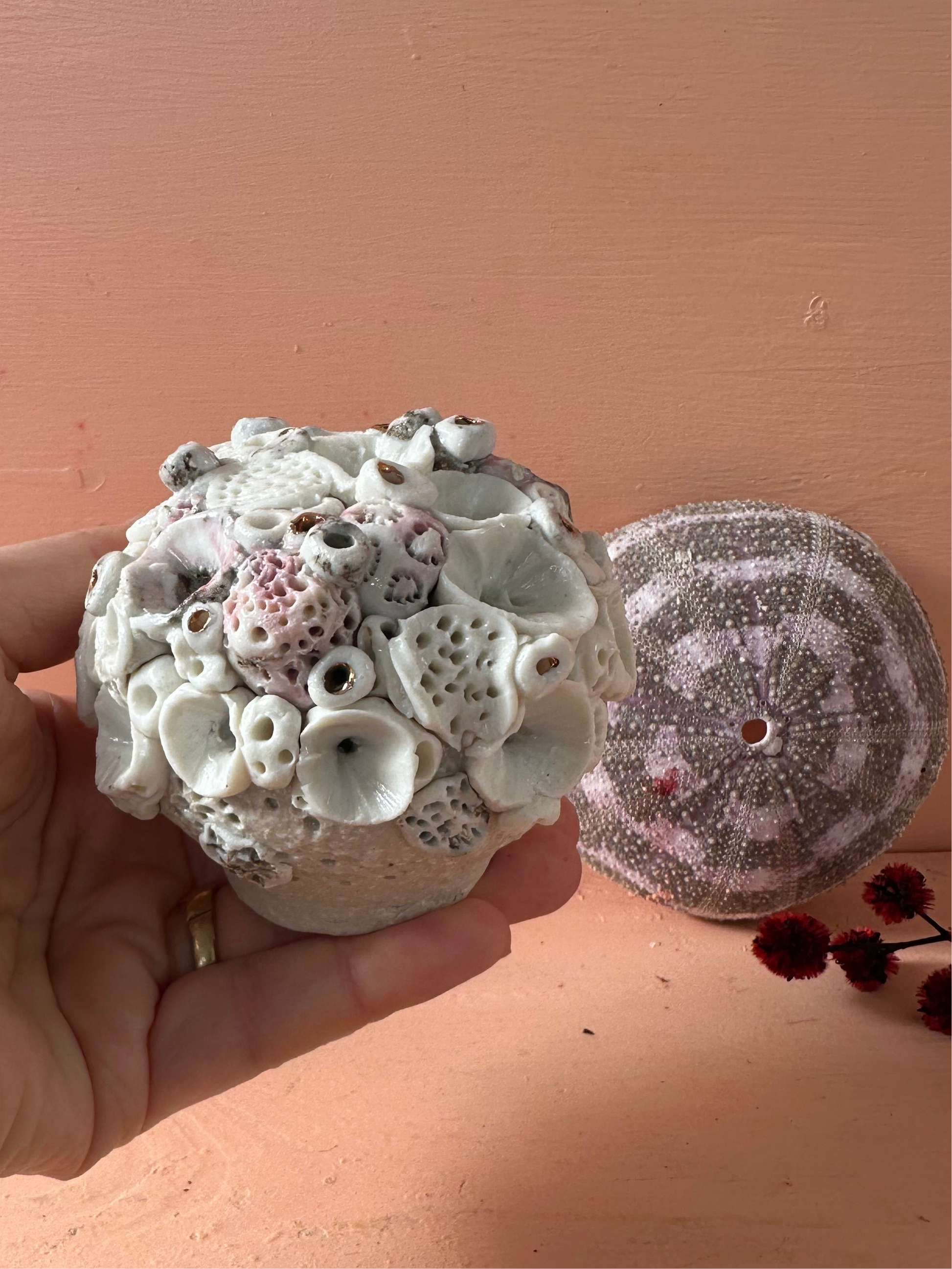 The design is inspired by corals picked up while beach combing. And the idea that you can bring home foraged treasures to display in the small holes in the top of the piece.