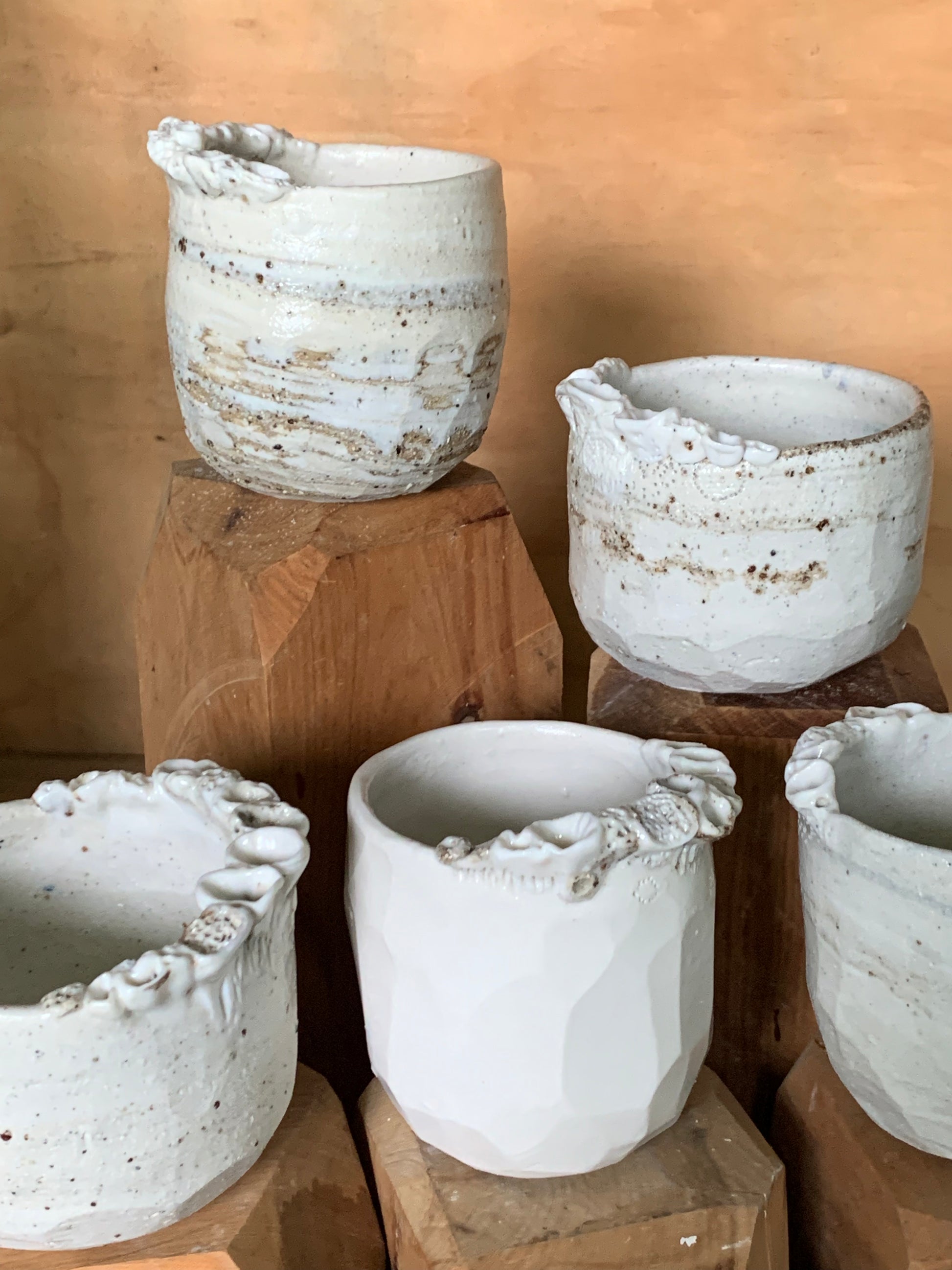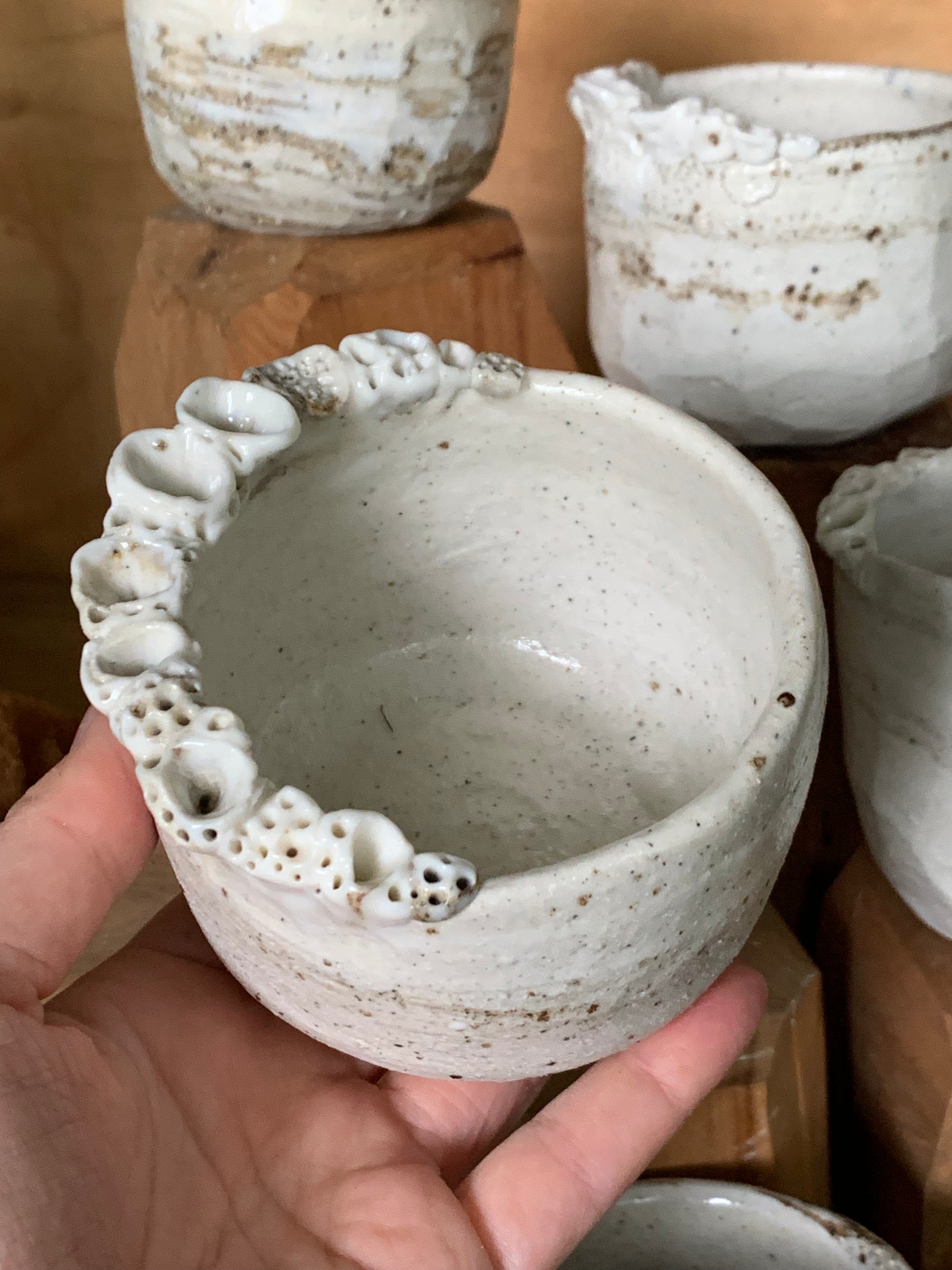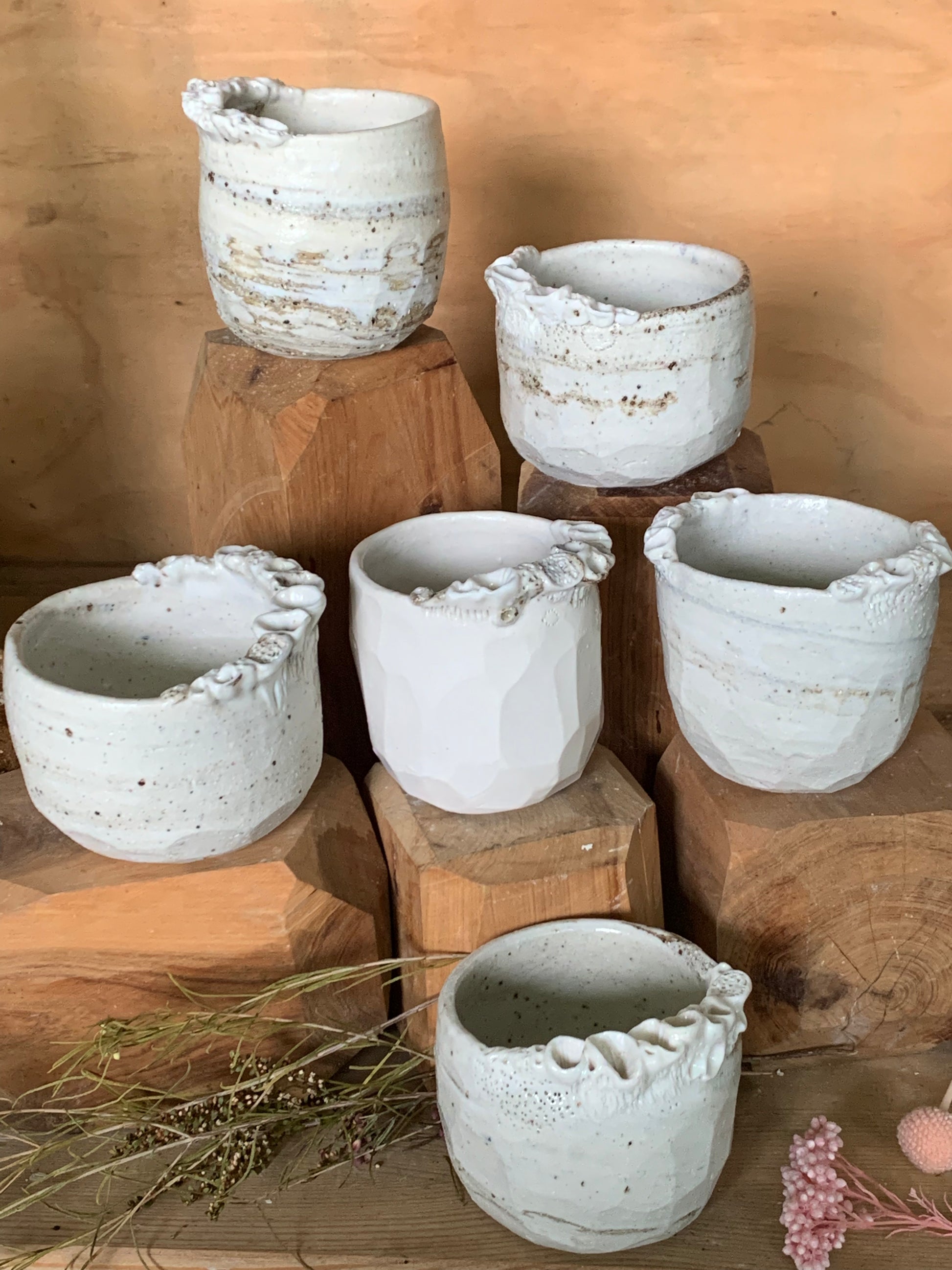 A one of a kind whee thrown and altered ‘coral’ hand textured cup, made by me in my home studio in castlemaine.