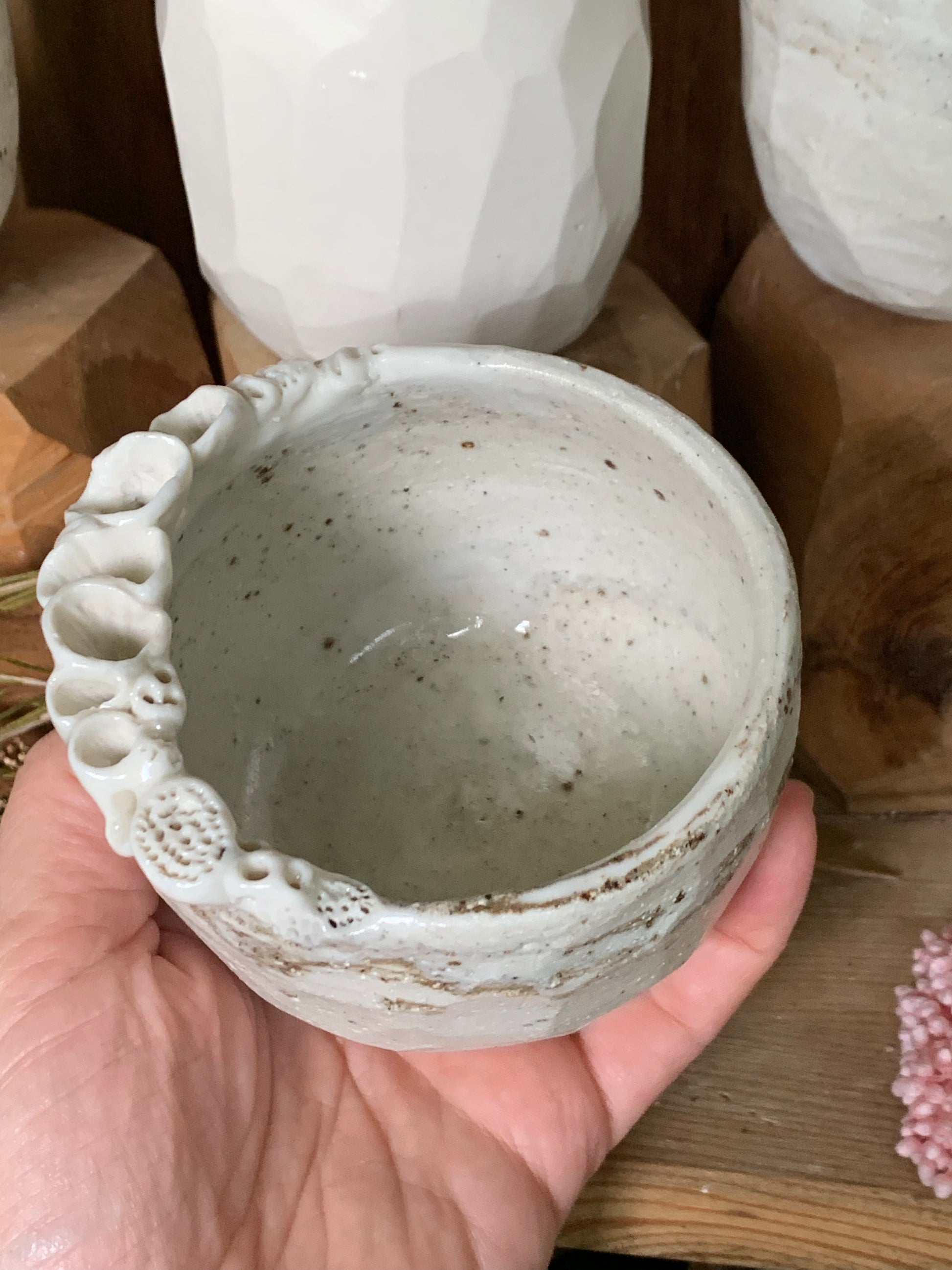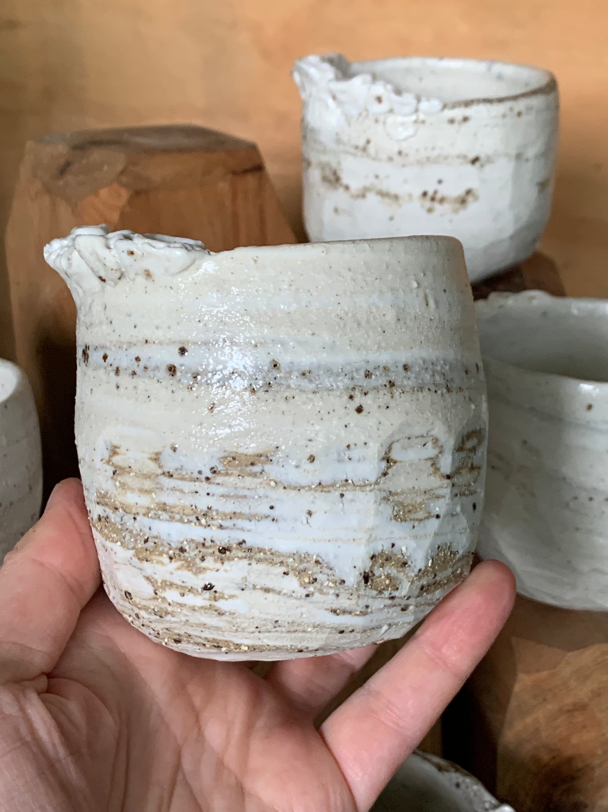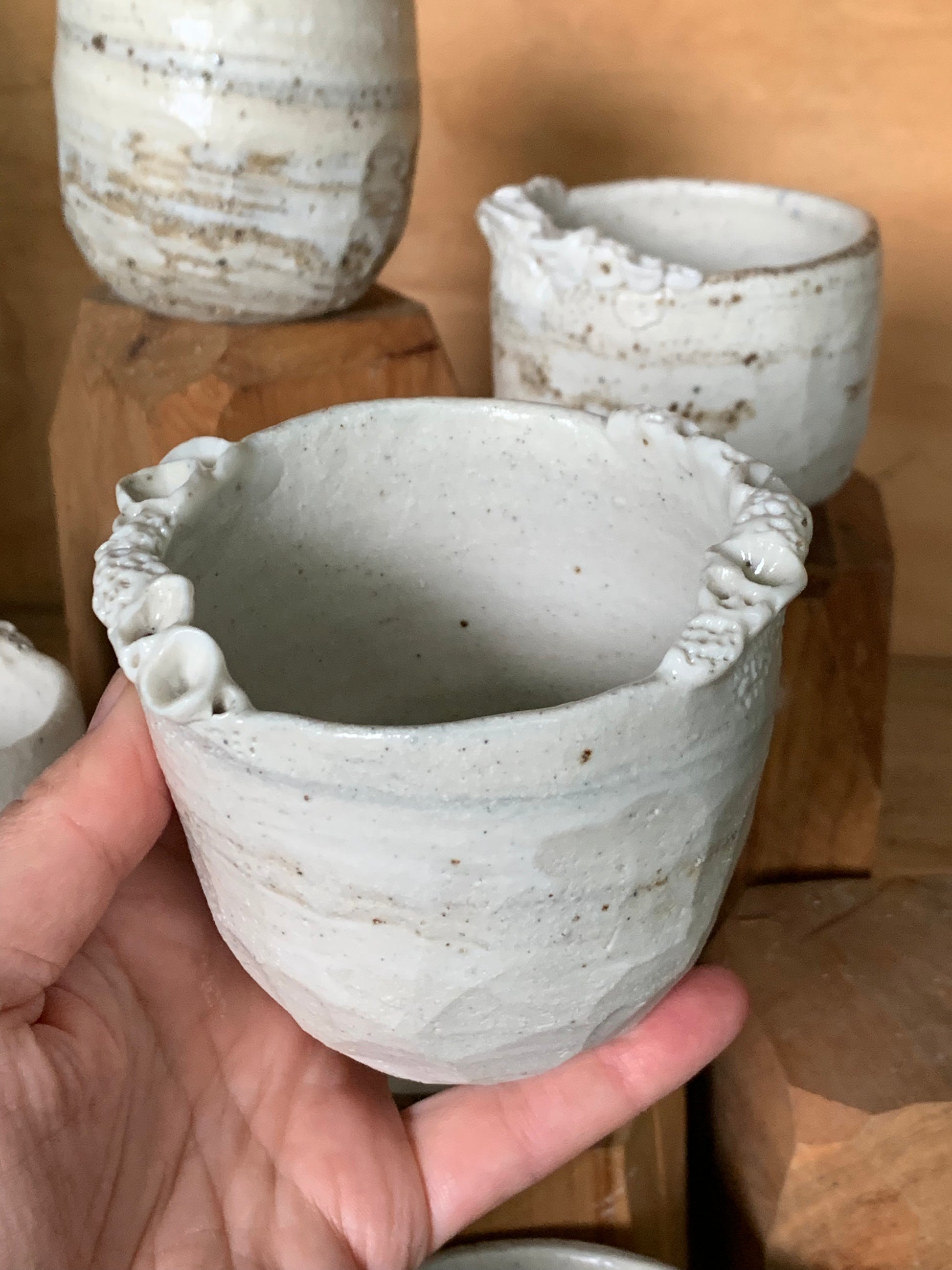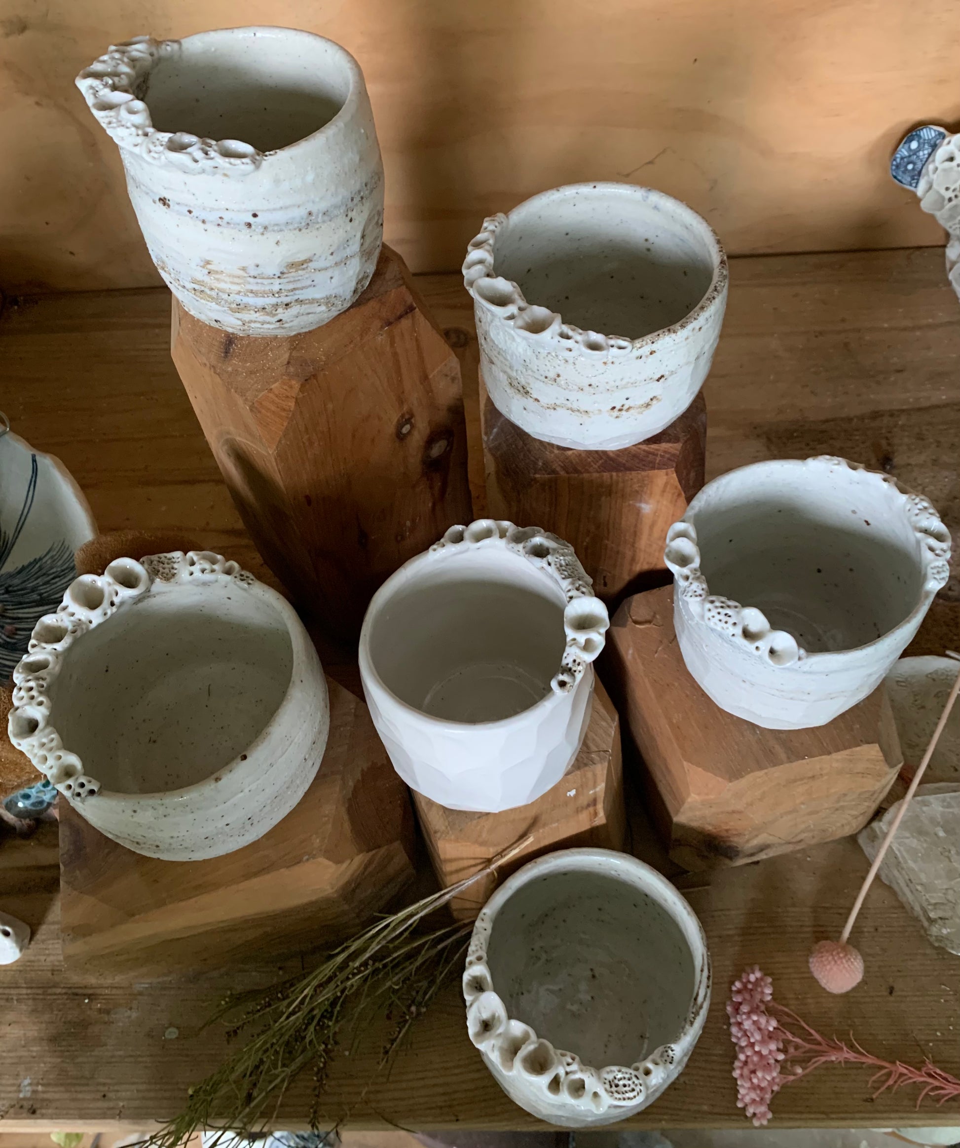 A one of a kind whee thrown and altered ‘coral’ hand textured cup, made by me in my home studio in castlemaine.