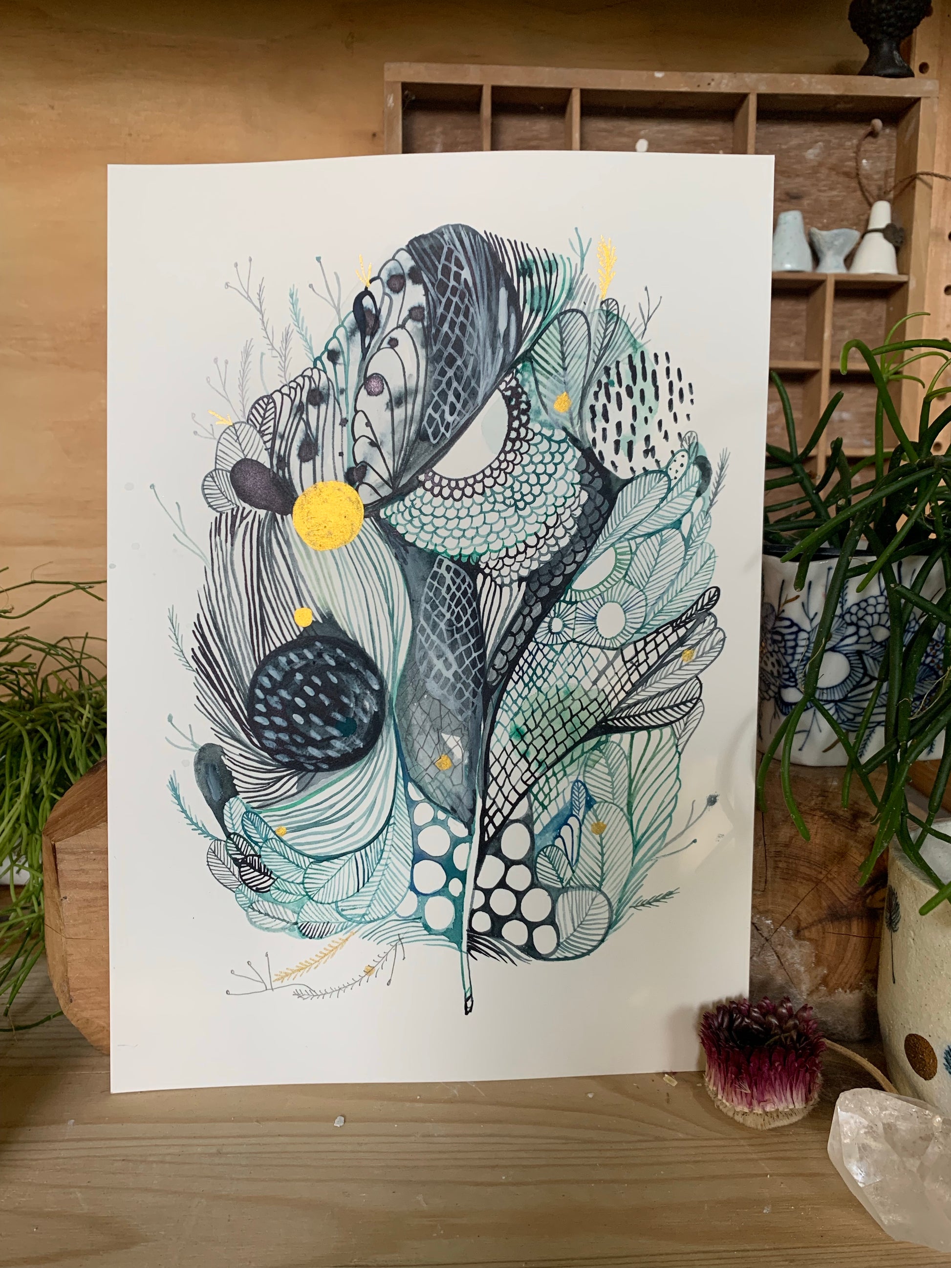 Watercolour and ink original drawing on Arches 100 % cotton, 300gsm hot pressed watercolour paper.