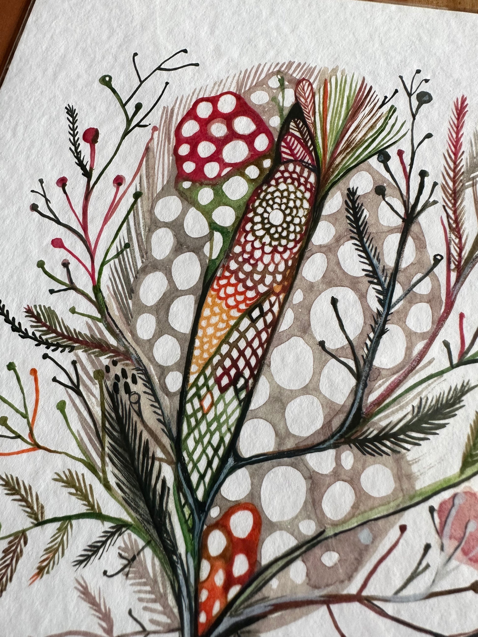 My drawings are inspired by pattern and texture found in natural objects. I love beach combing and examining things that wash up- or looking at the shapes and colours of bones found bleached in the bush. I create my own odd 'imaginary' beings, which have elements shapes and textures from both from sea and land creatures.