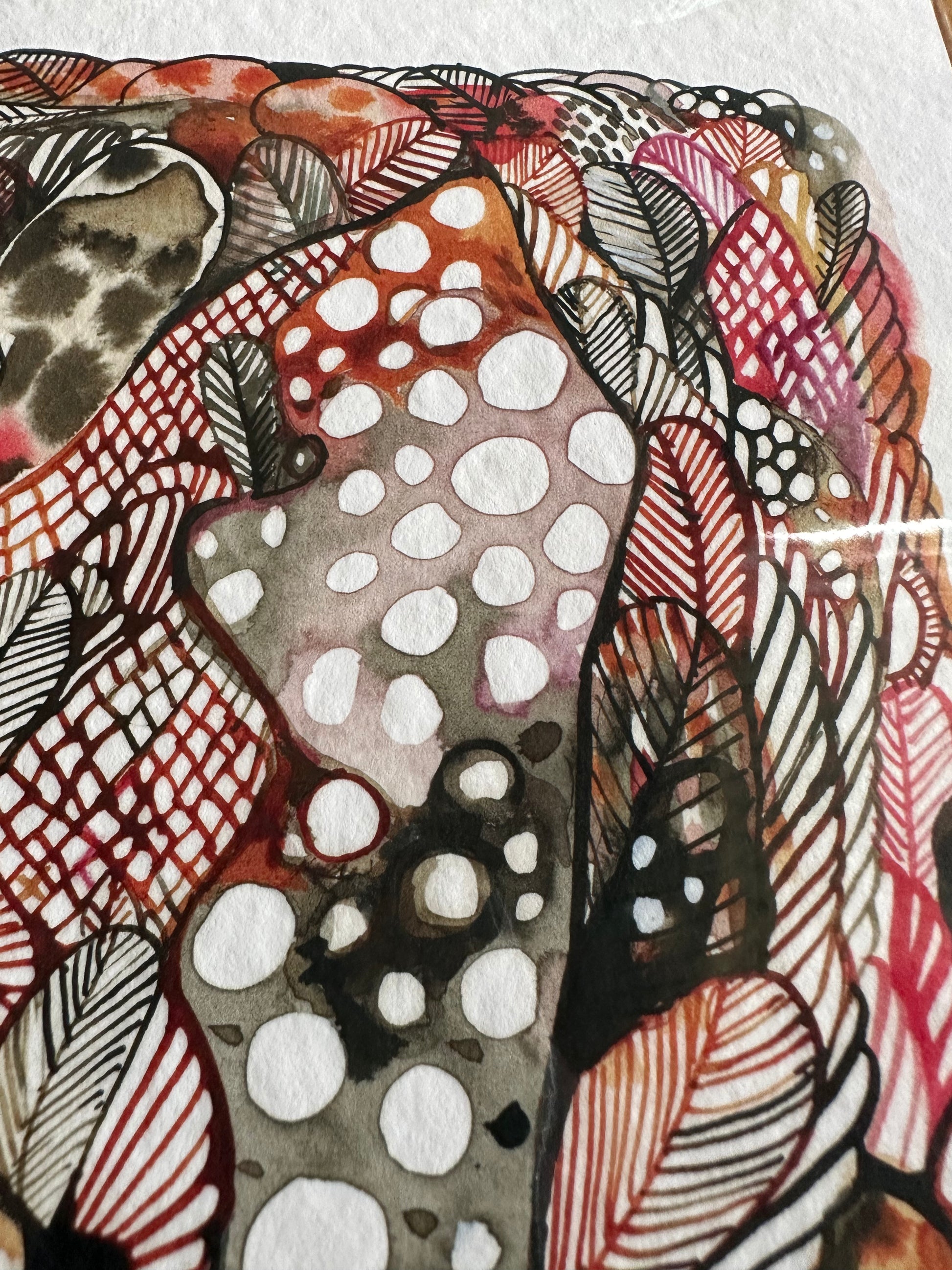My drawings are inspired by pattern and texture found in natural objects. I love beach combing and examining things that wash up- or looking at the shapes and colours of bones found bleached in the bush. I create my own odd 'imaginary' beings, which have elements shapes and textures from both from sea and land creatures.