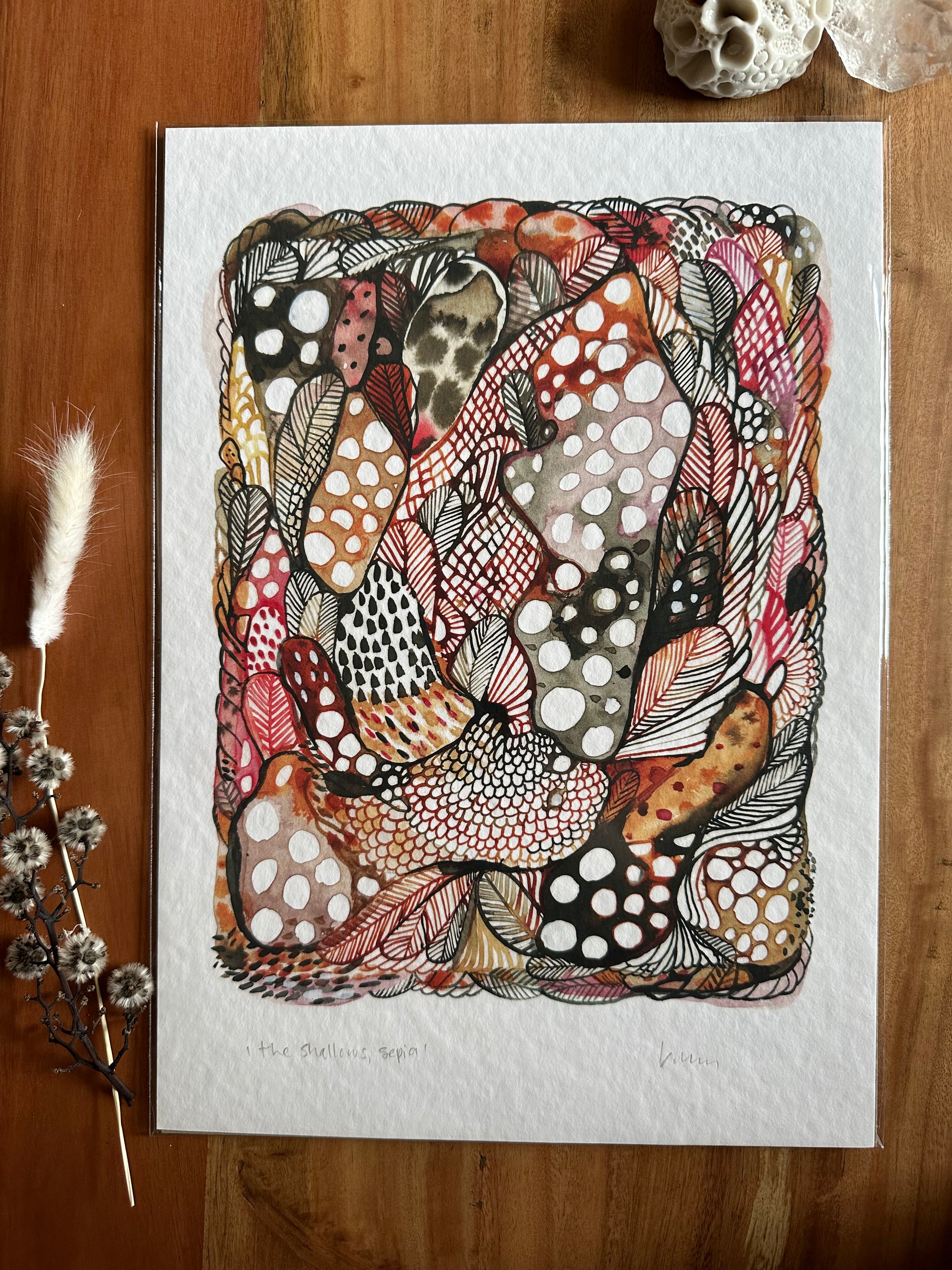 ‘The shallows, sepia’ An A5, A4 standard sized, archival, high quality Giclee print of my original pen and ink / brush and ink drawing.