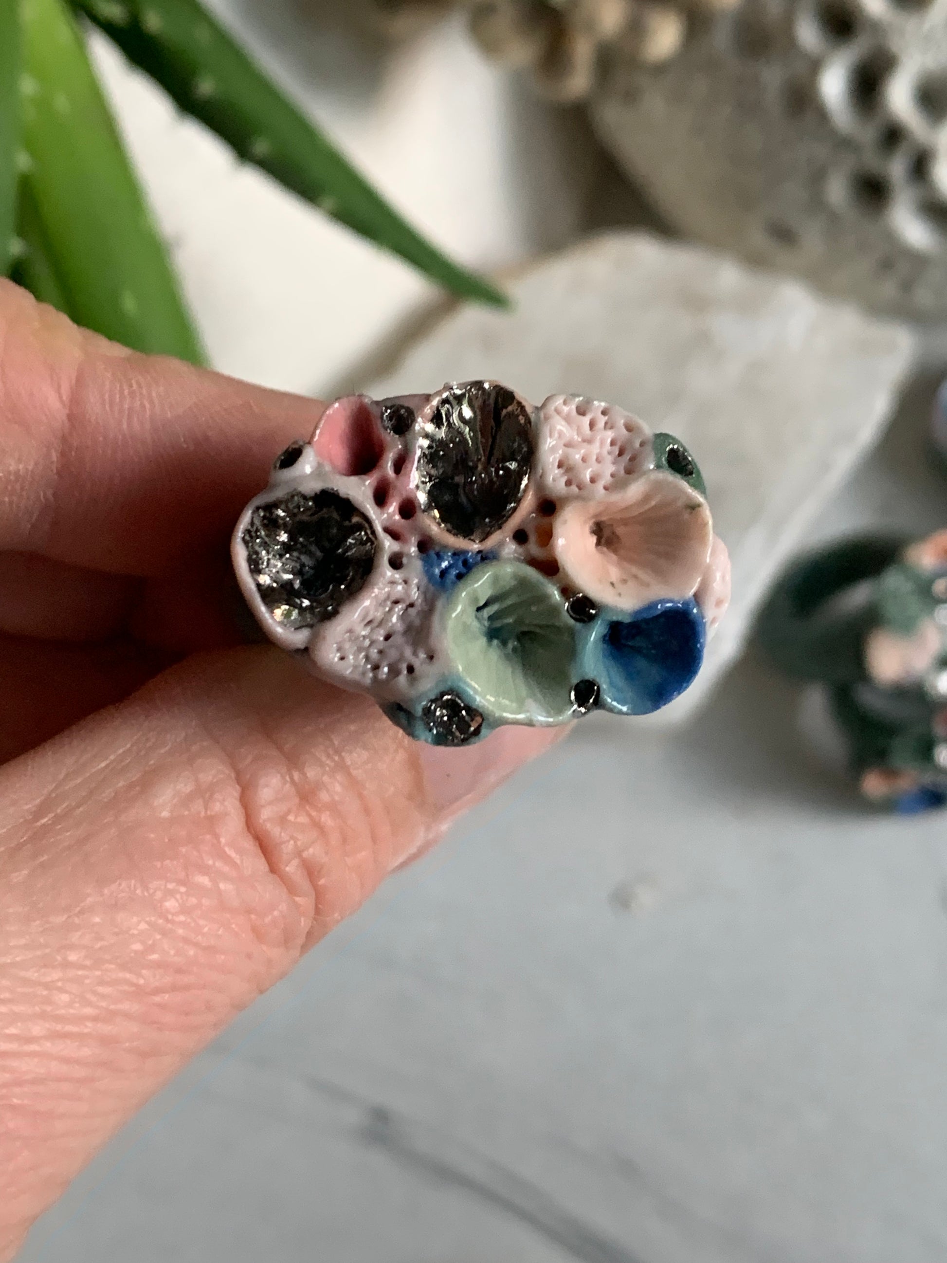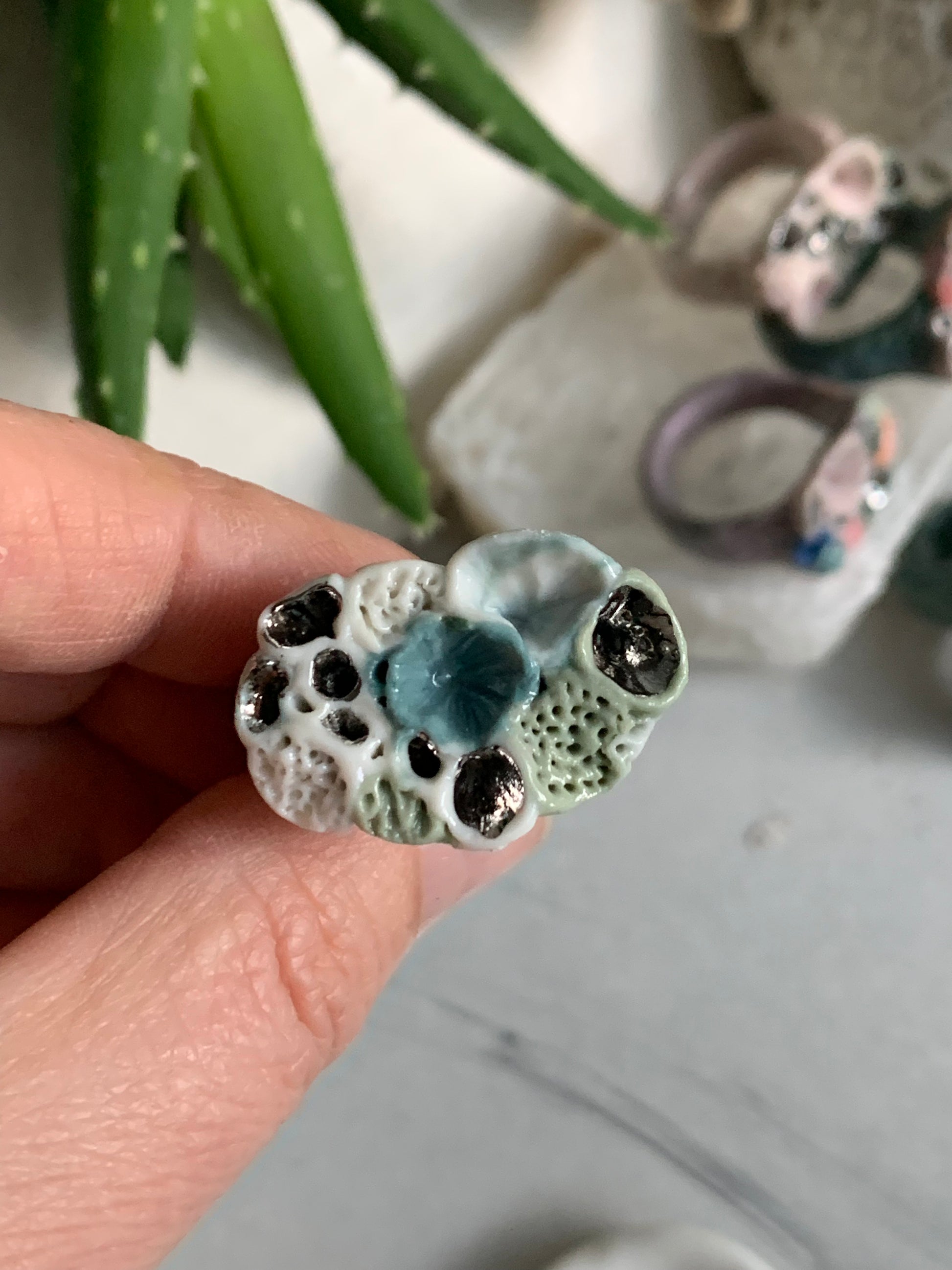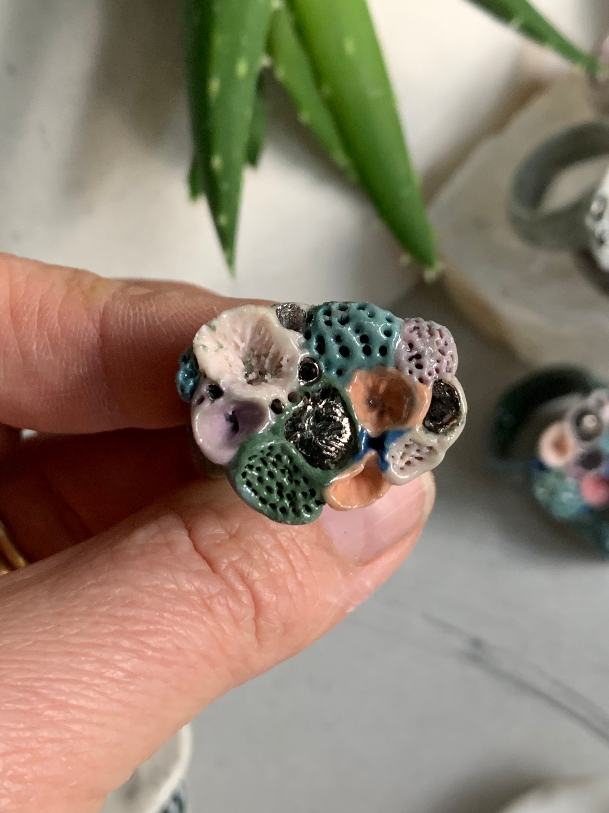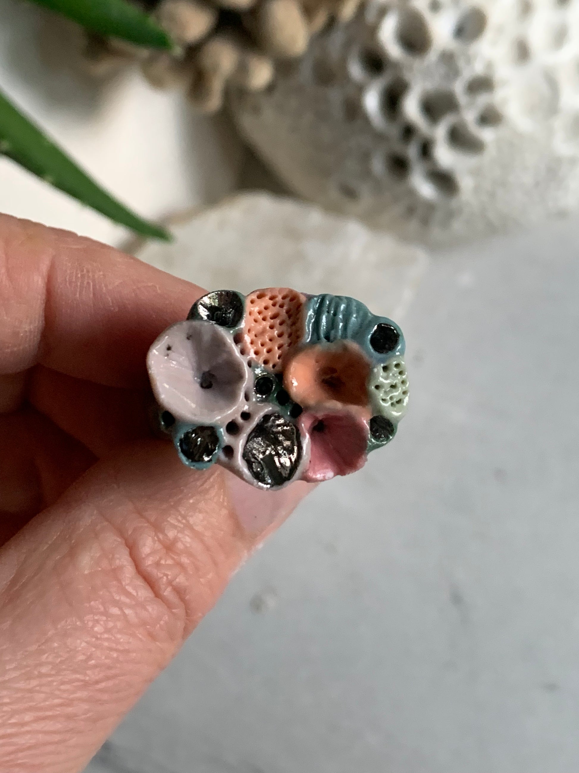 This is a one off handmade ring made by Katherine in her home studio in Castlemaine, Victoria. One 'Rock coral’ hand formed and textured porcelain ring, painted with watercolour style detail. These rings are inspired by beach combing and collecting and looking at treasures along the shoreline and in rock pools. Mimicking the shapes and textures of coral and shell.