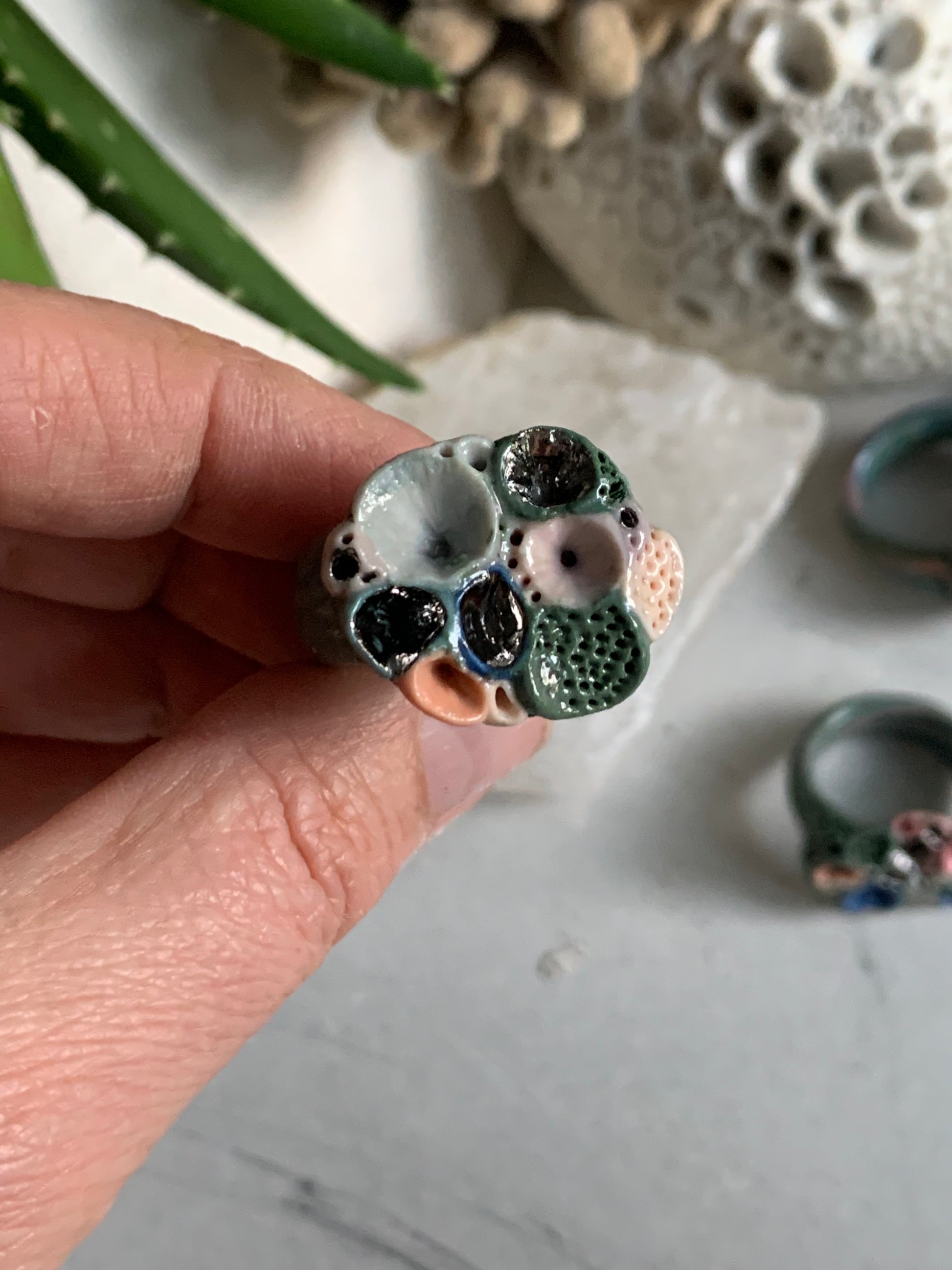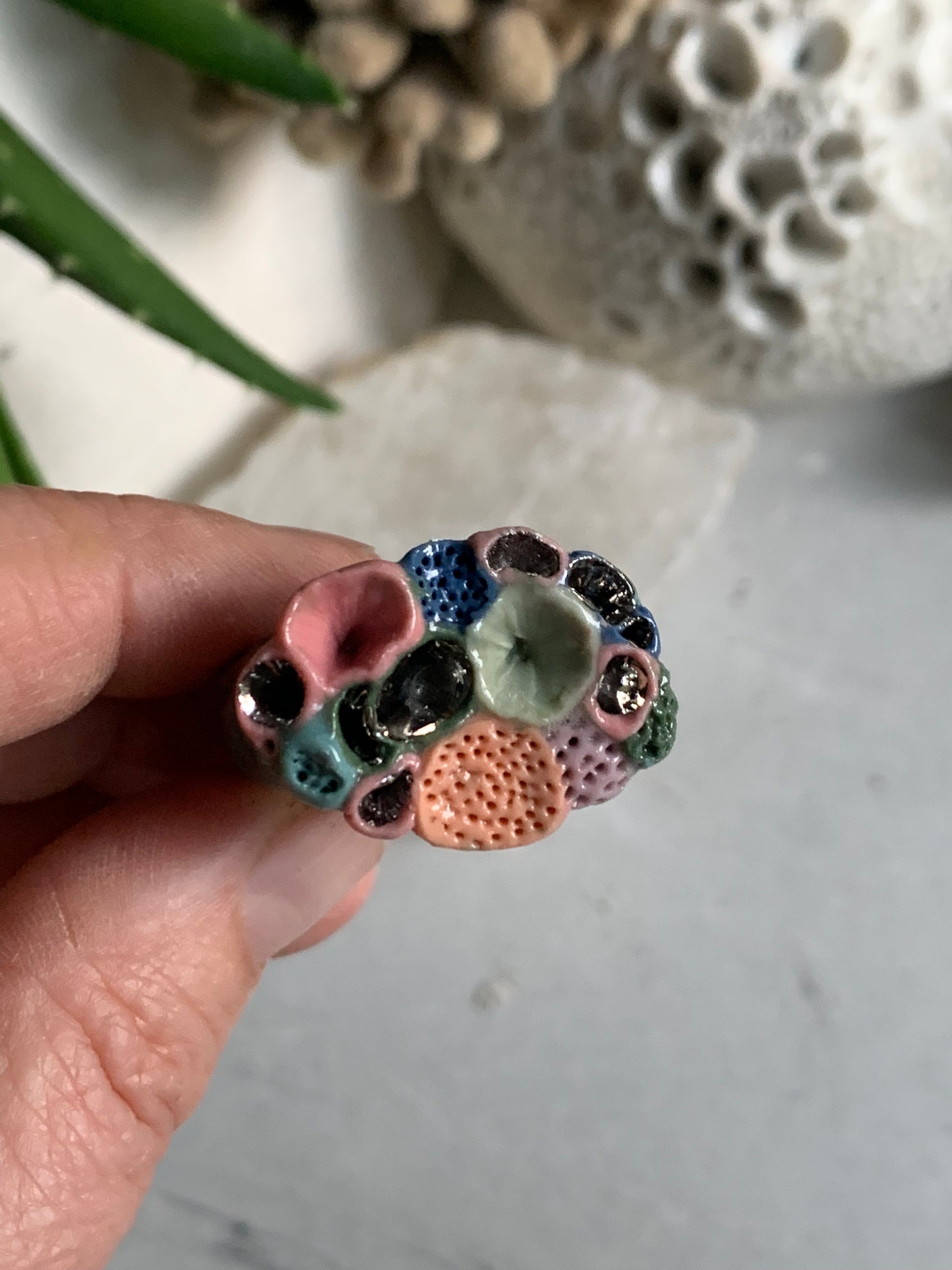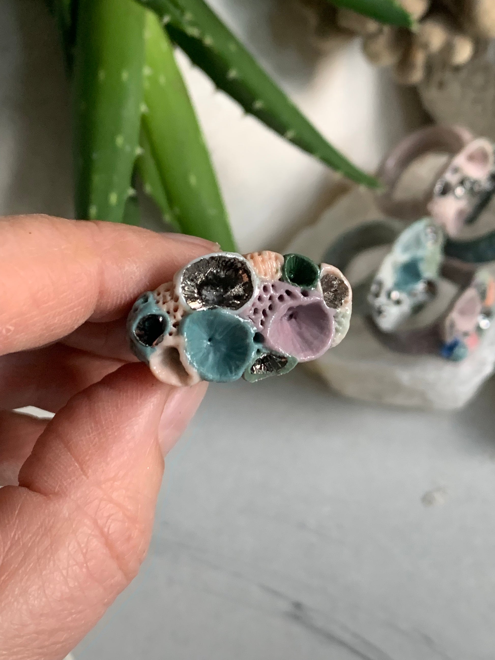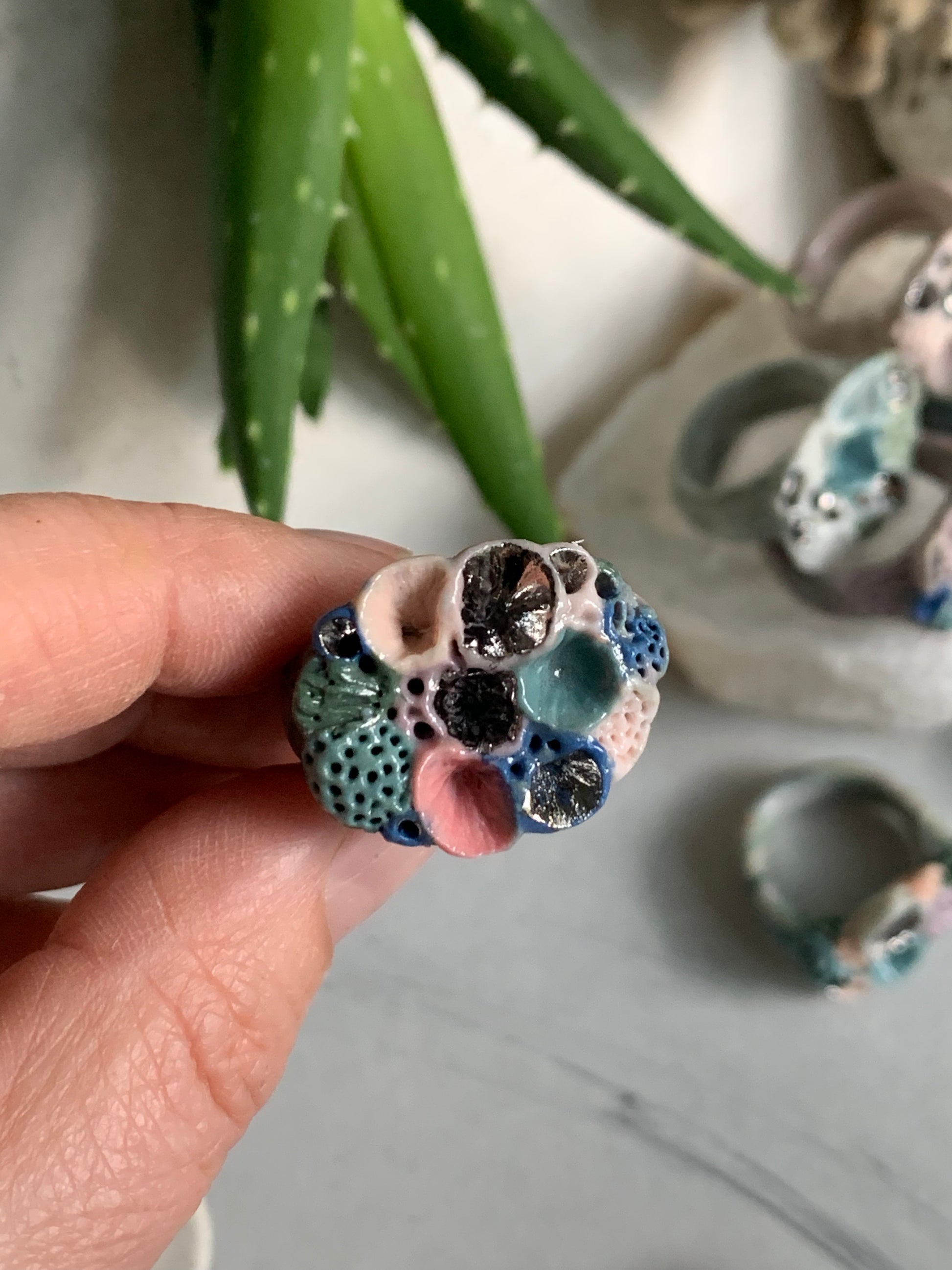 This is a one off handmade ring made by Katherine in her home studio in Castlemaine, Victoria. One 'Rock coral’ hand formed and textured porcelain ring, painted with watercolour style detail. These rings are inspired by beach combing and collecting and looking at treasures along the shoreline and in rock pools. Mimicking the shapes and textures of coral and shell.