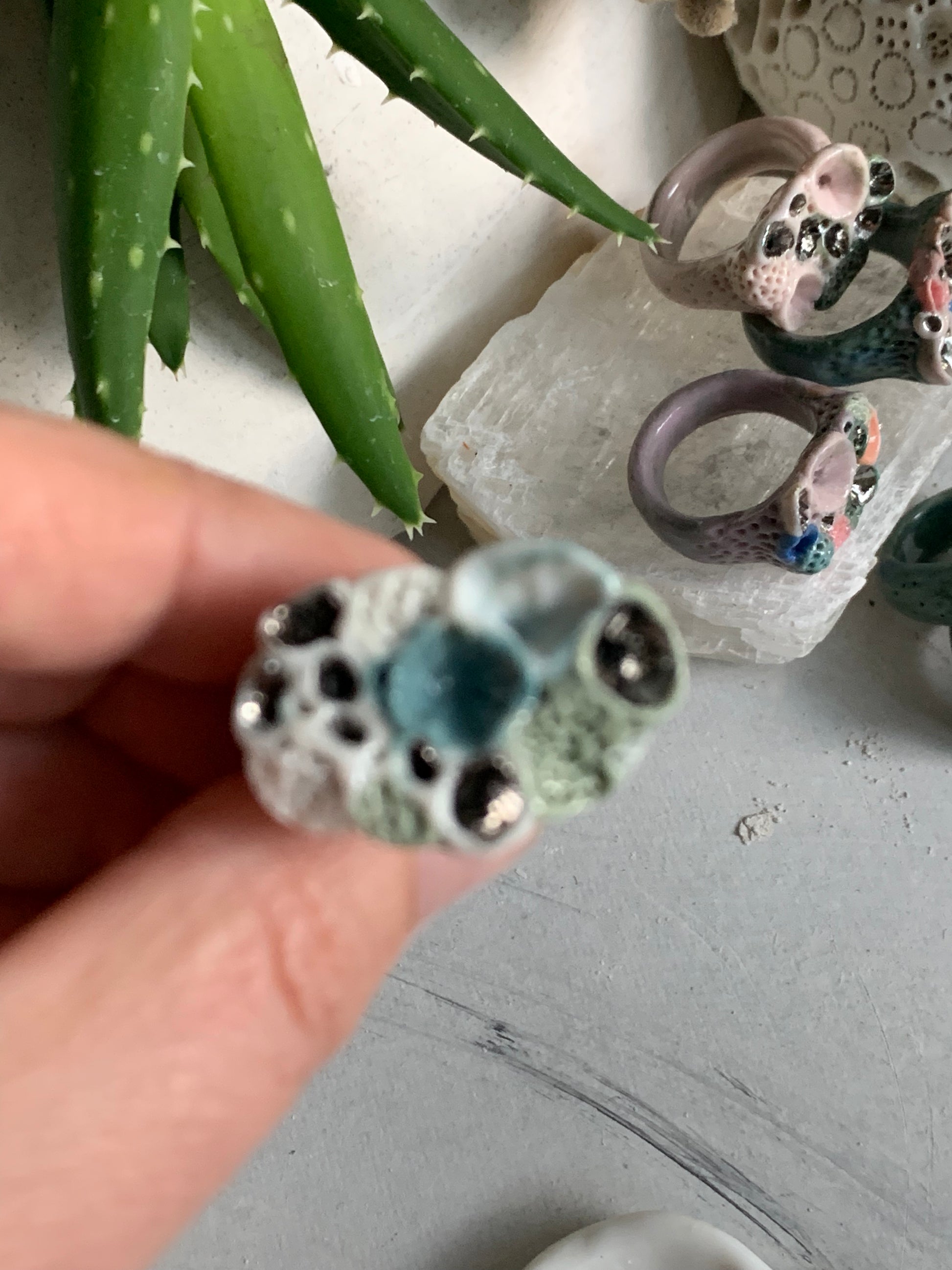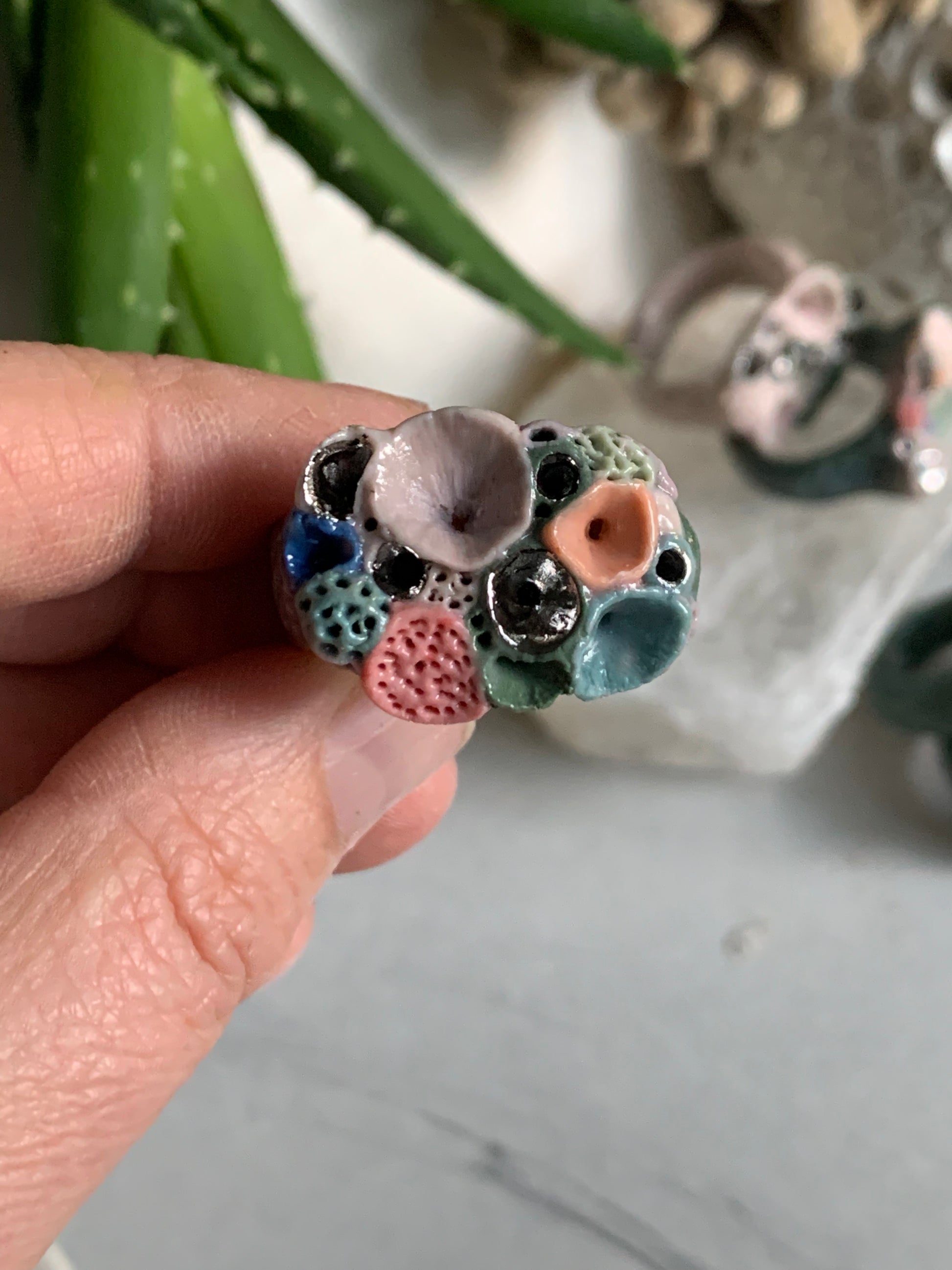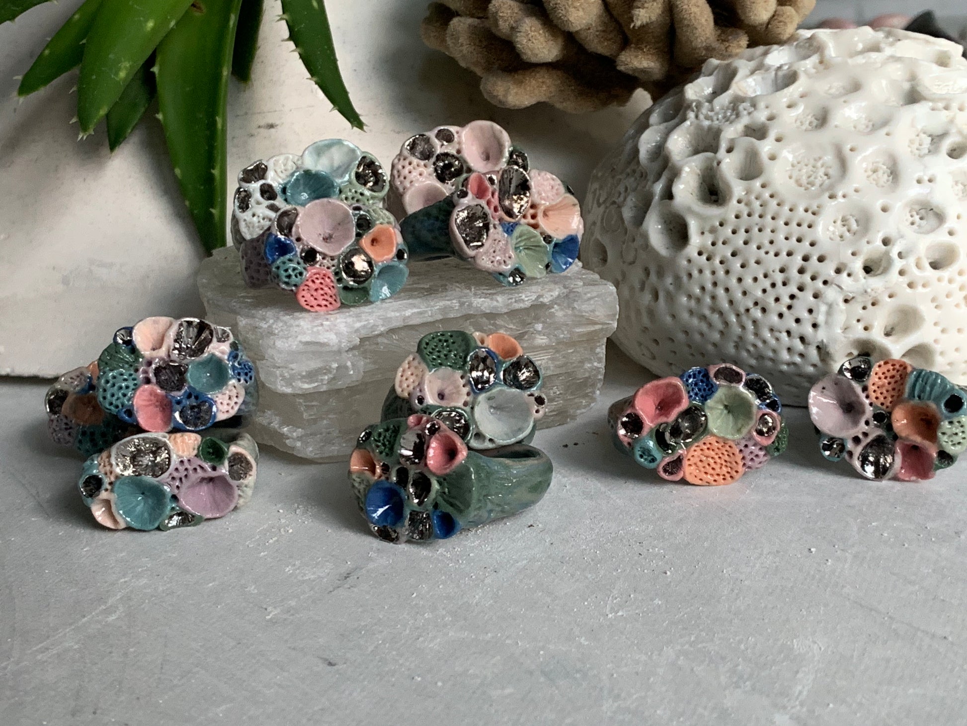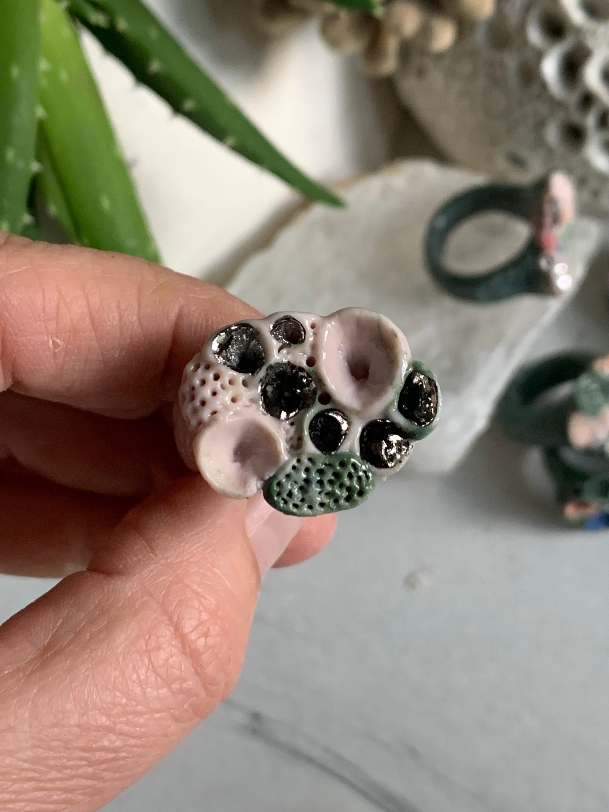 This is a one off handmade ring made by Katherine in her home studio in Castlemaine, Victoria. One 'Rock coral’ hand formed and textured porcelain ring, painted with watercolour style detail. These rings are inspired by beach combing and collecting and looking at treasures along the shoreline and in rock pools. Mimicking the shapes and textures of coral and shell.