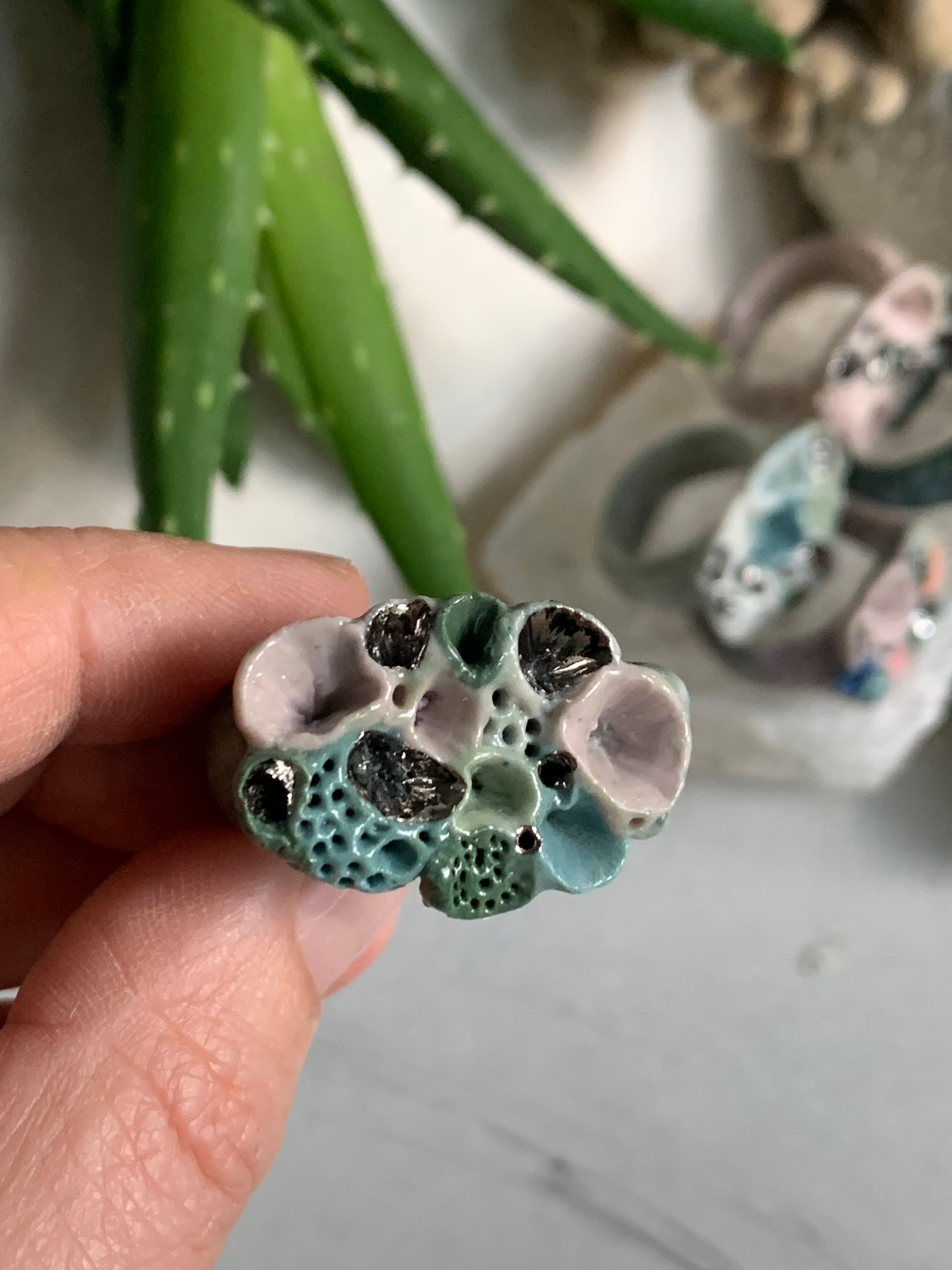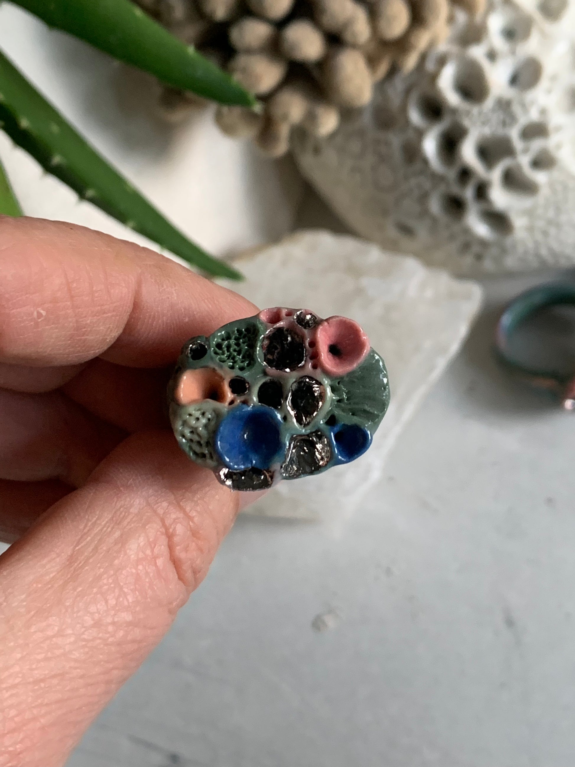 Green tones porcelain ‘rock coral’ ring with platinum detail- larger sizes. choose a size