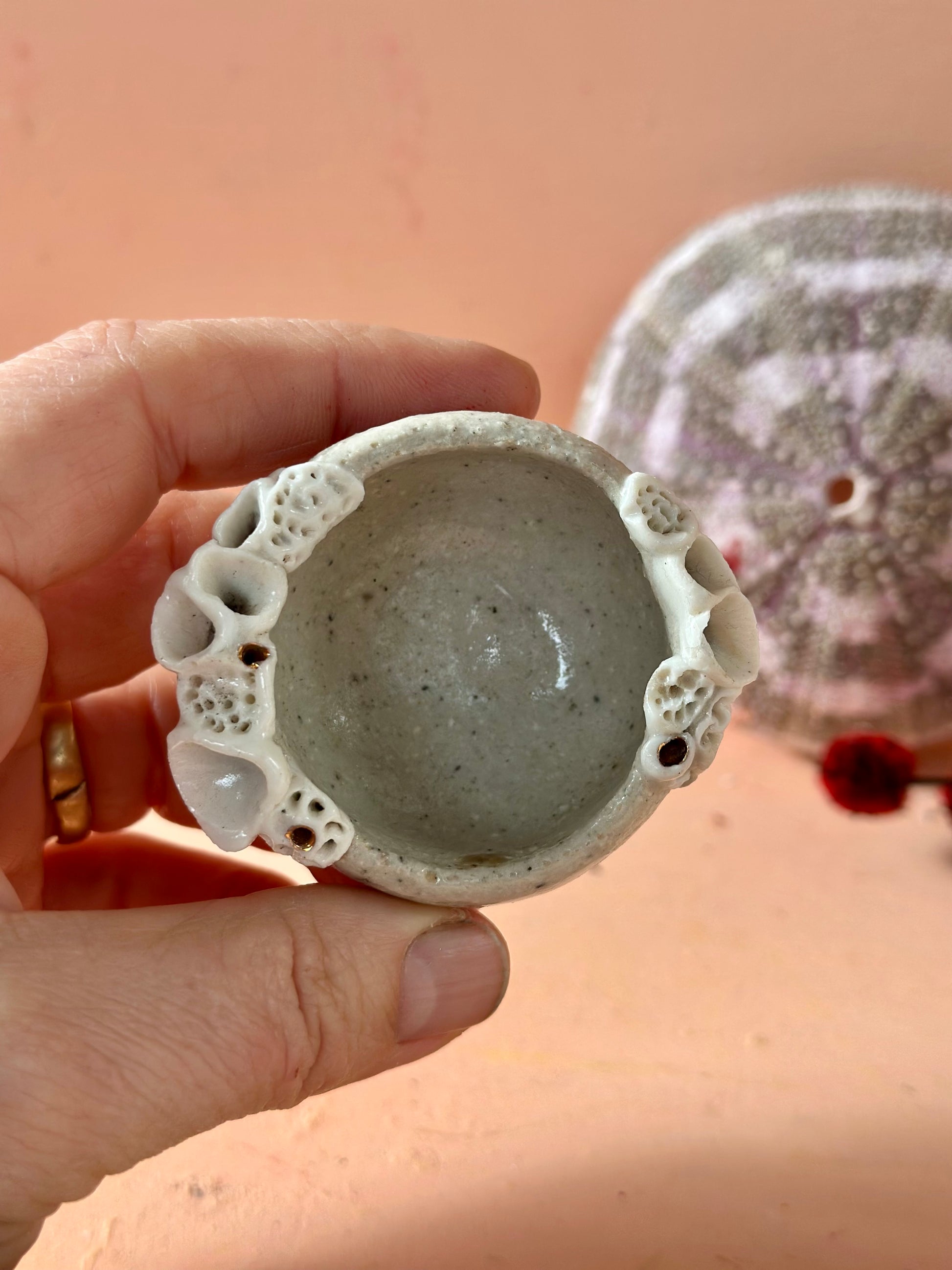 The piece is glazed on the inside, with gold lustre details, and matte outside.