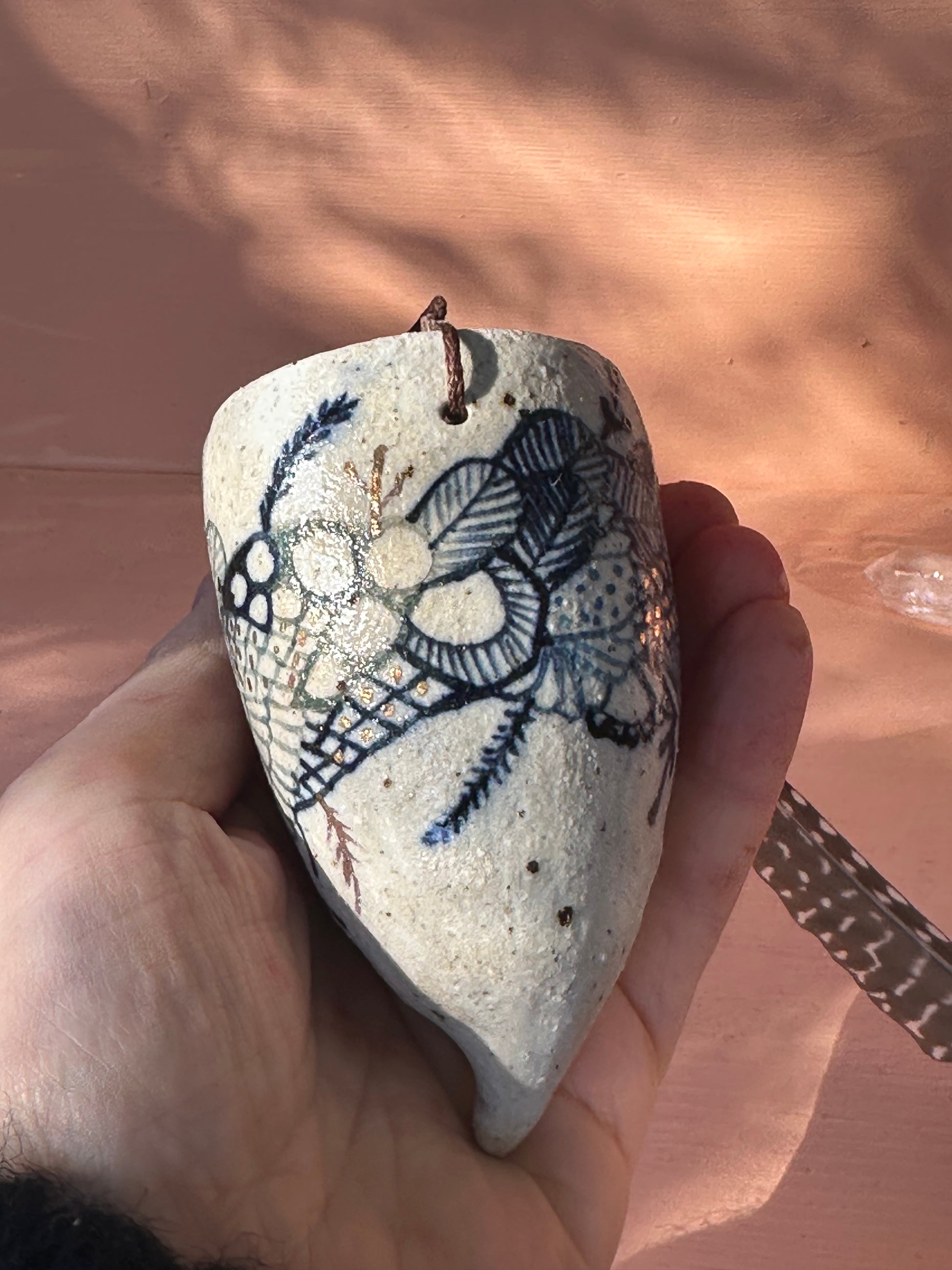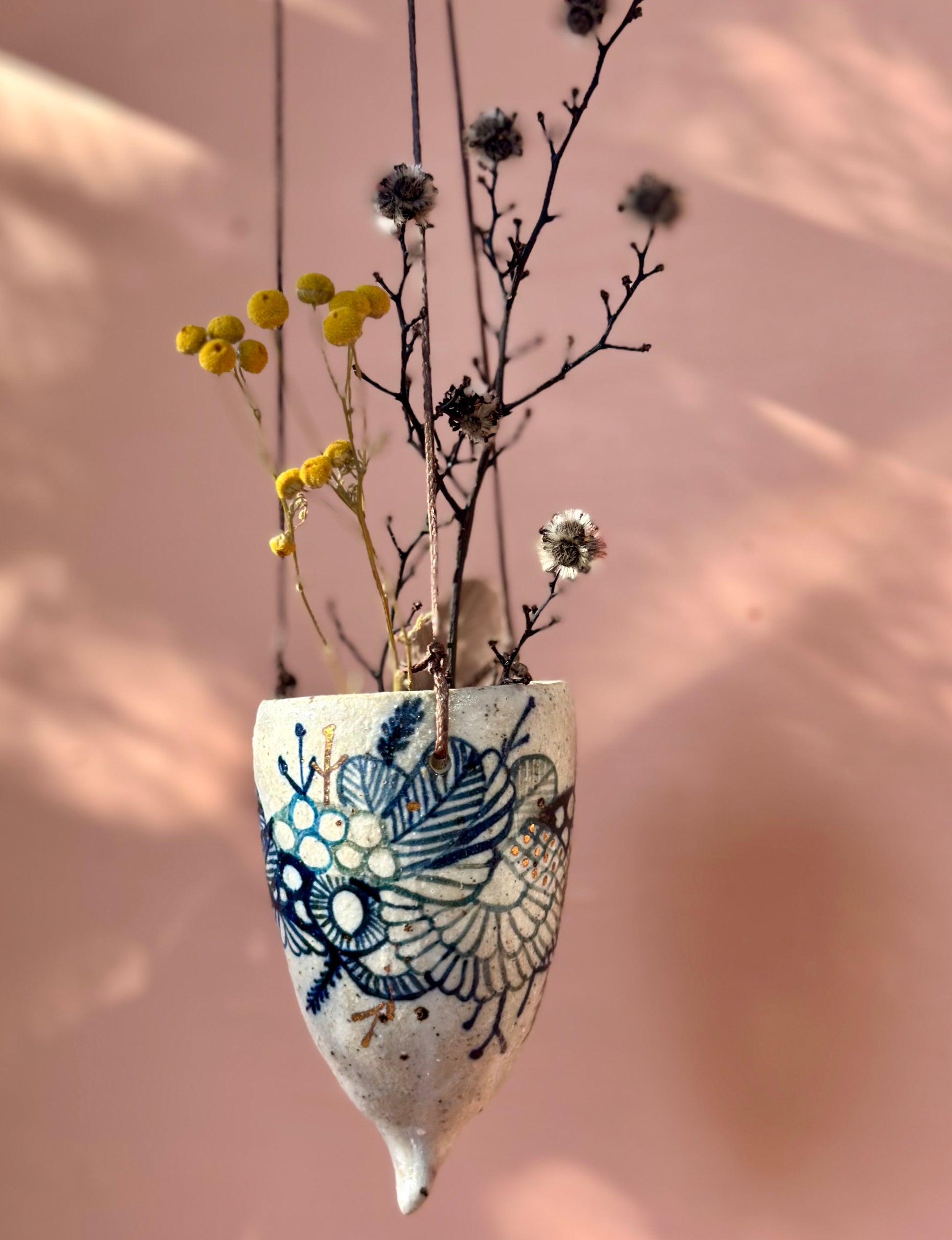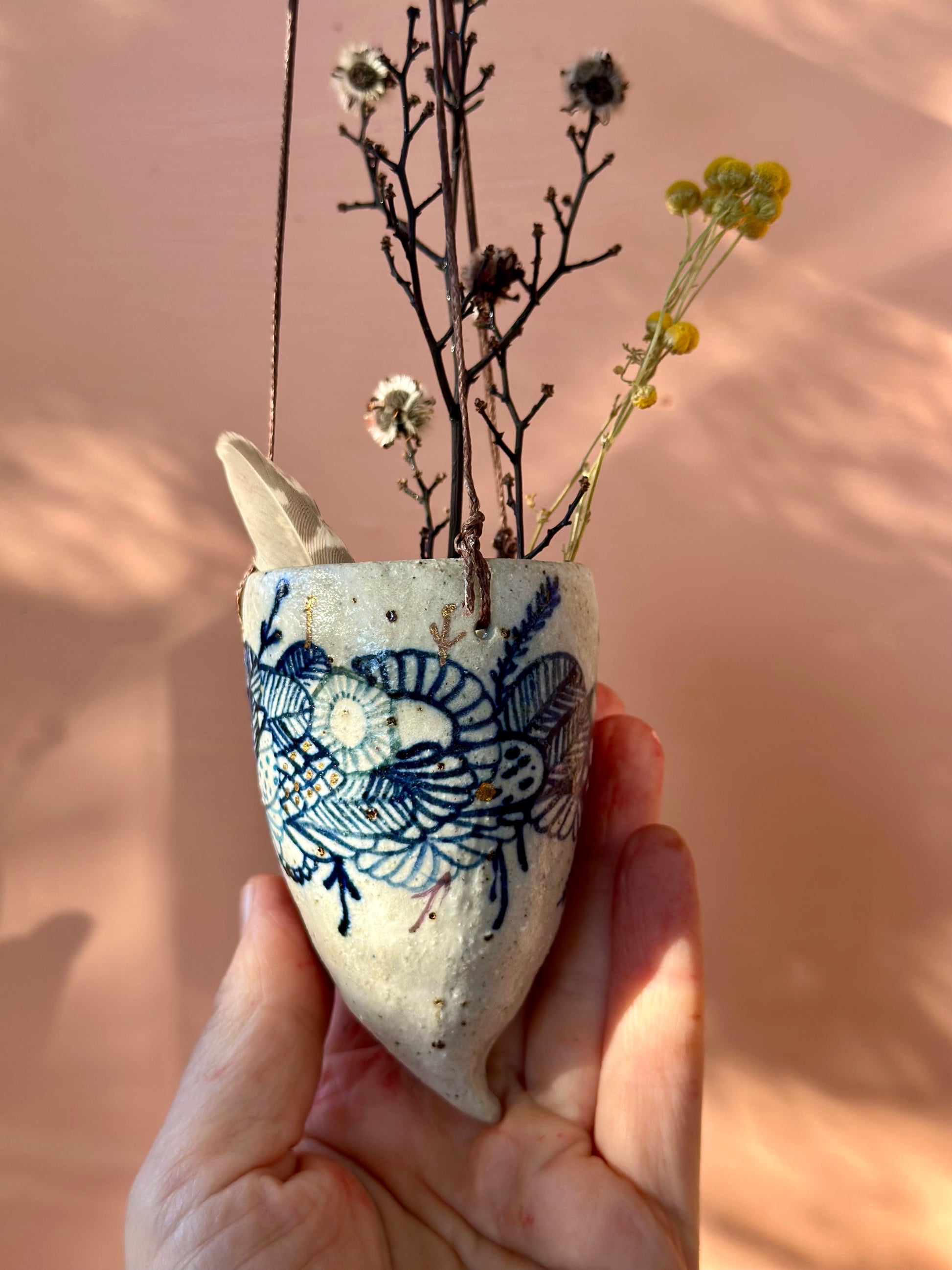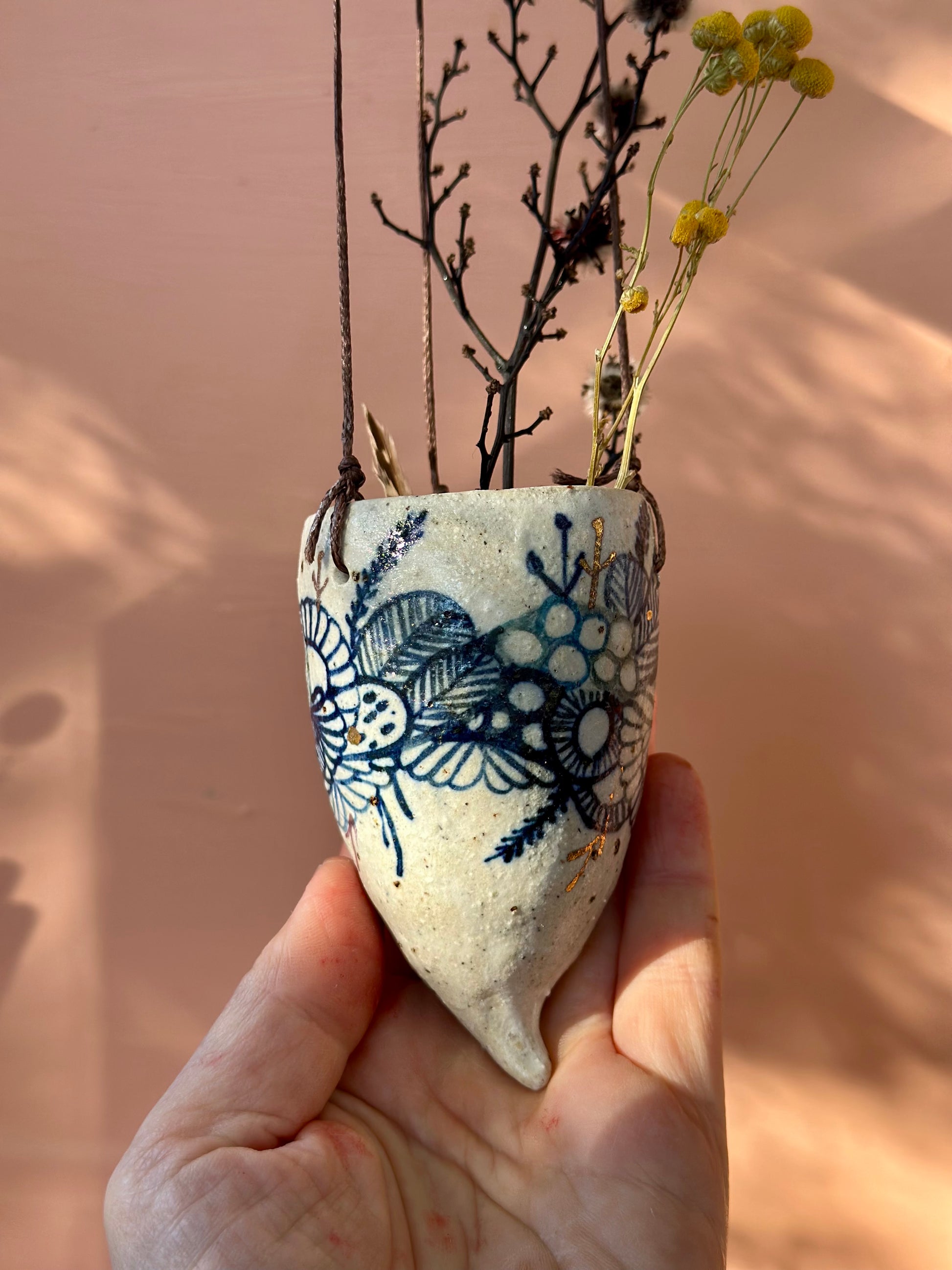 A one of a kind hand painted hanging vase for dried flowers / feathers / twigs etc. Hand made by katherine in her home studio in castlemaine, central Vic. These small hanging pods hang from a strong waxed thread.