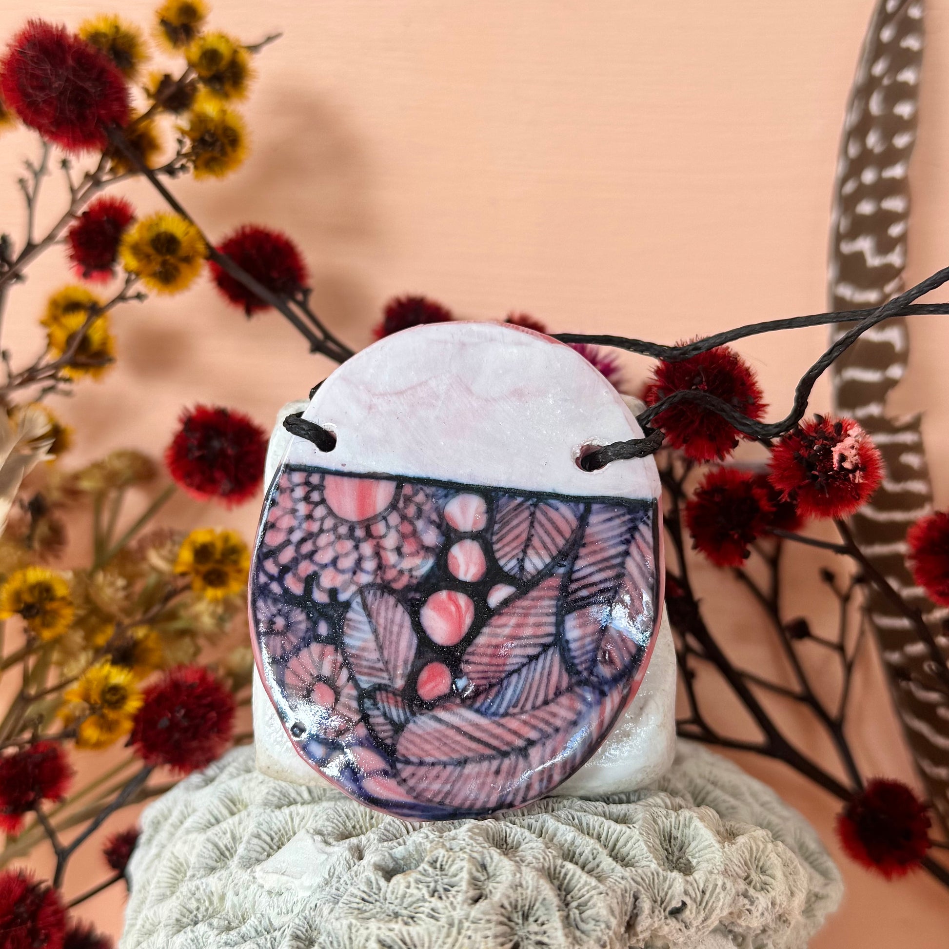 The illustration is inspired by feathers and patterns and textures found in nature. The pendant hangs on black waxed thread.