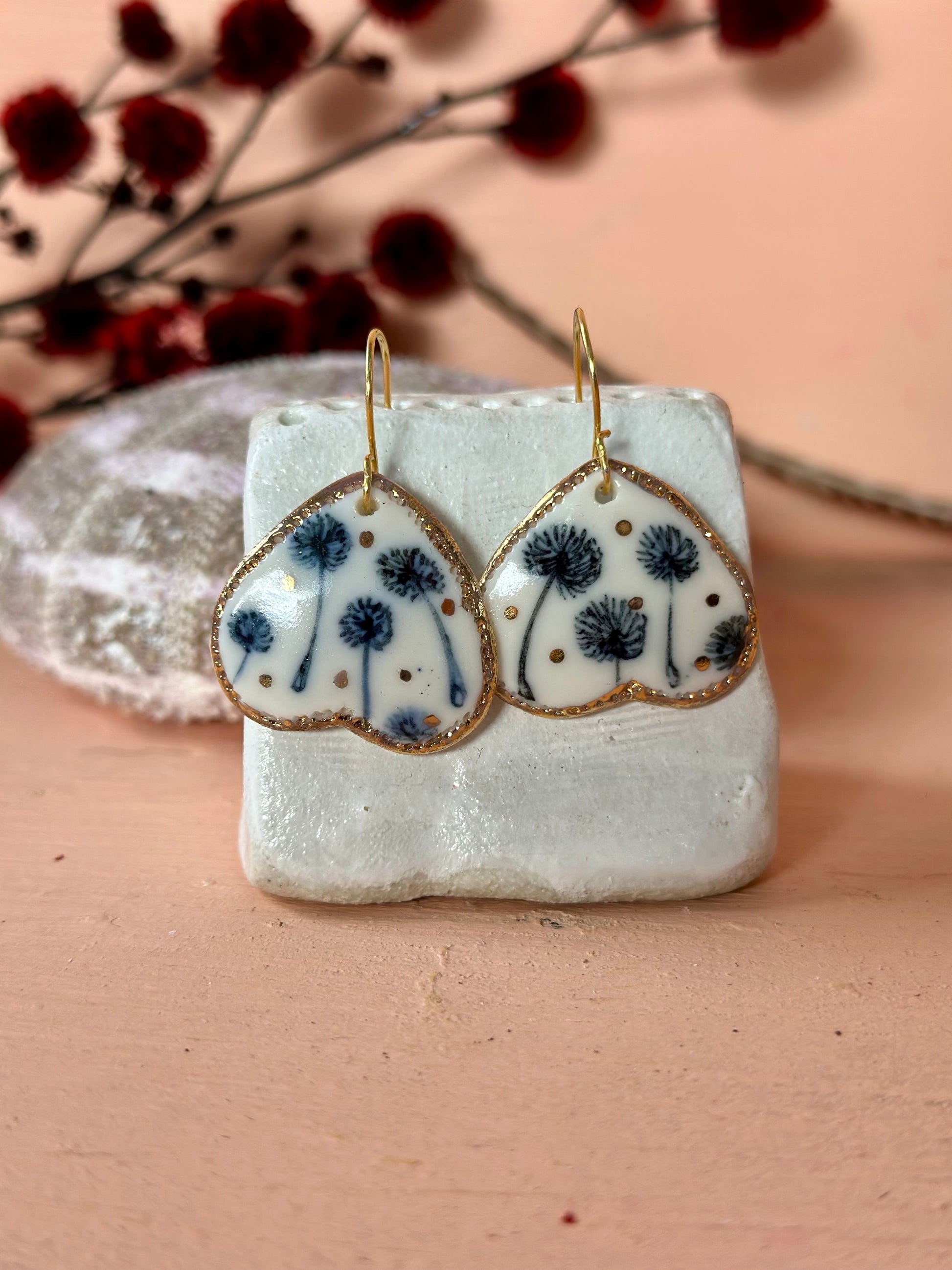 Hand Painted Dandelion Porcelain Earrings with gold dots