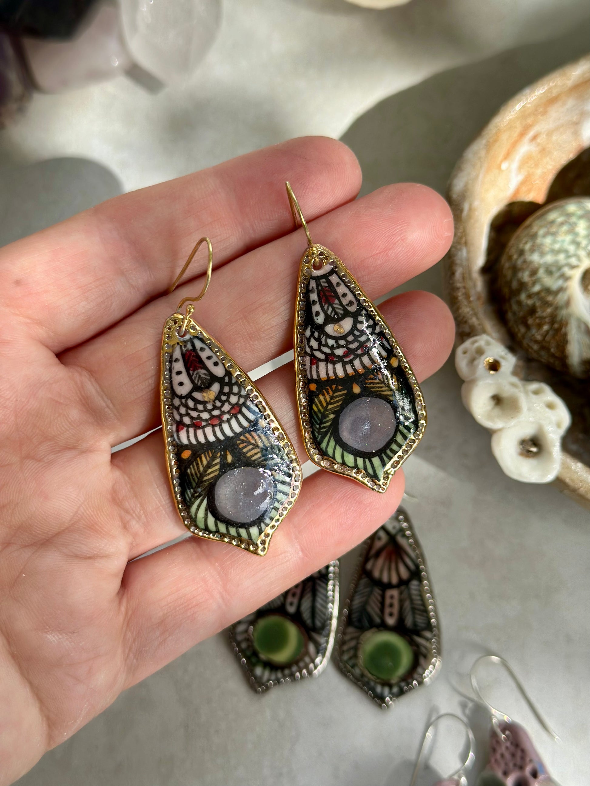 A pair of one of a kind hand painted porcelain earrings with gold lustre detail, and gold plated sterling silver hooks.