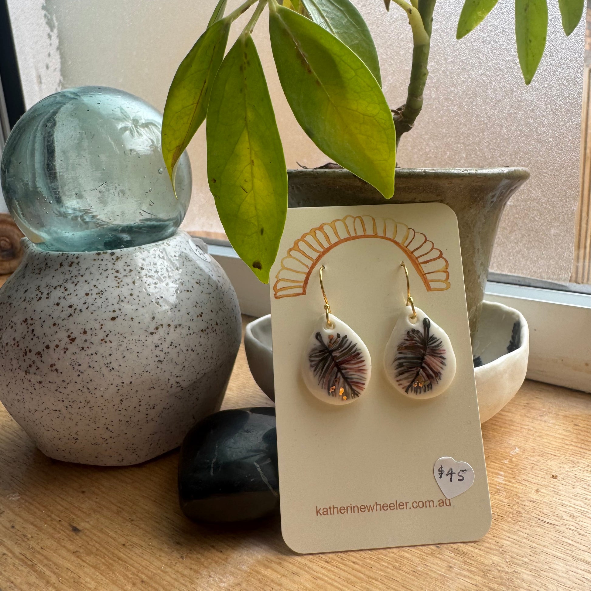 These fun earrings are individually painted in ‘feather’ design, and high fired.