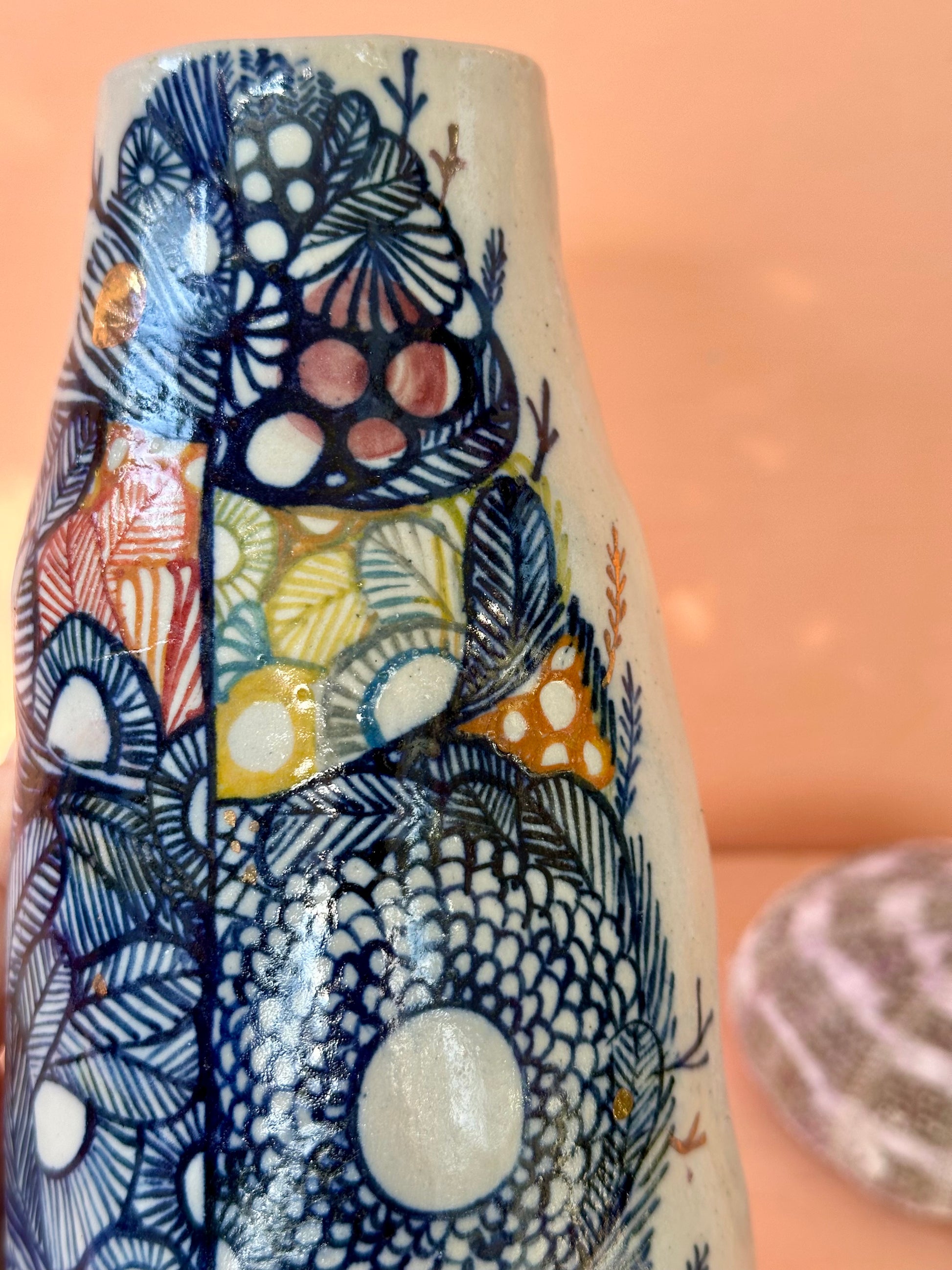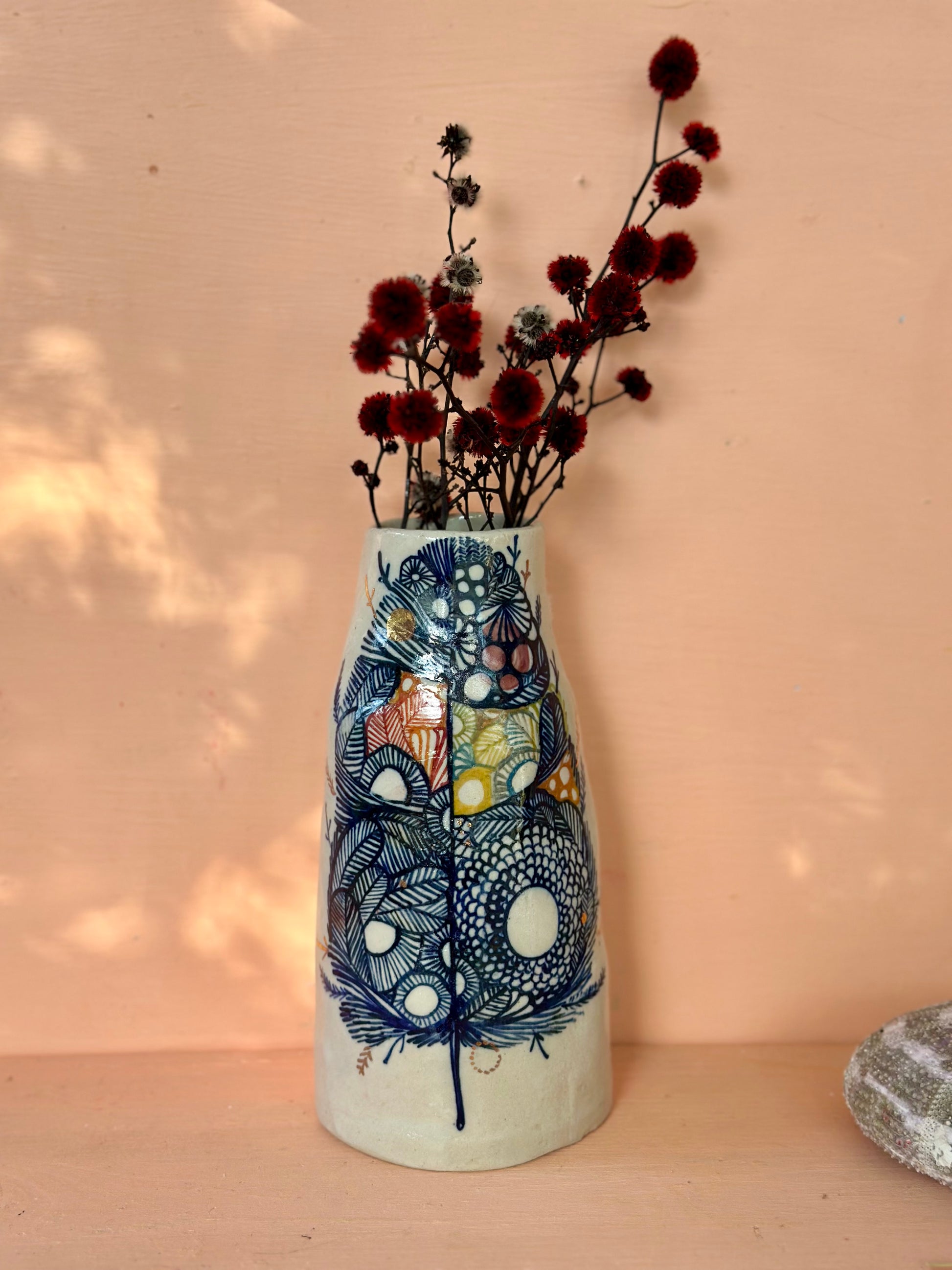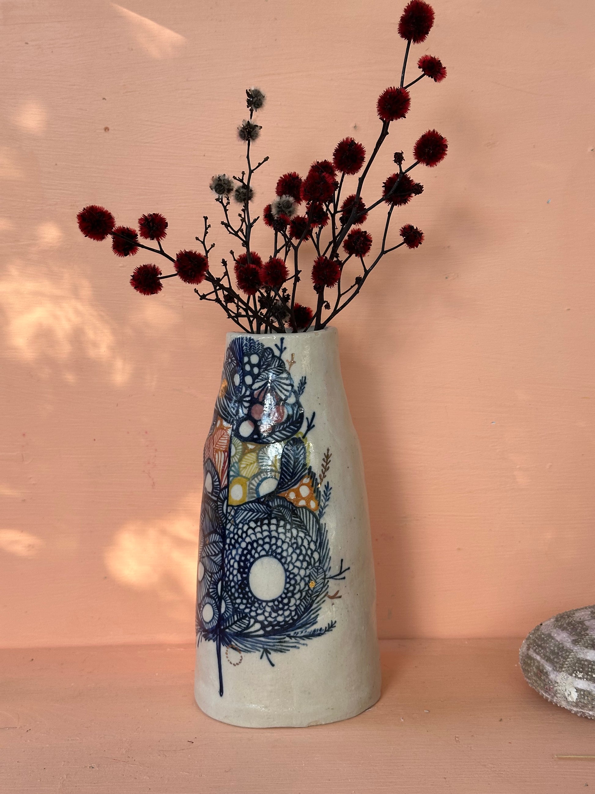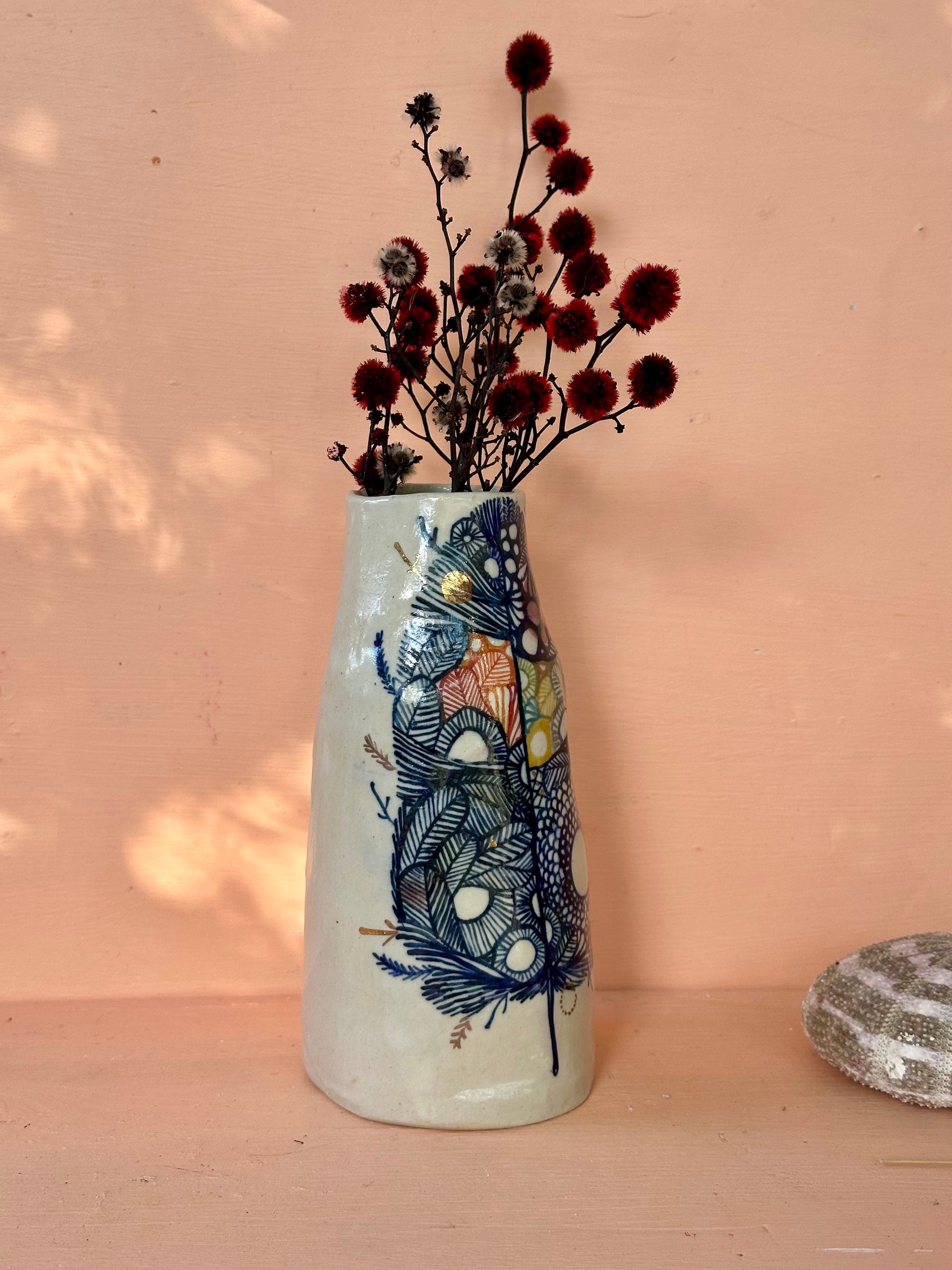 A one of a kind hand formed and hand painted porcelain vase, made by katherine in her home studio in castlemaine, central Vic.