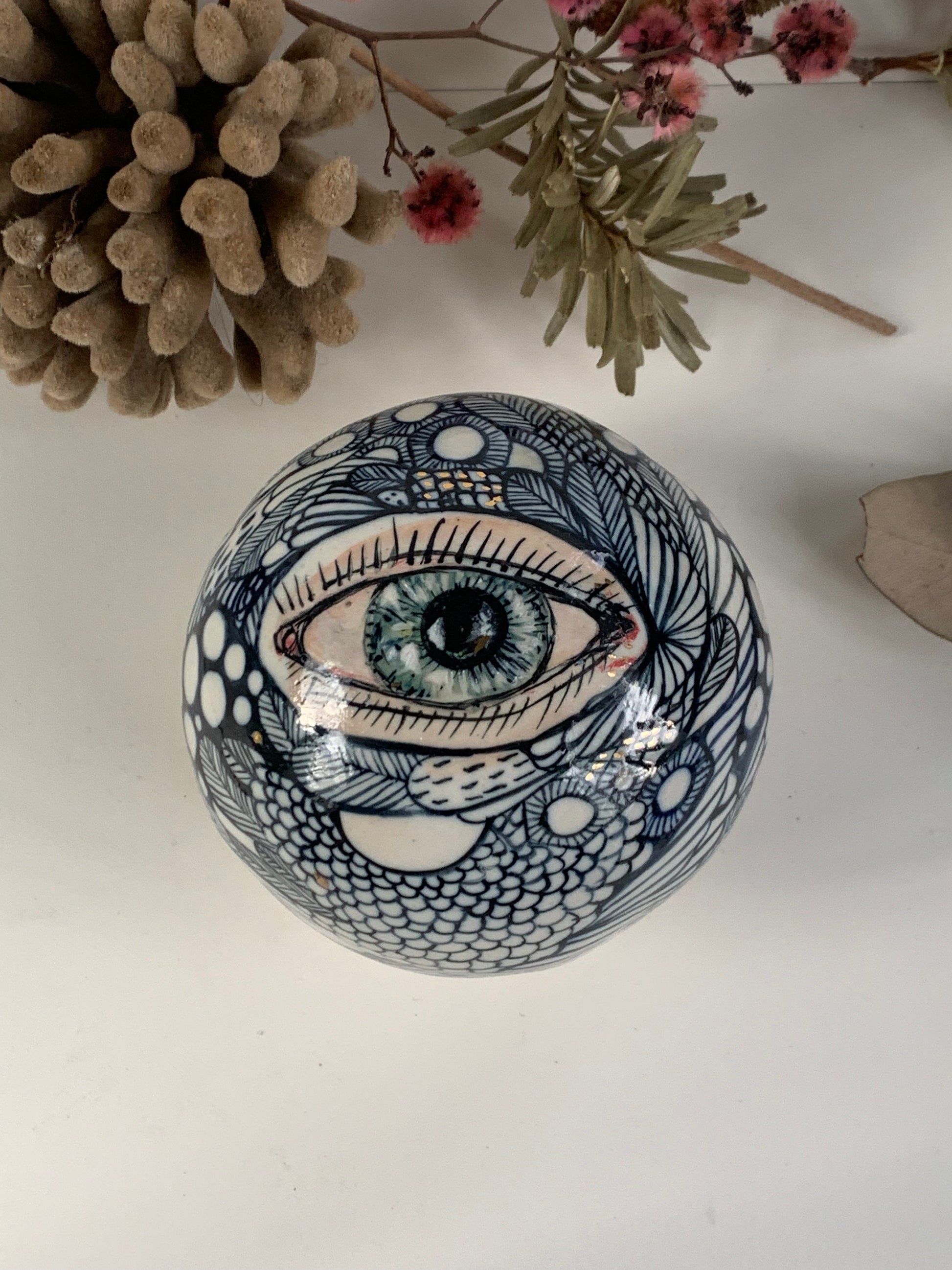 The design is painted in indigo blue, with a coloured ‘protective eye’ in the centre