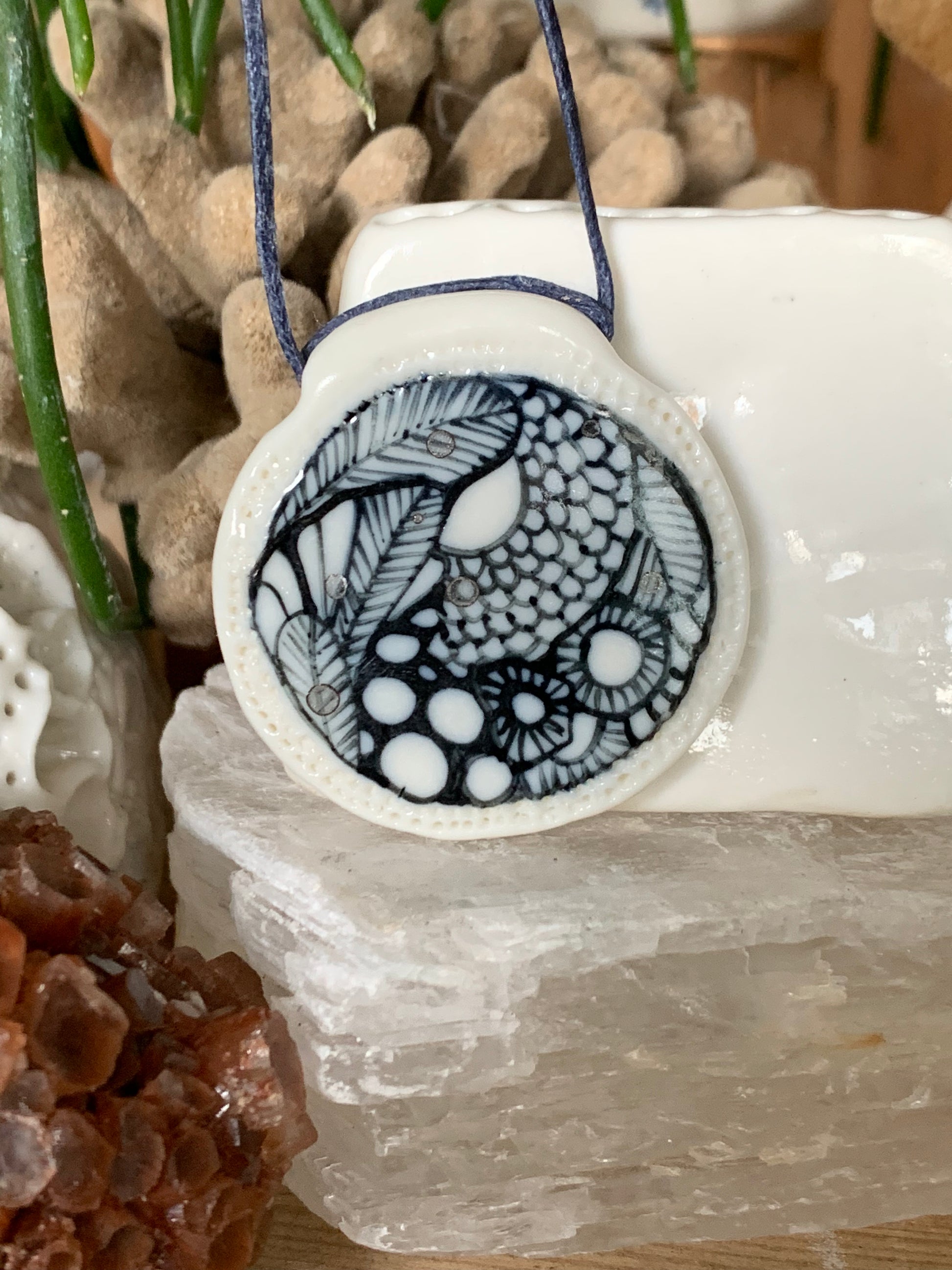The illustration is inspired by feathers and patterns and textures found in nature. The pendant hangs on black waxed thread.