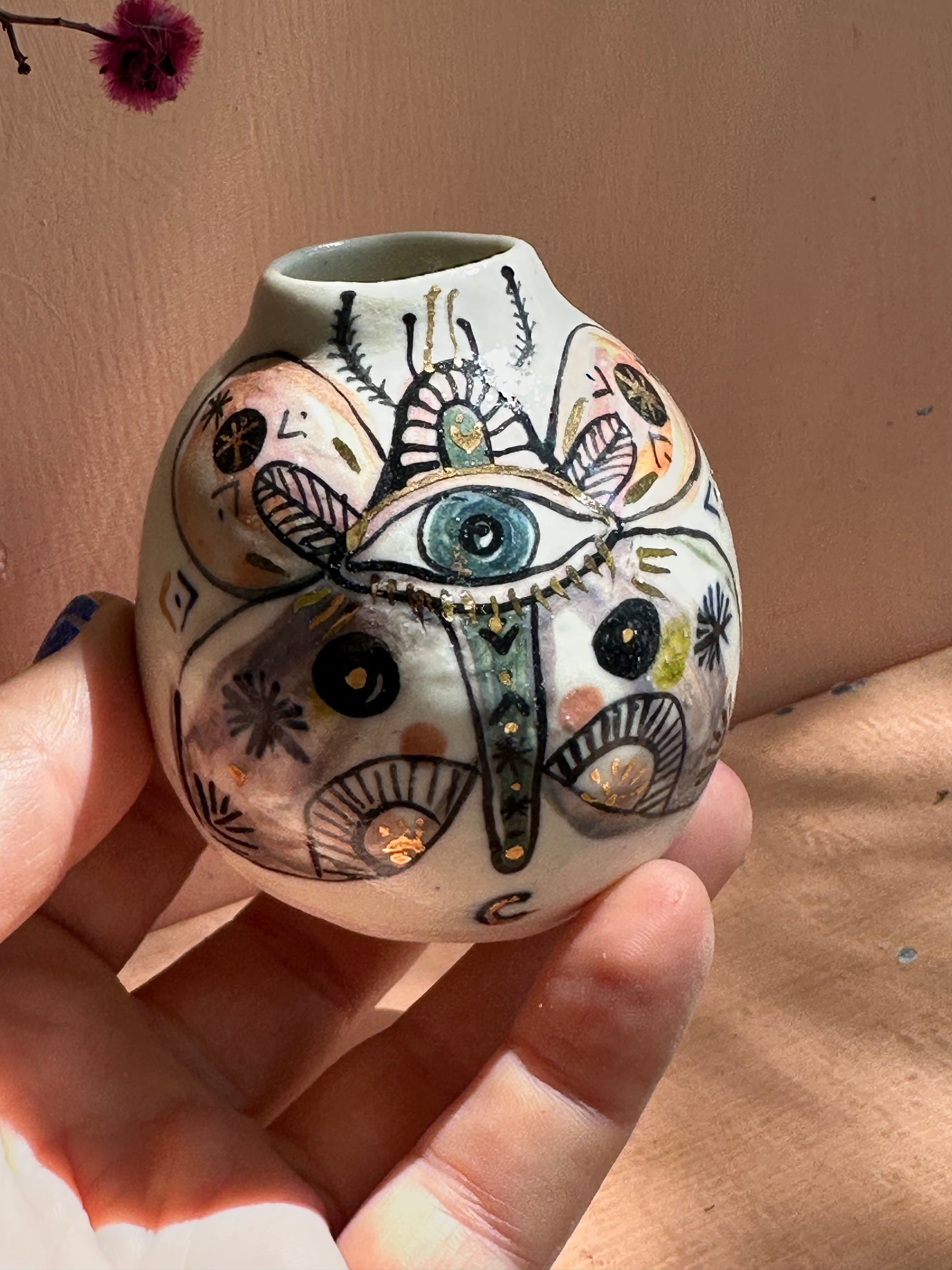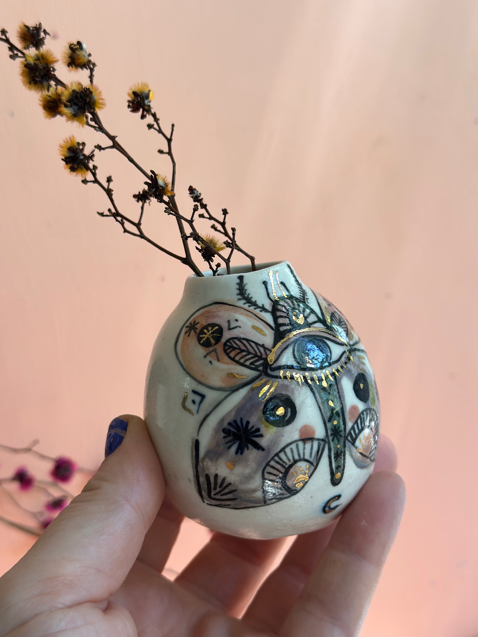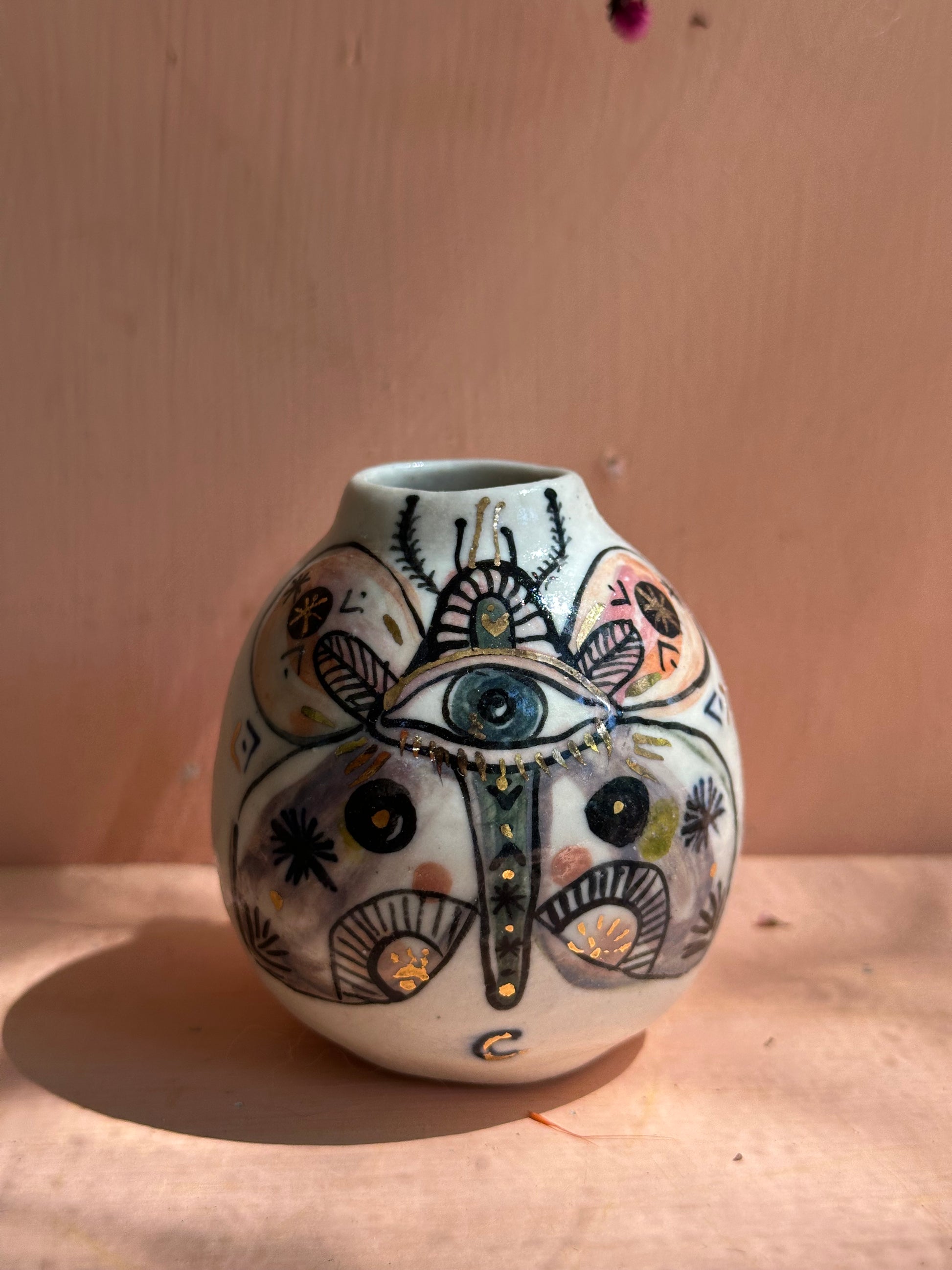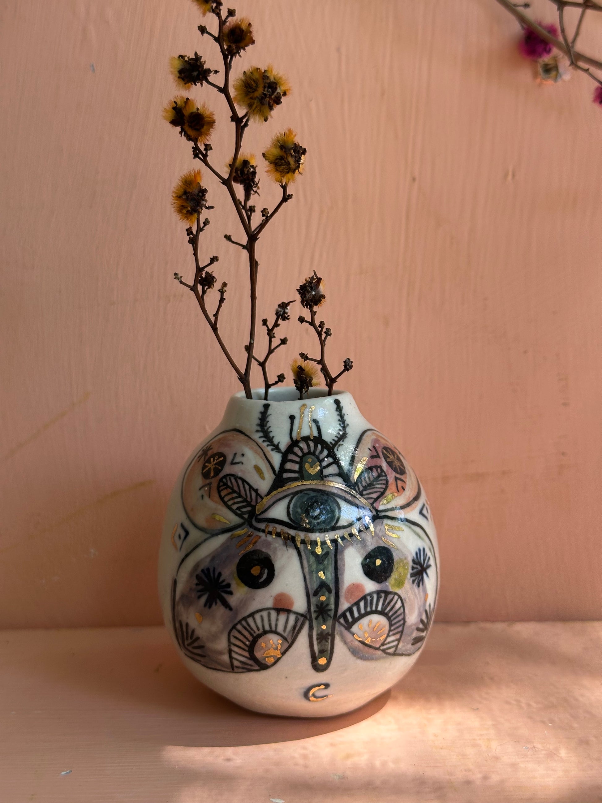 ‘Hand painted ‘the protective eye’ moth vase