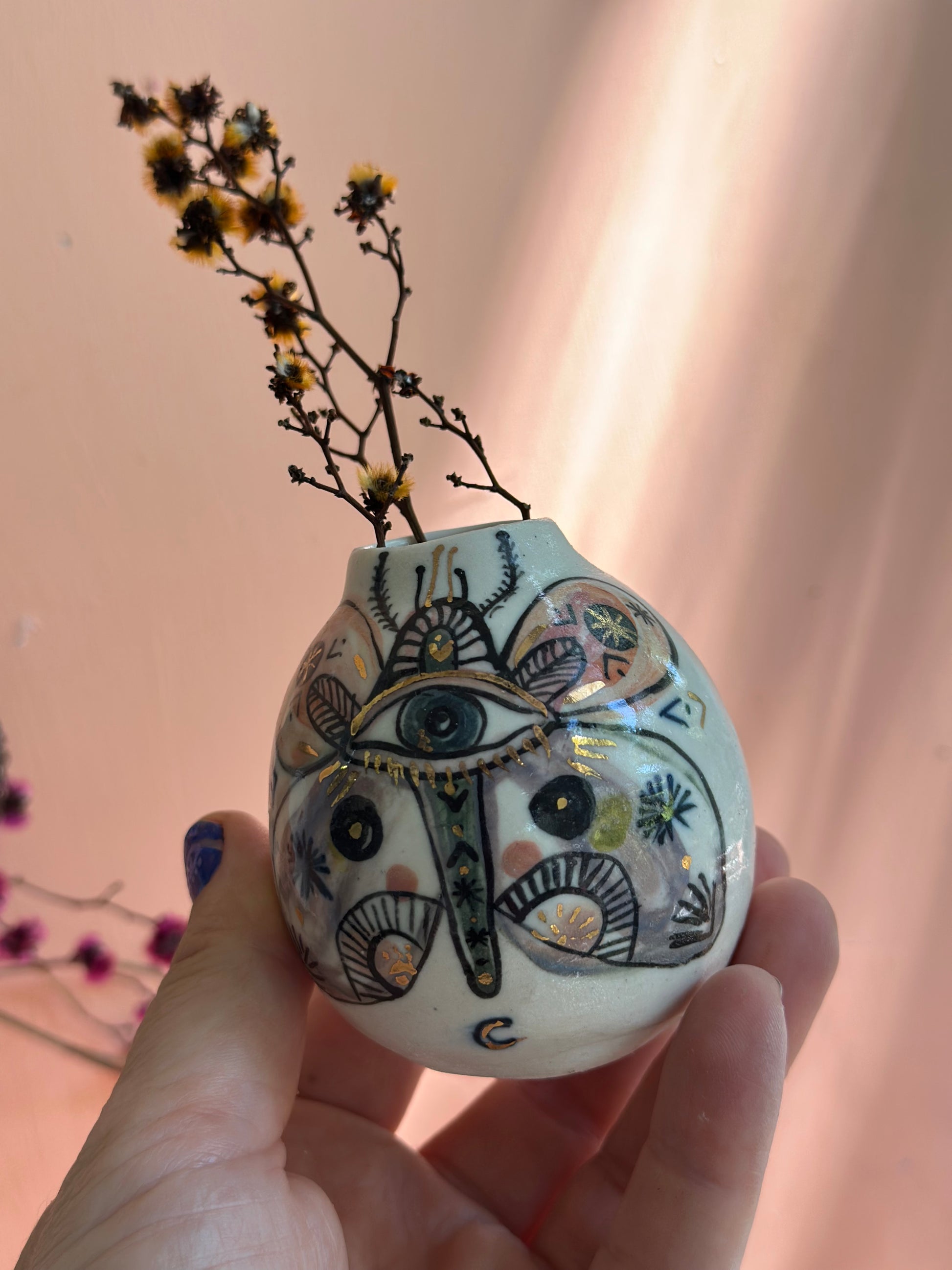 A one of a kind hand formed and hand painted porcelain vase, made by katherine in her home studio in castlemaine, central Vic.