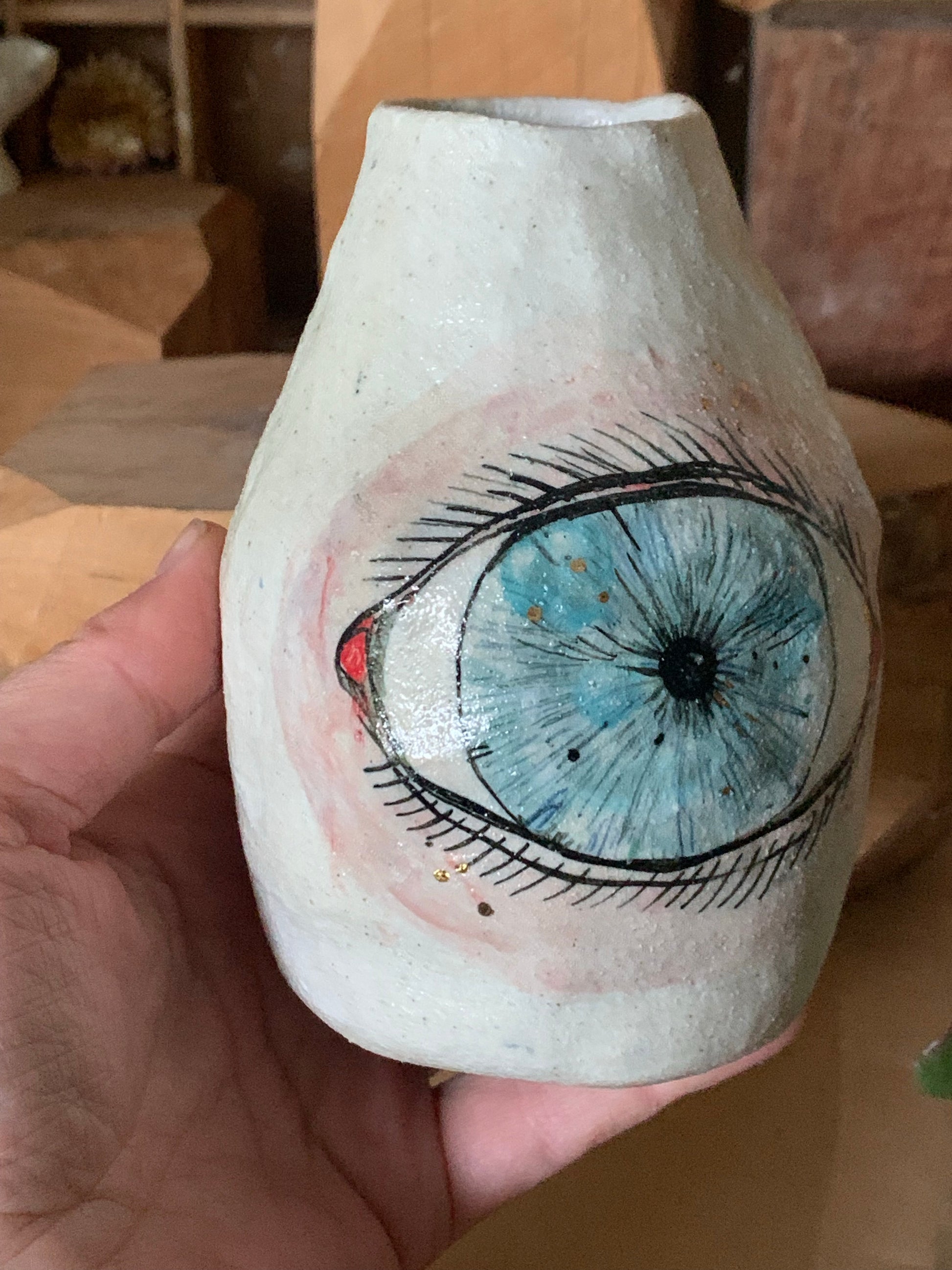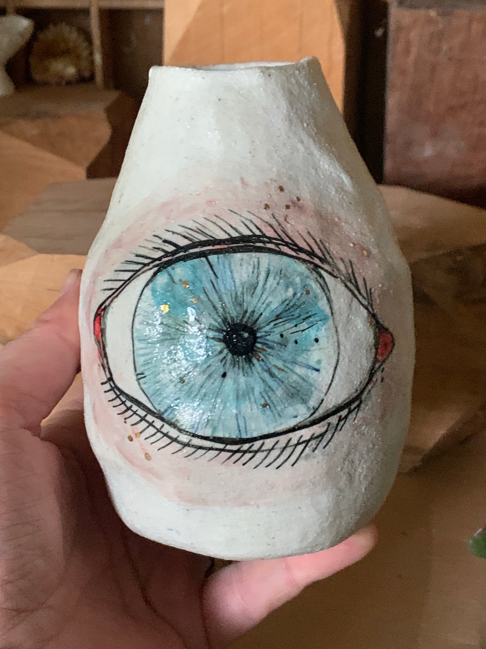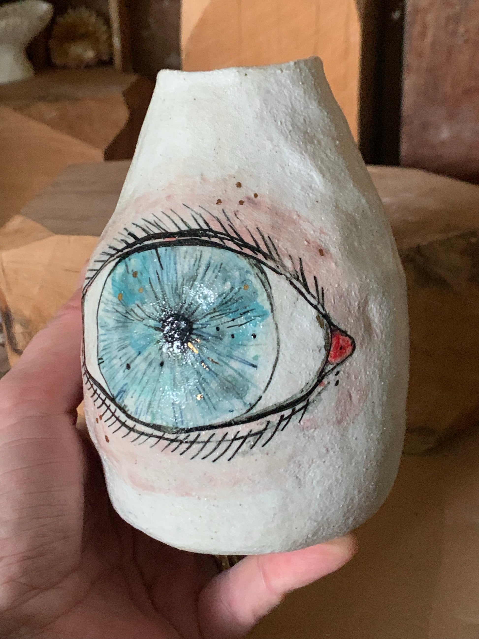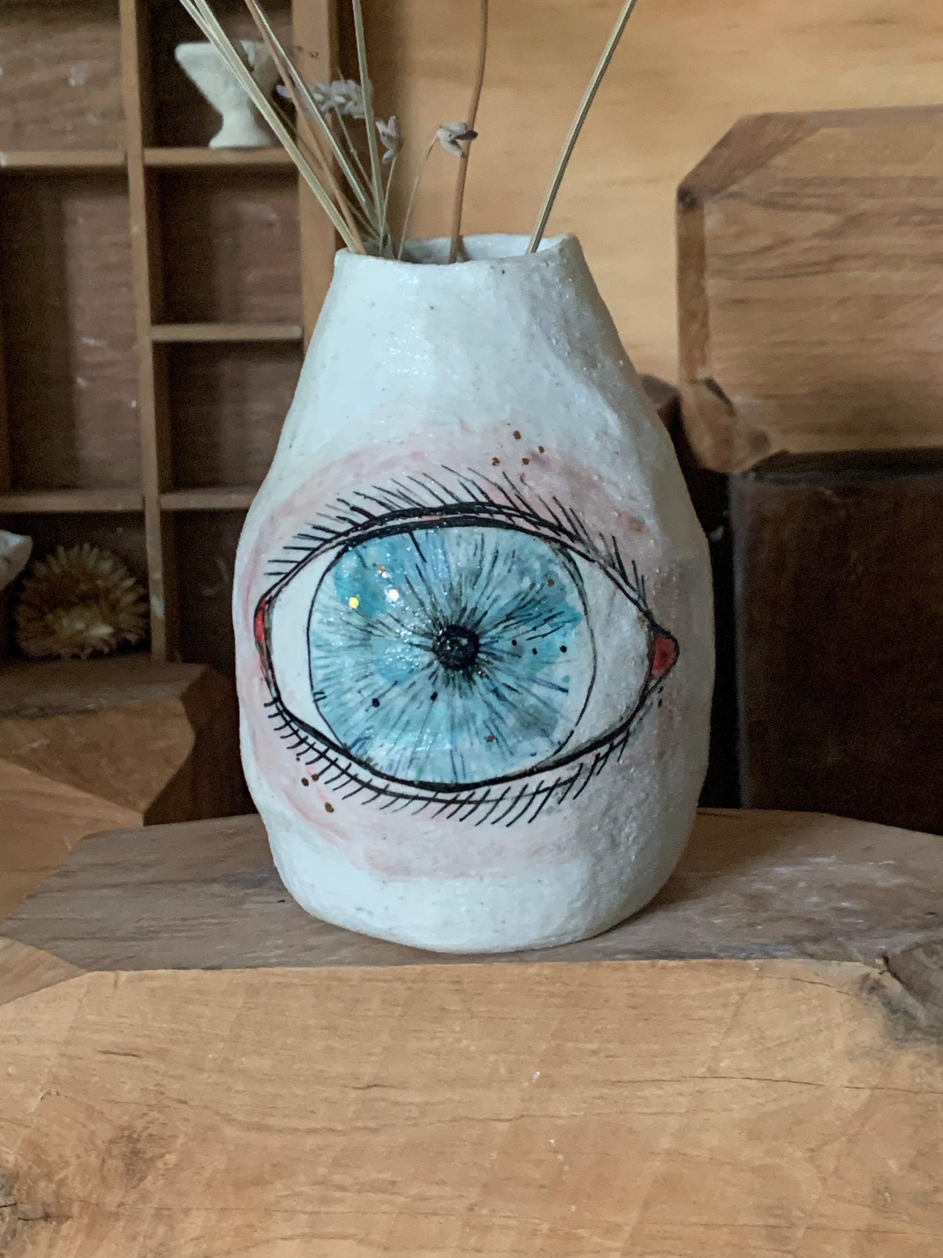 A one of a kind hand formed and hand painted white raku stoneware vase, made by katherine in her home studio in castlemaine, central Vic.