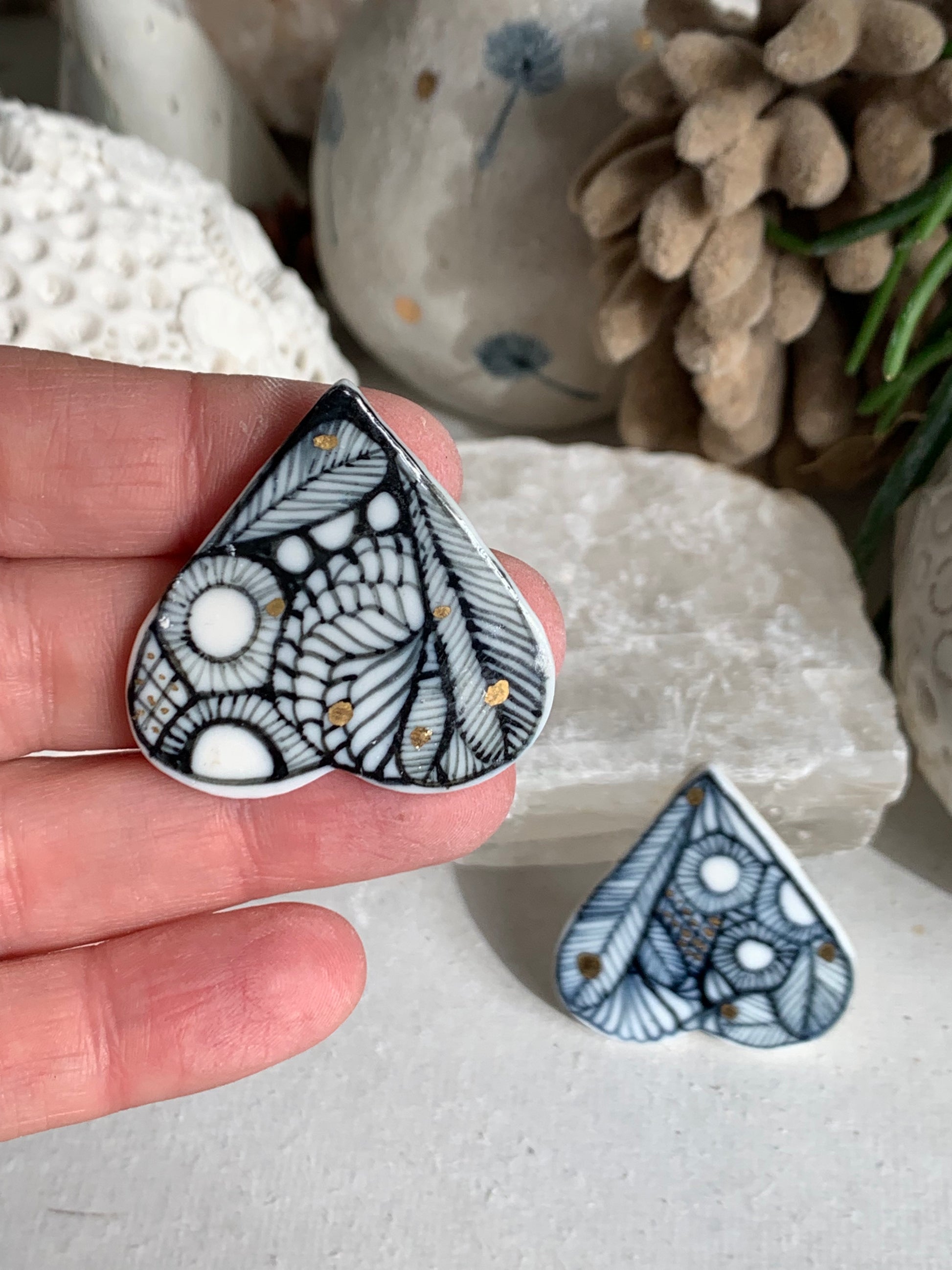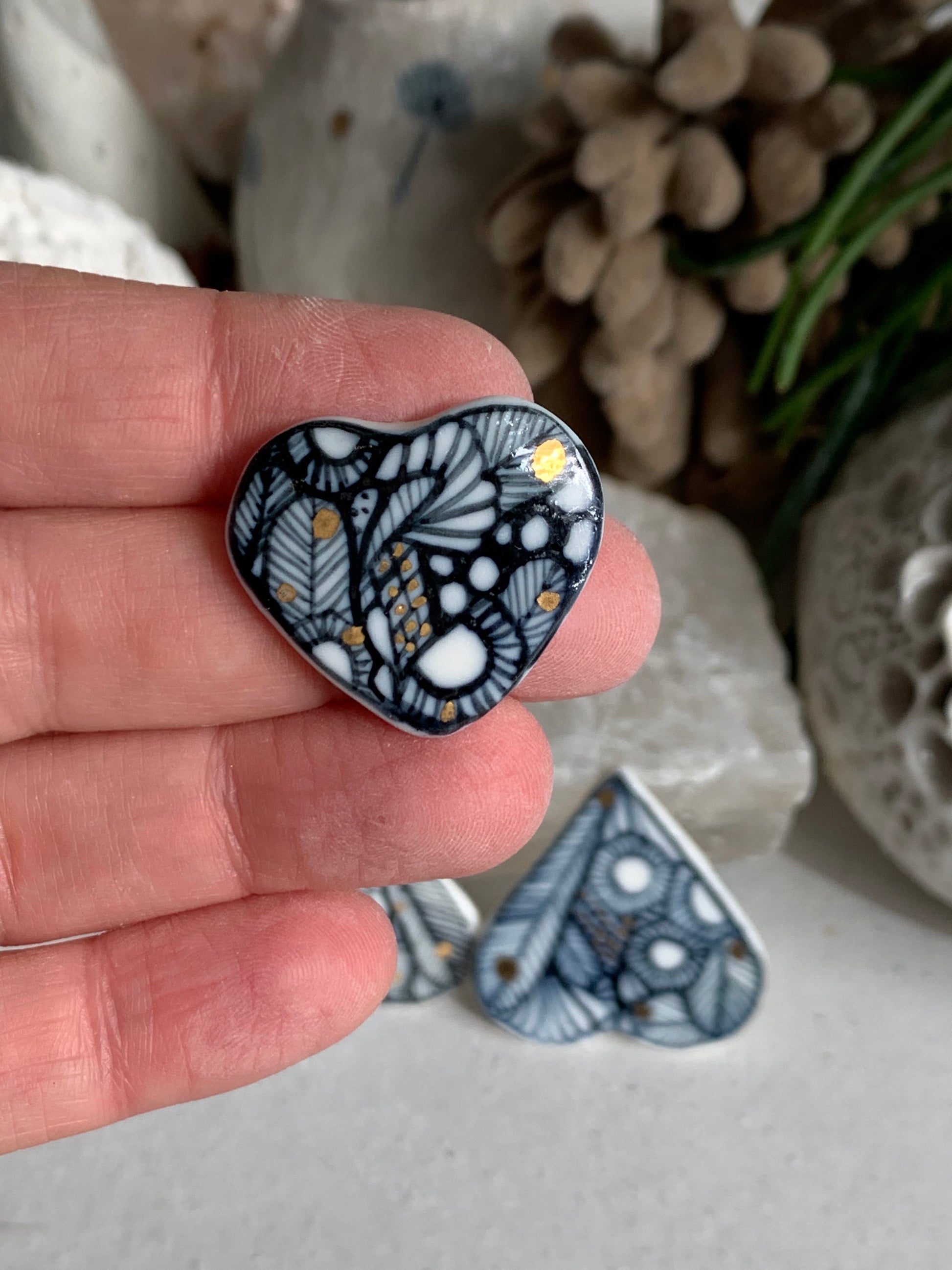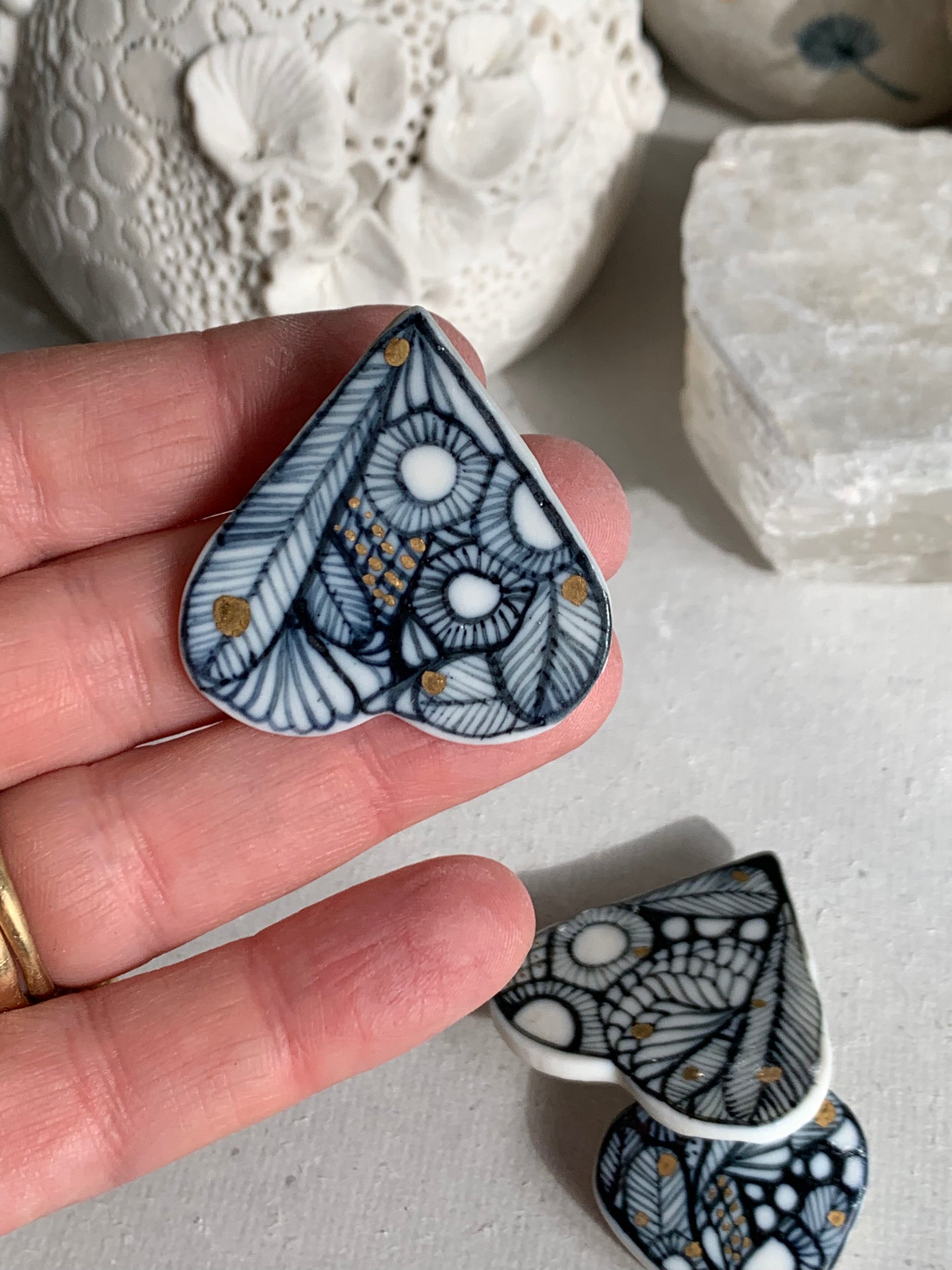 A one of a kind hand painted and hand formed porcelain brooch with gold details.