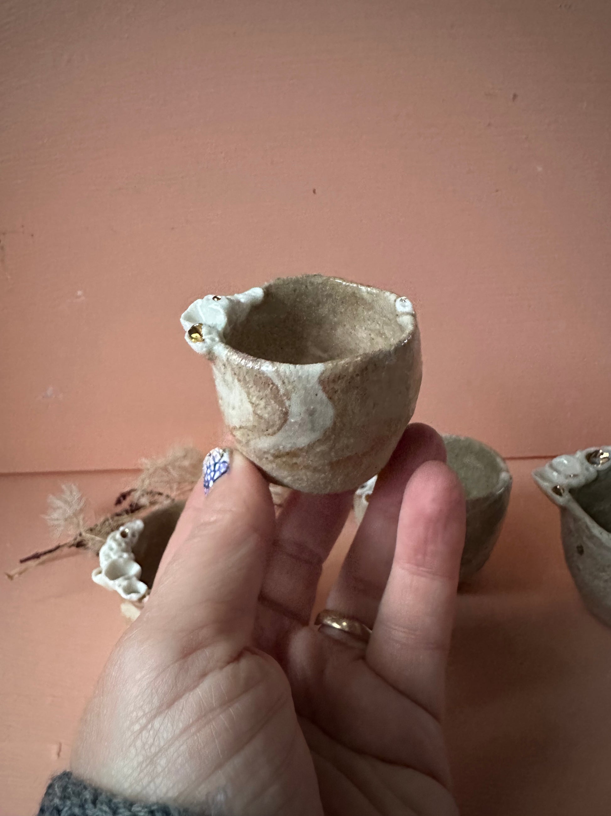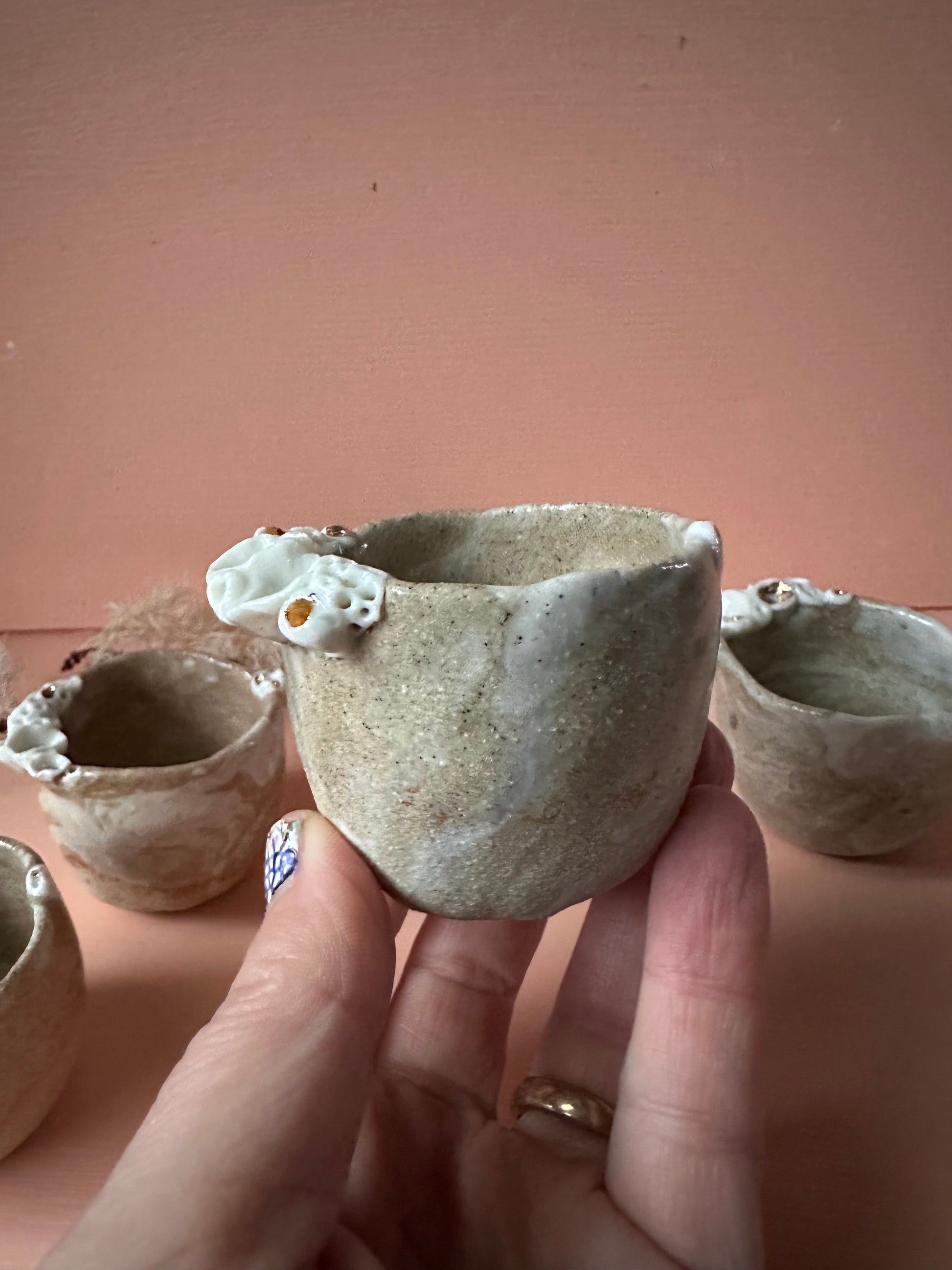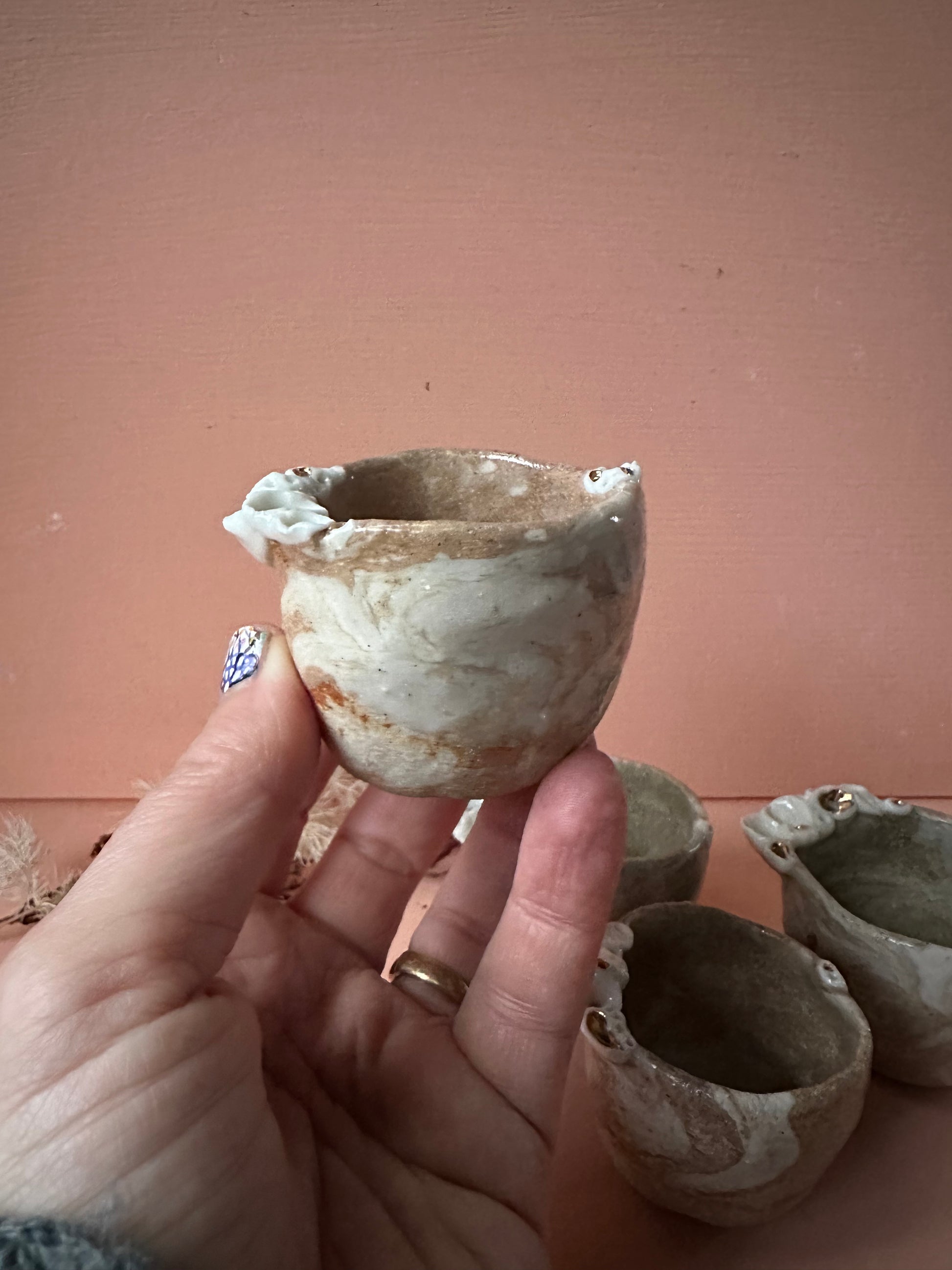 A one of a kind hand formed and wonky tiny ‘coral’ hand textured cup, made by me in my home studio in castlemaine.