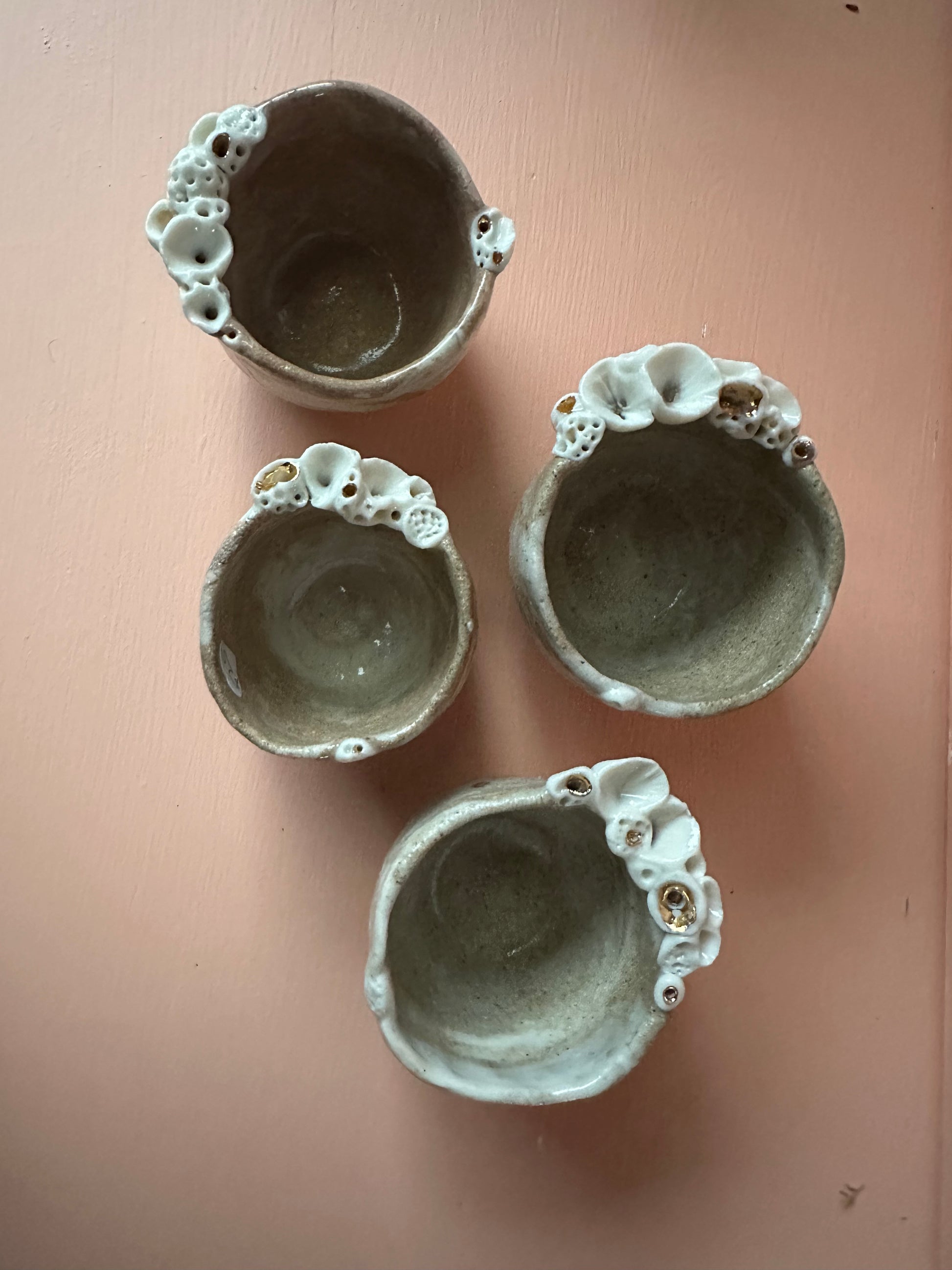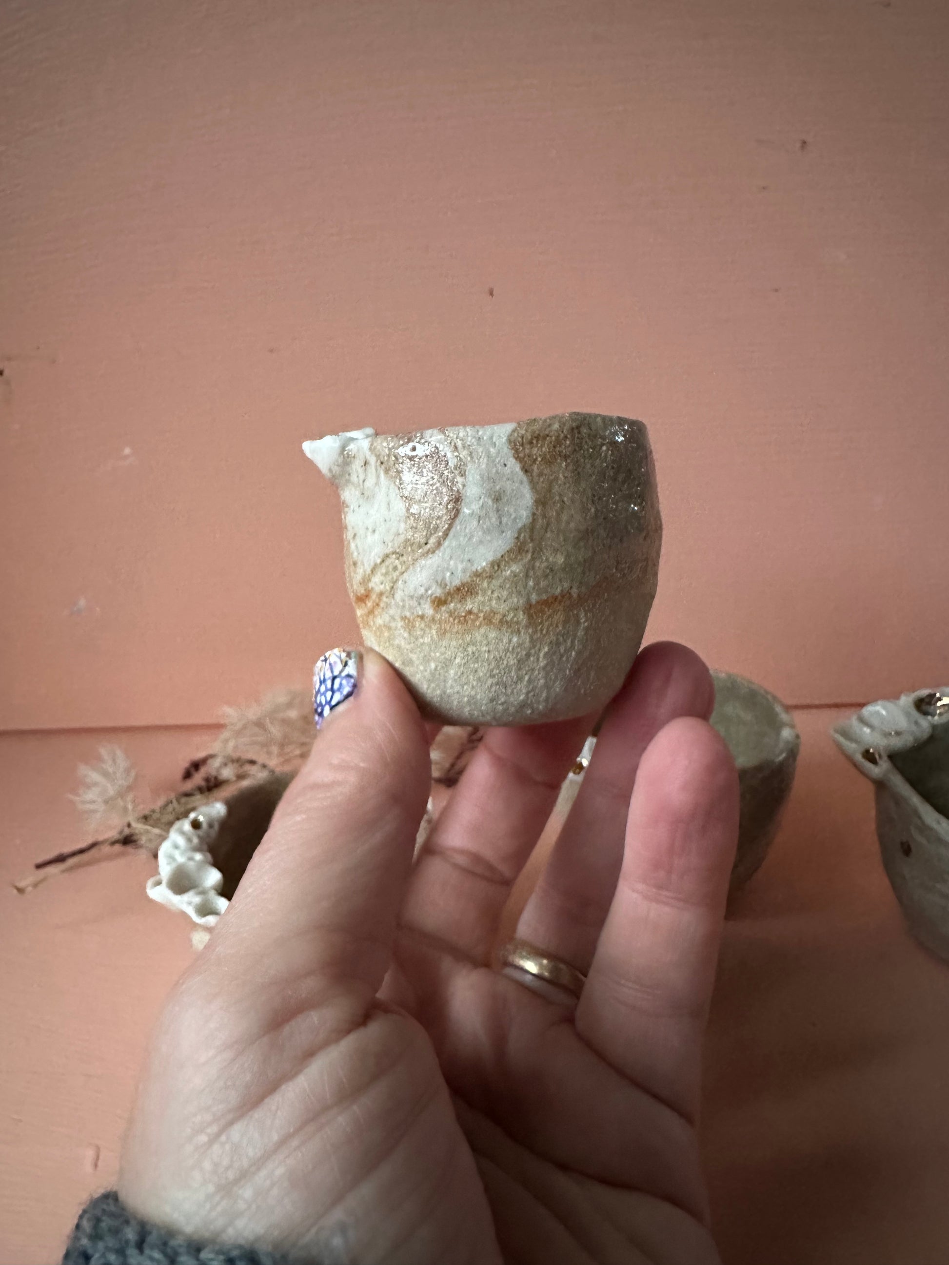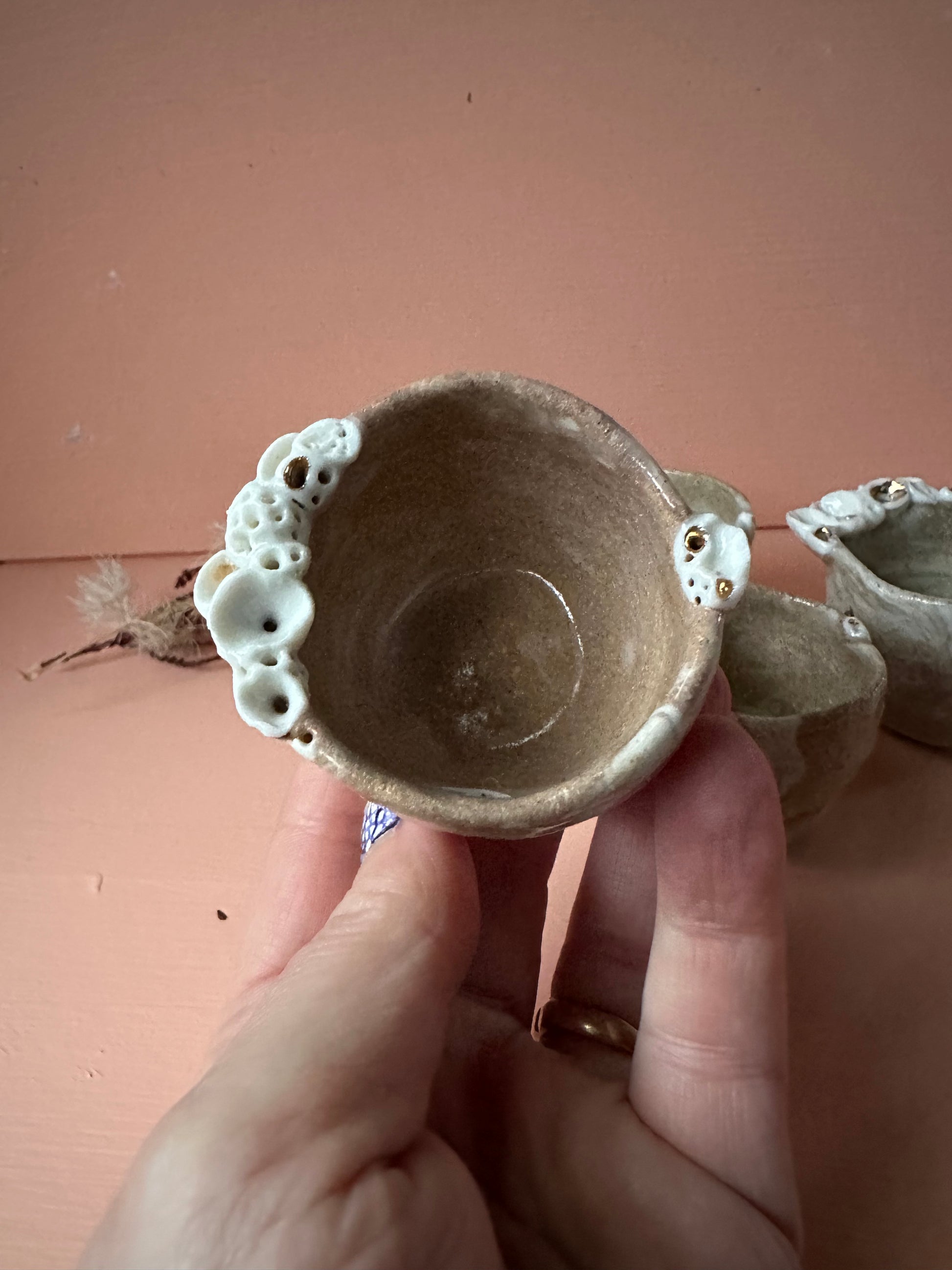 A one of a kind hand formed and wonky tiny ‘coral’ hand textured cup, made by me in my home studio in castlemaine.