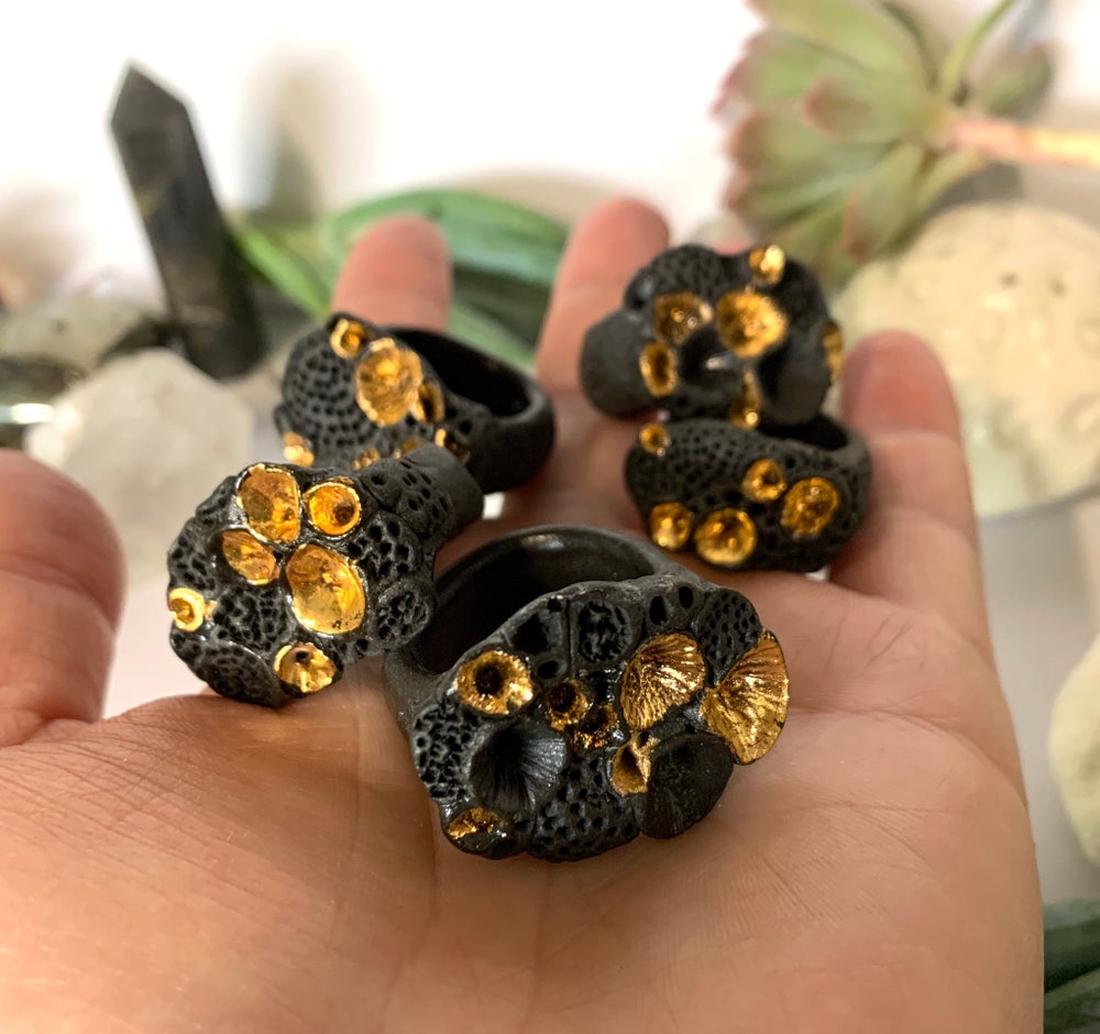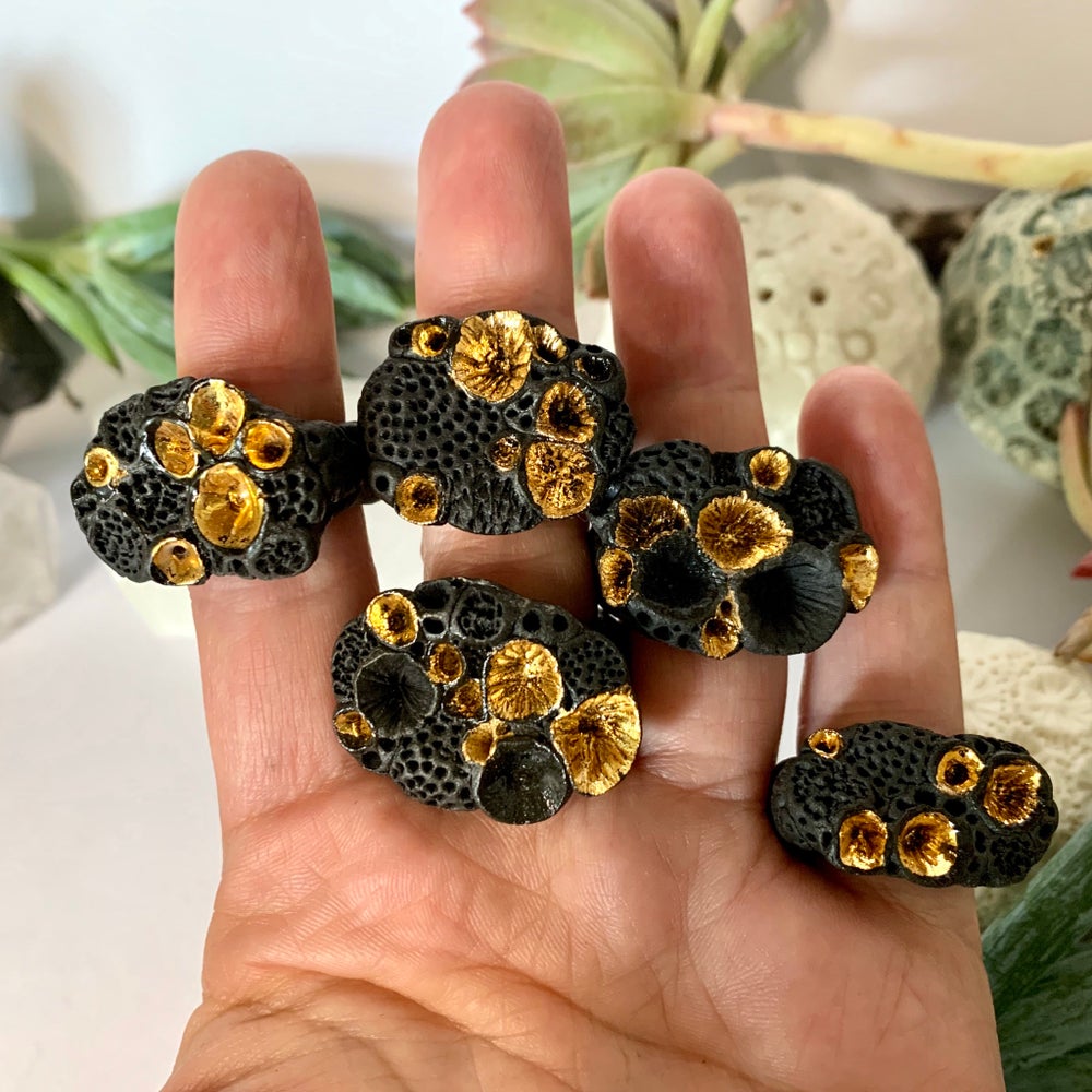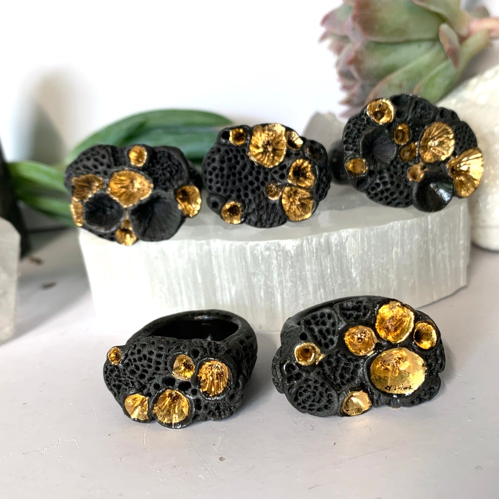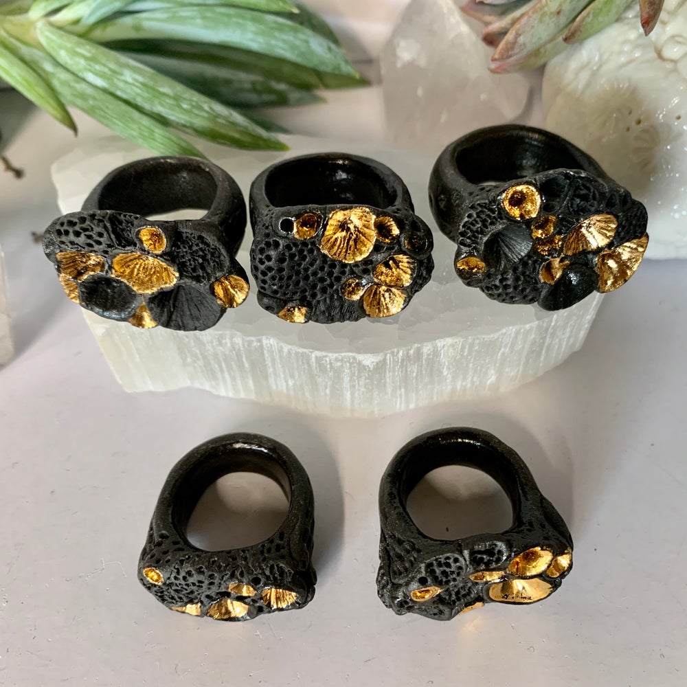 This is a one off handmade ring made by Katherine in her home studio in Castlemaine, Victoria. One 'rock coral’ hand formed black porcelain coral inspired ring.
