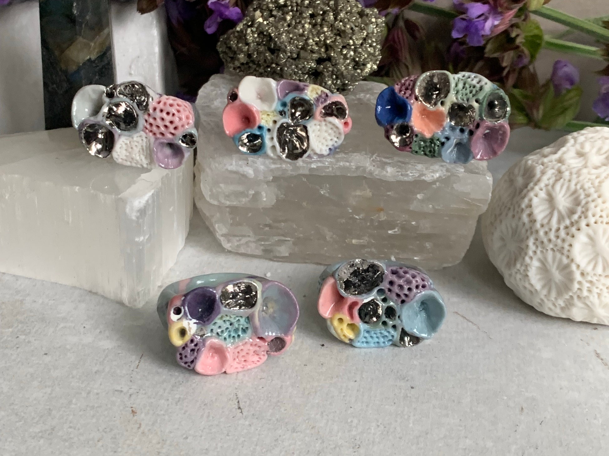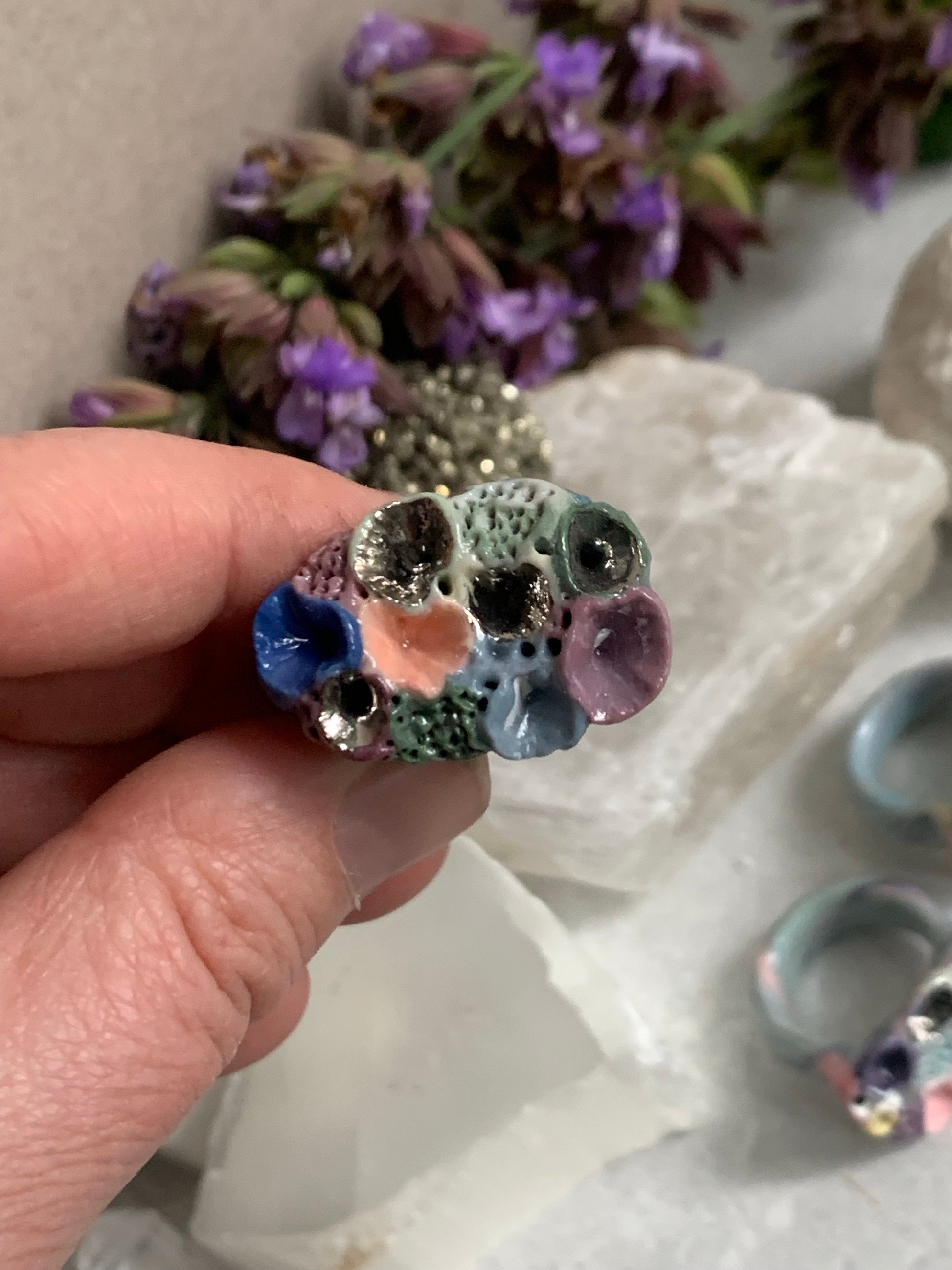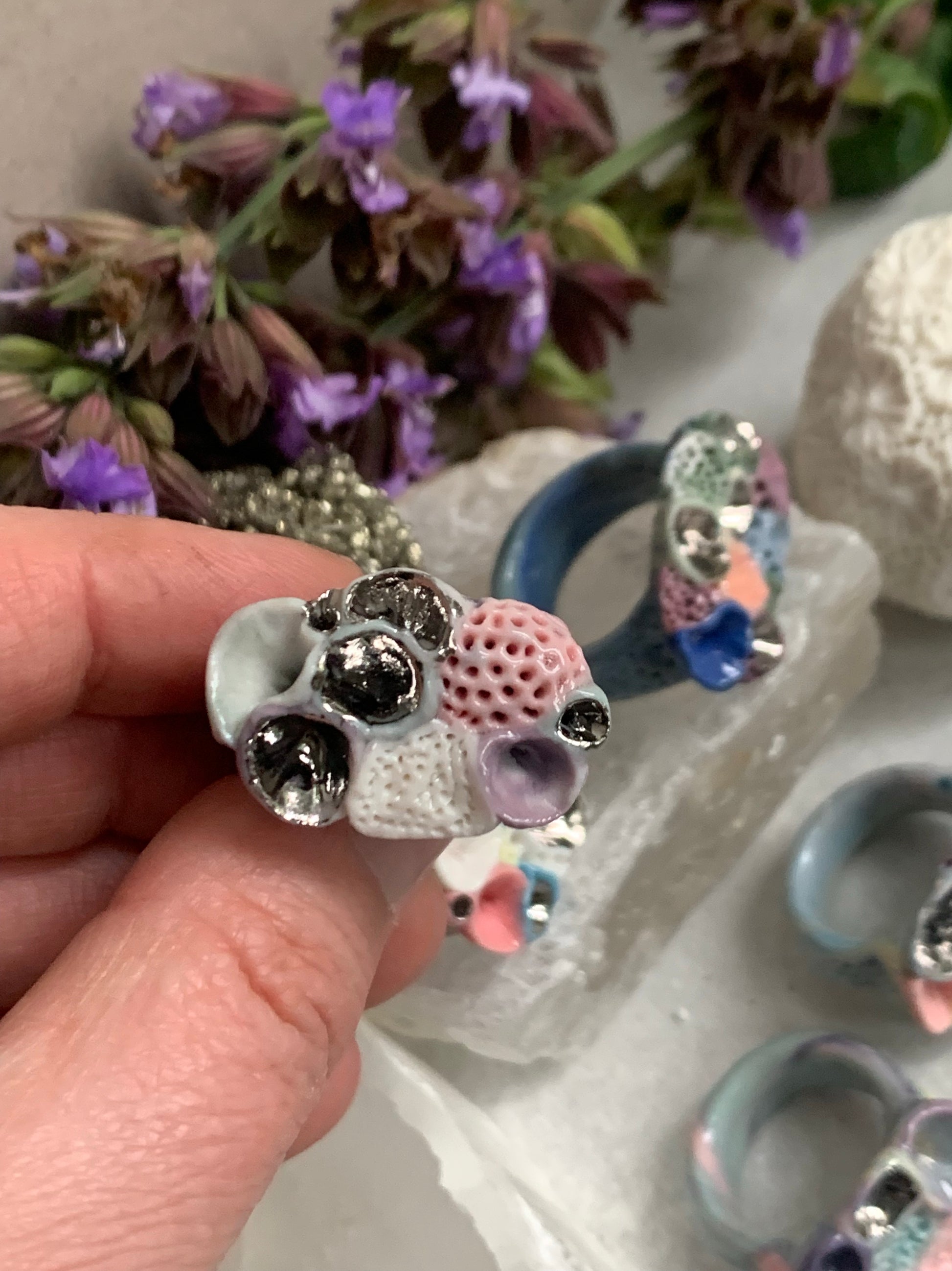 One silver lustre with Blue/ pink / purple tones ‘rock coral’ porcelain ring