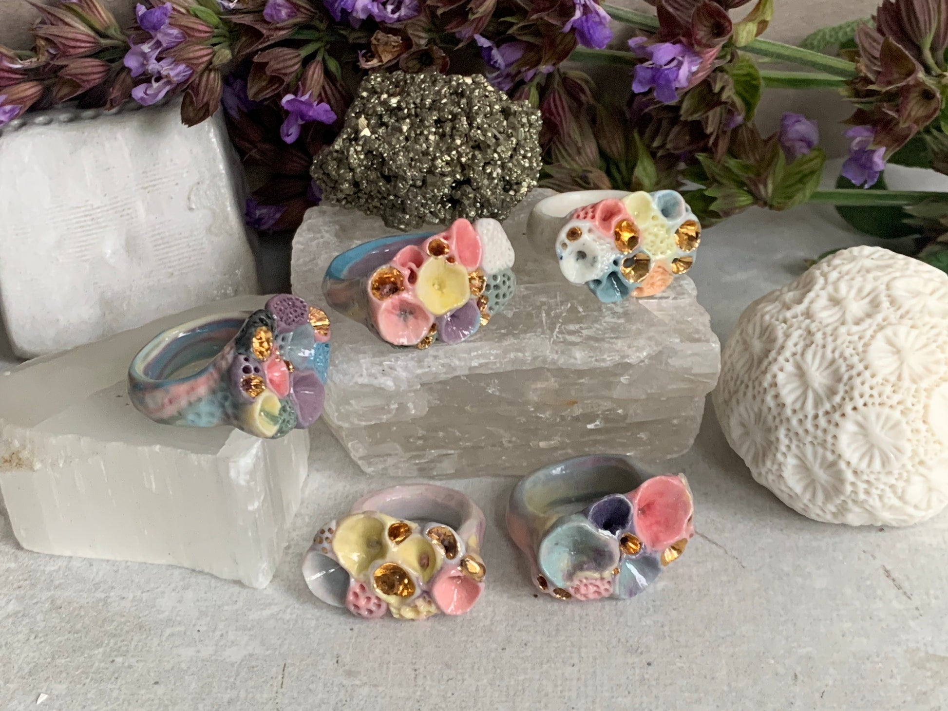 These coral design rings are made in coloured porcelain, and are inspired by beach combing and collecting and looking at treasures along the shoreline and in rock pools.