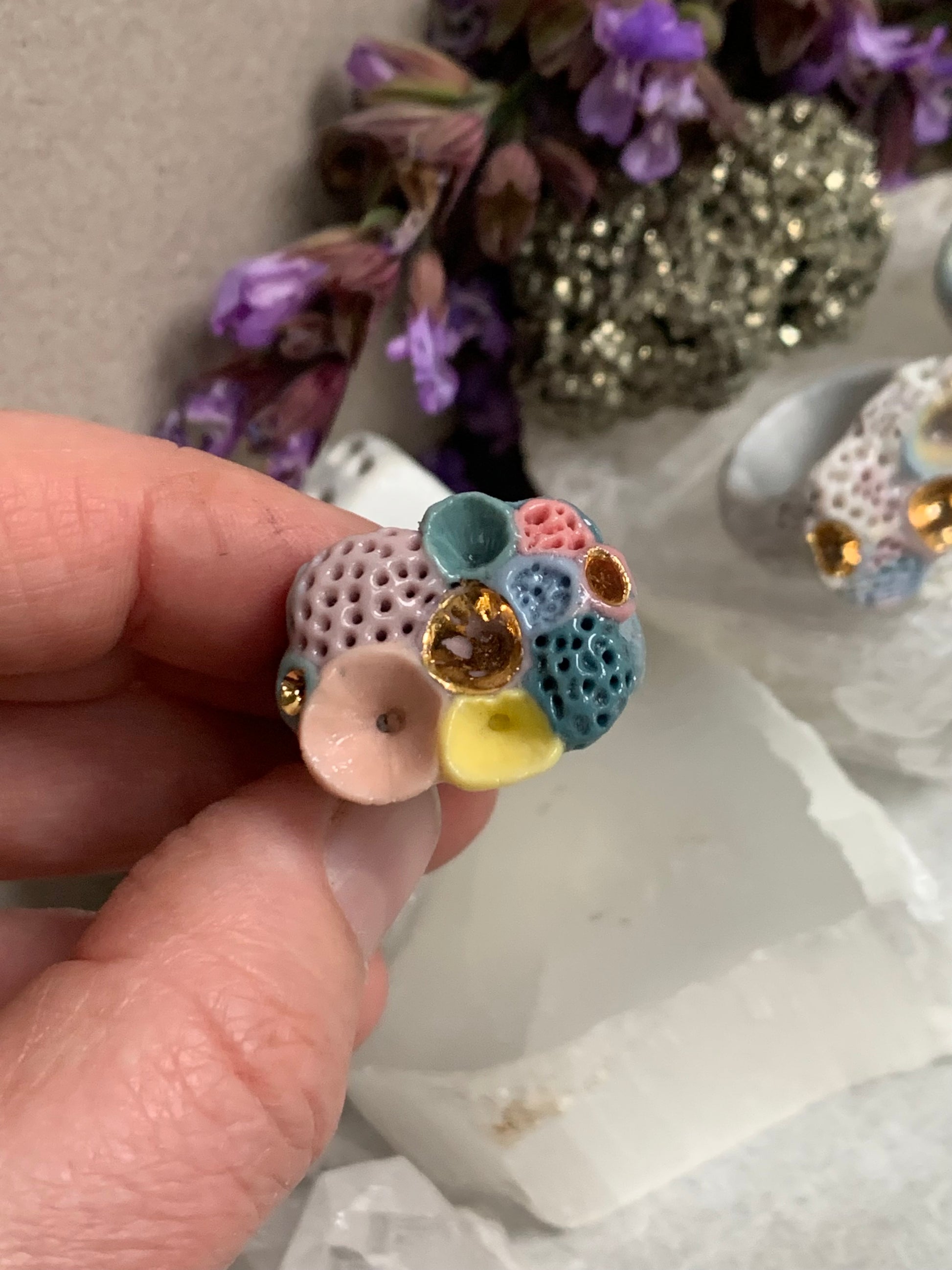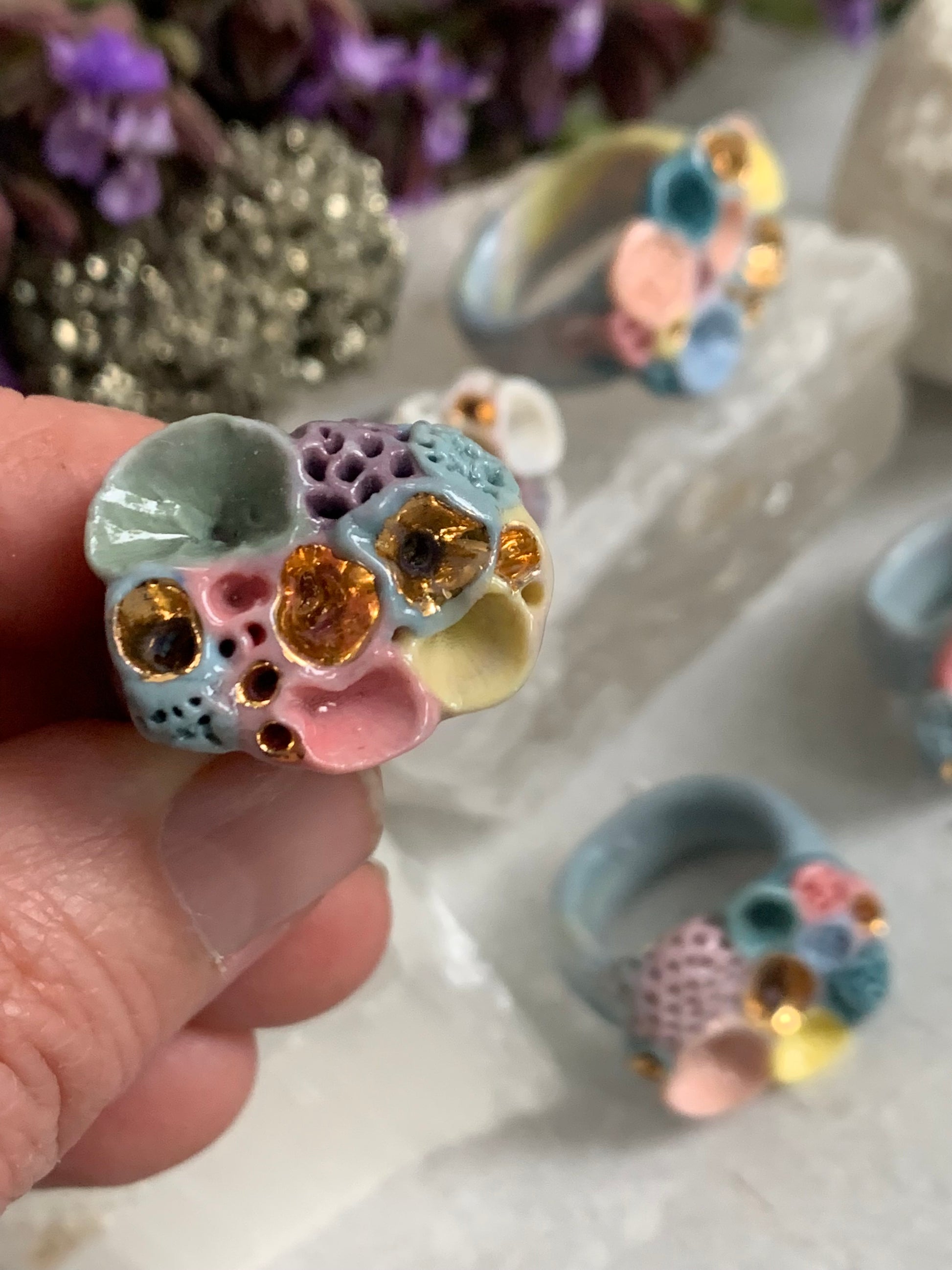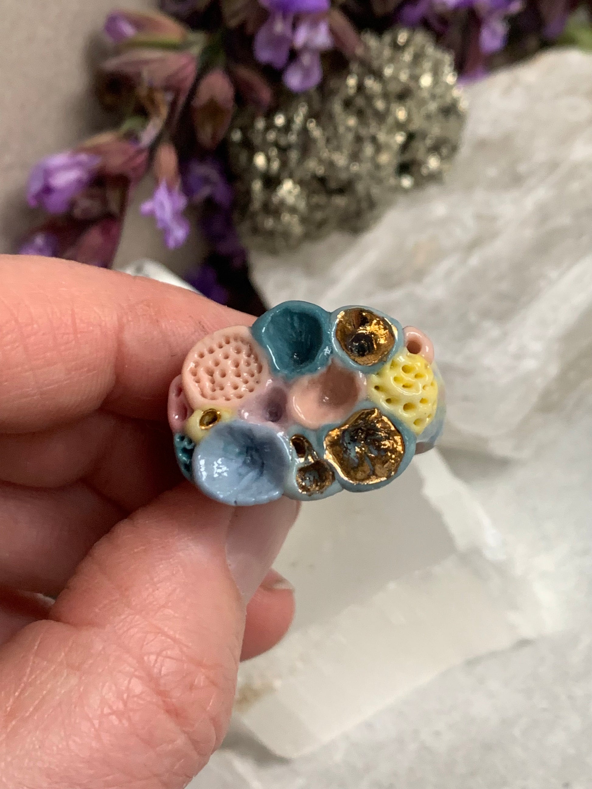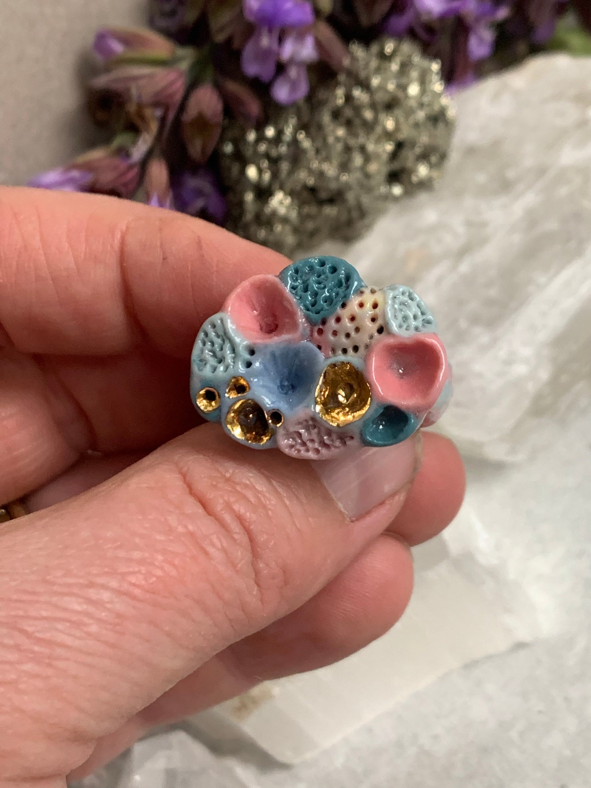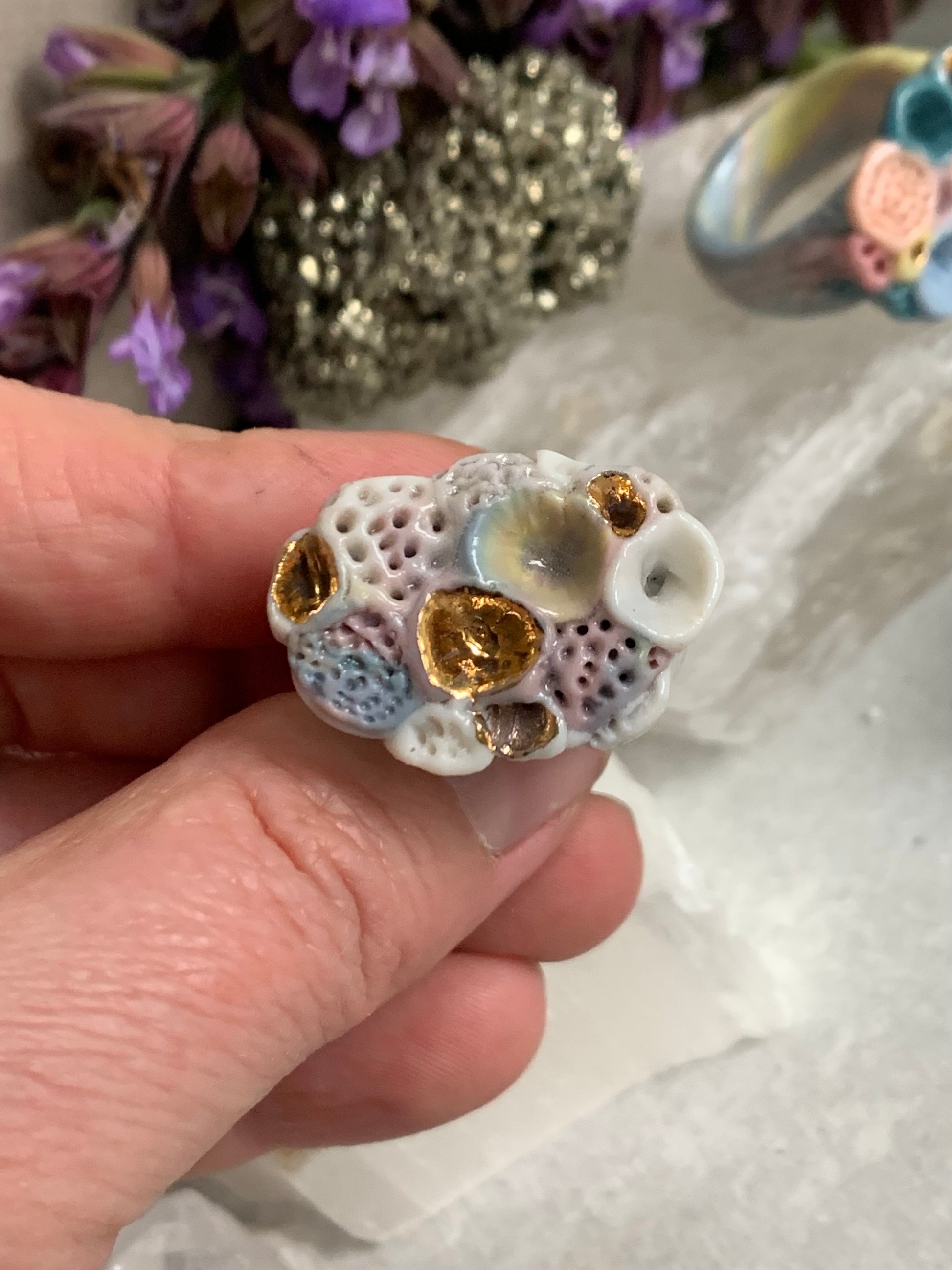 One gold lustre with Blue/ pink / purple tones ‘rock coral’ porcelain ring