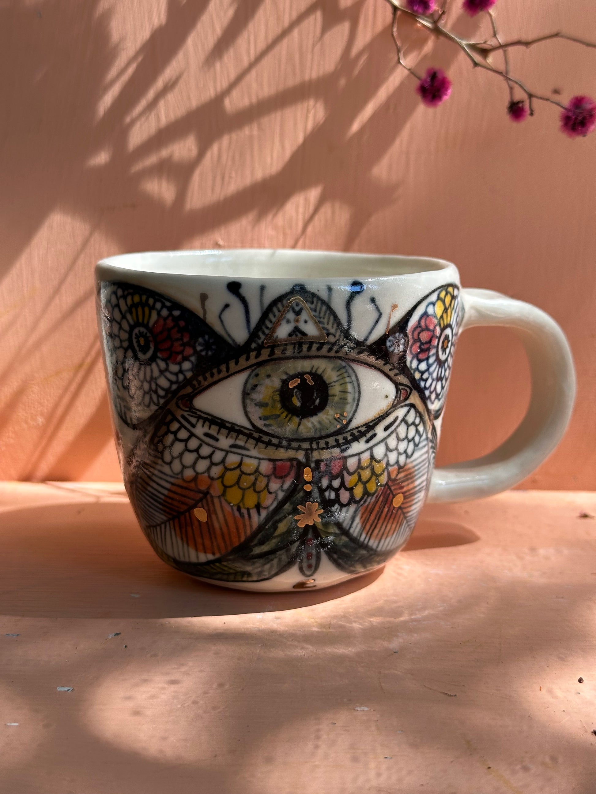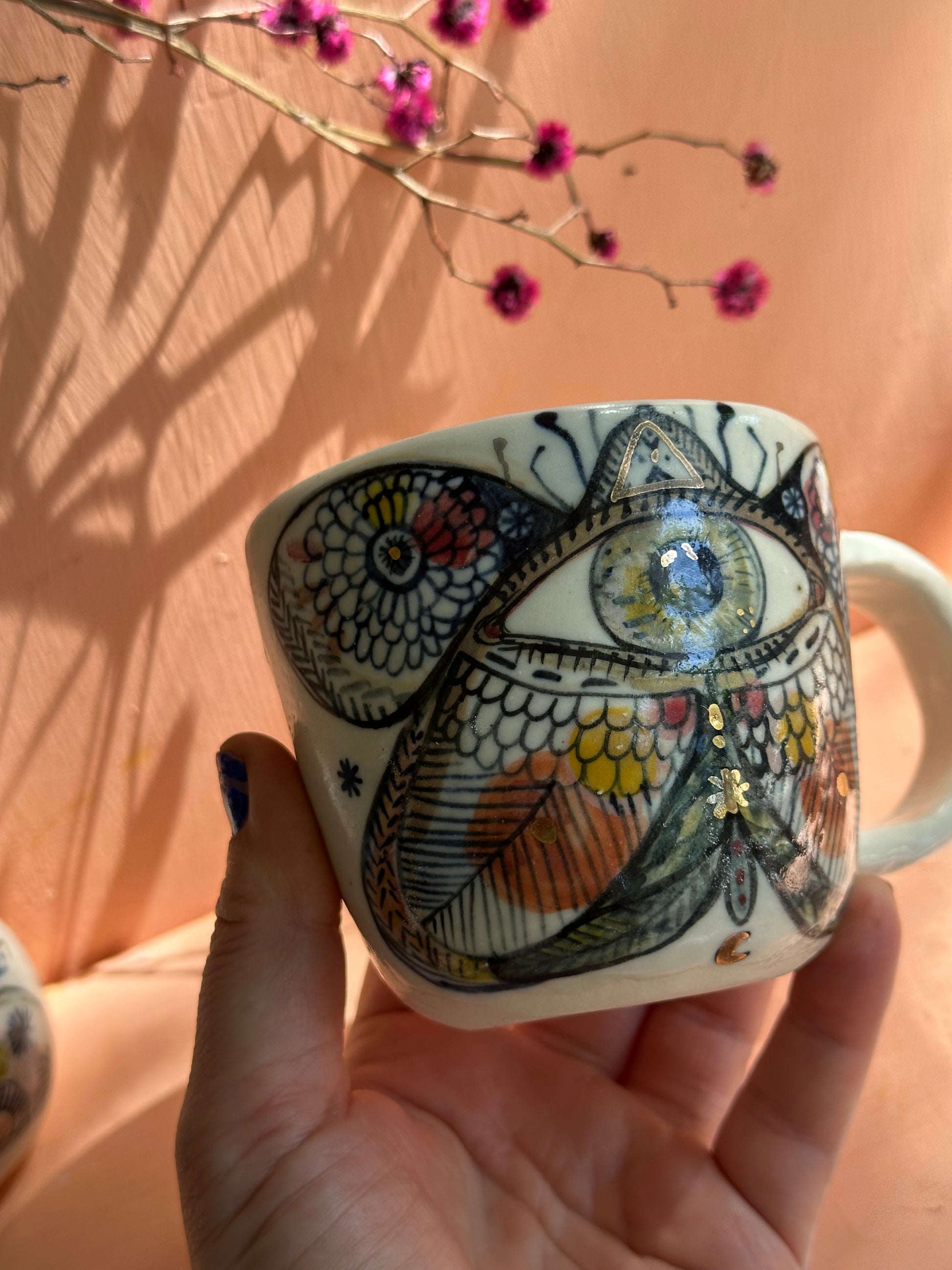 These cups are inspired by moth wings and their intricate patterns. Also the ‘eye’ like pattern their wings display, that can protect them from predators.