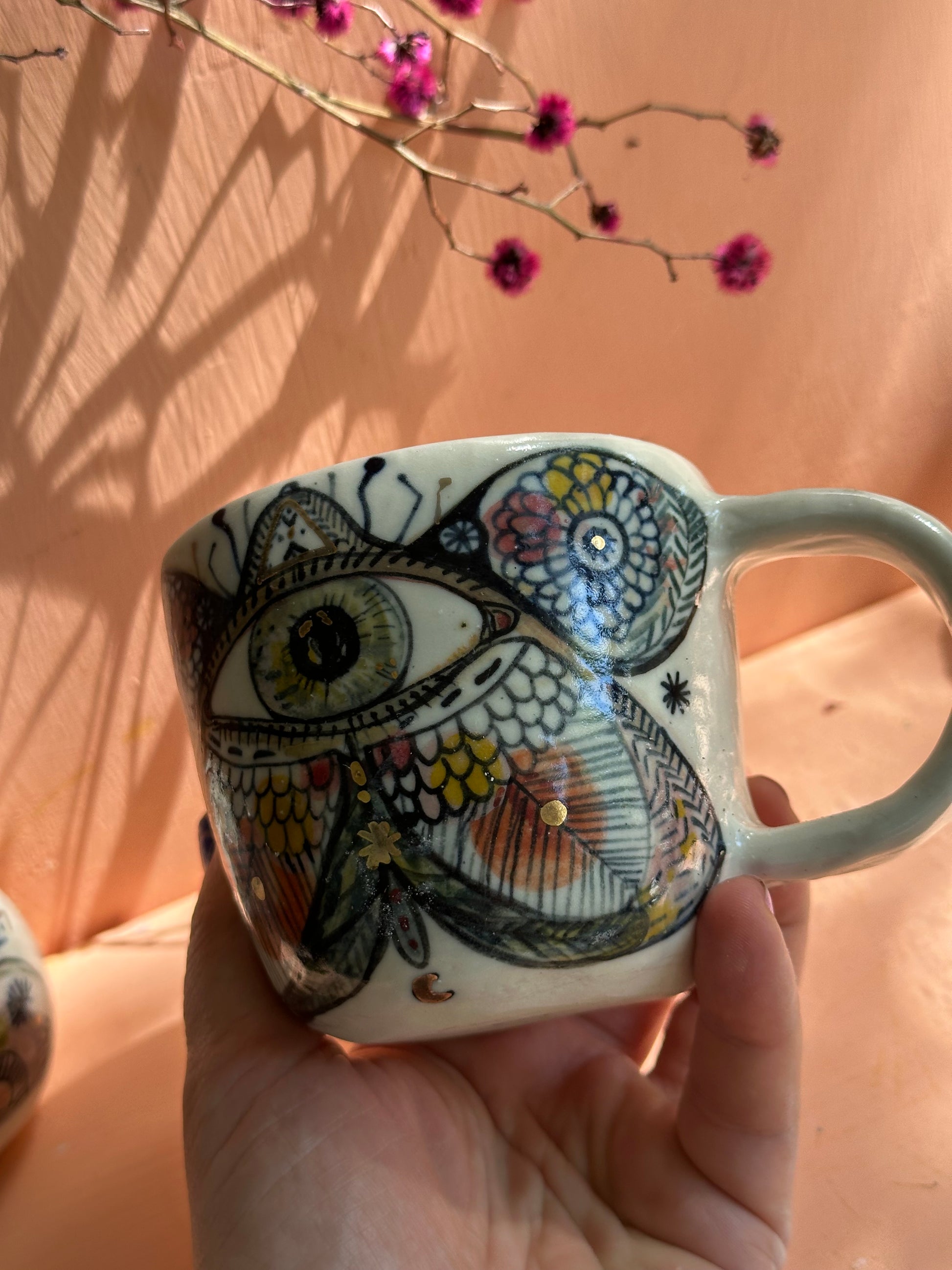 Hand made and hand painted cups with original artworks, hand painted by Australian artist Katherine Wheeler in her studio in Castlemaine Victoria.