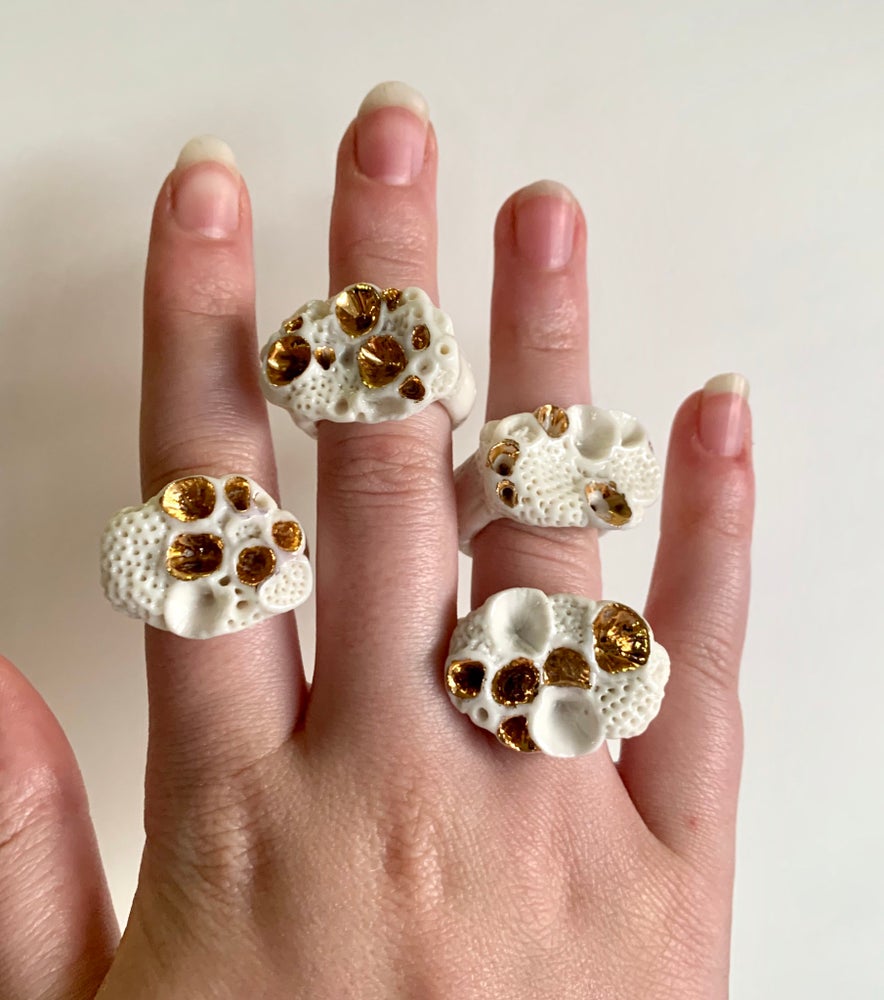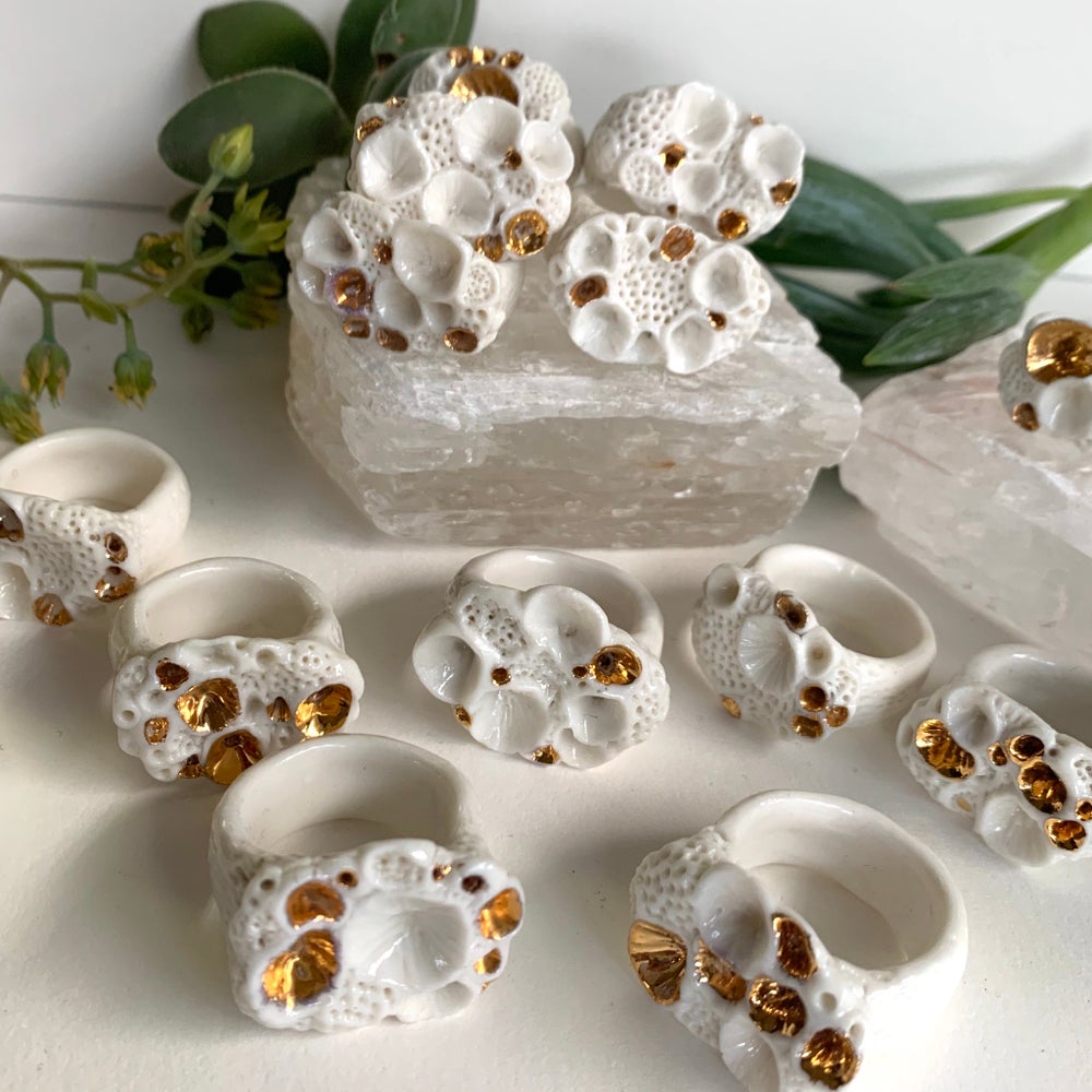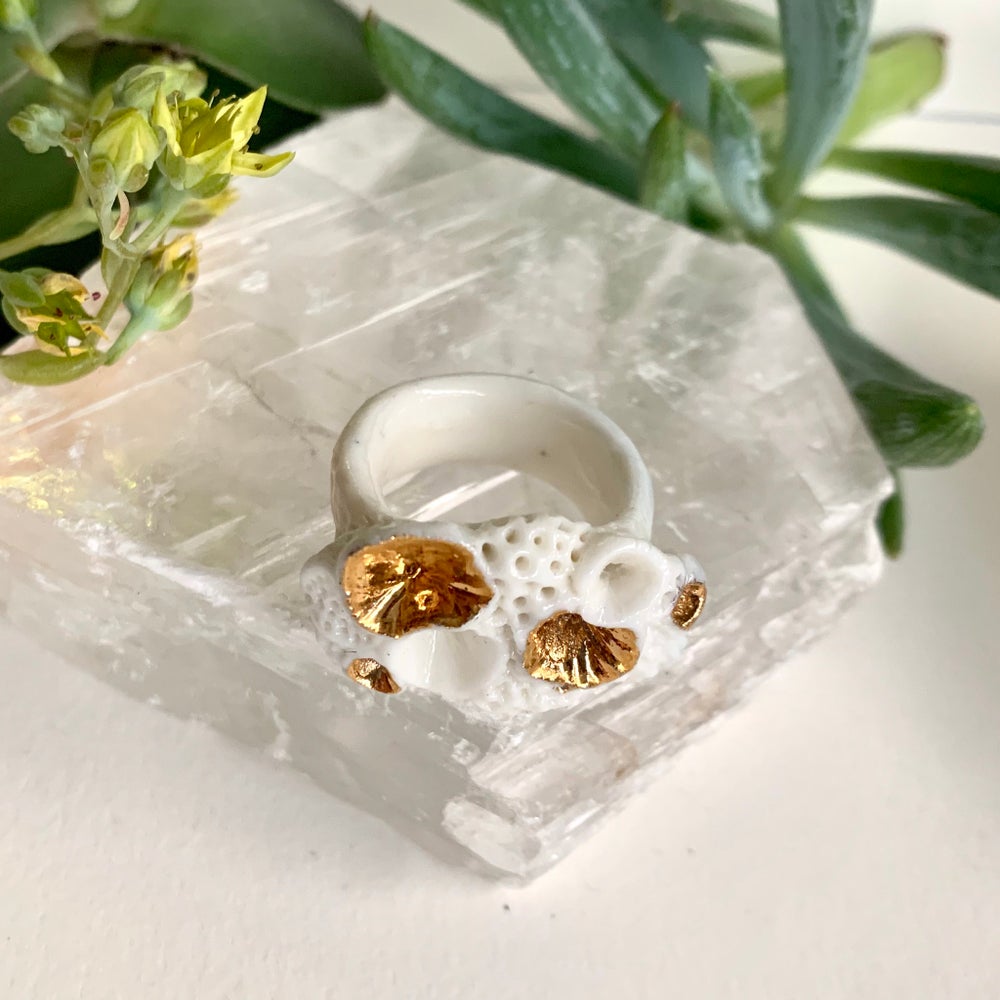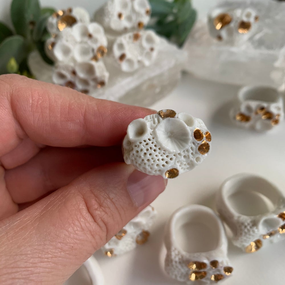This is a one off handmade ring made by Katherine in her home studio in Castlemaine, Victoria. One 'Rock coral’ hand formed and textured porcelain ring, with gold lustre detail. These rings are inspired by beach combing and collecting and looking at treasures along the shoreline and in rock pools. Mimicking the shapes and textures of coral and shell.