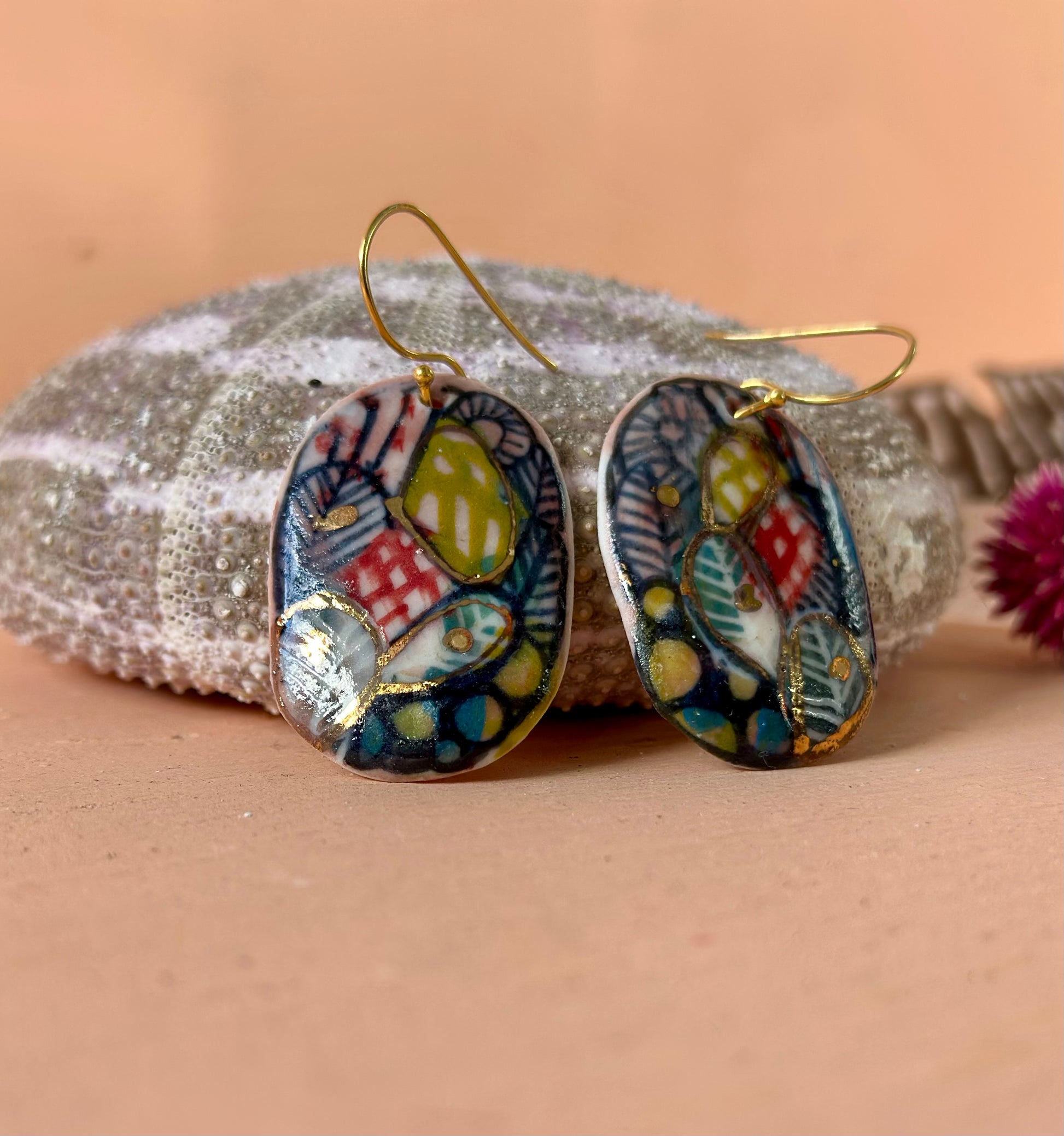 One of a kind porcelain hand crafted earrings with gold lustre detail, on gold plated sterling silver hooks. The patterns are inspired by textures and patterns observed while beach combing.
