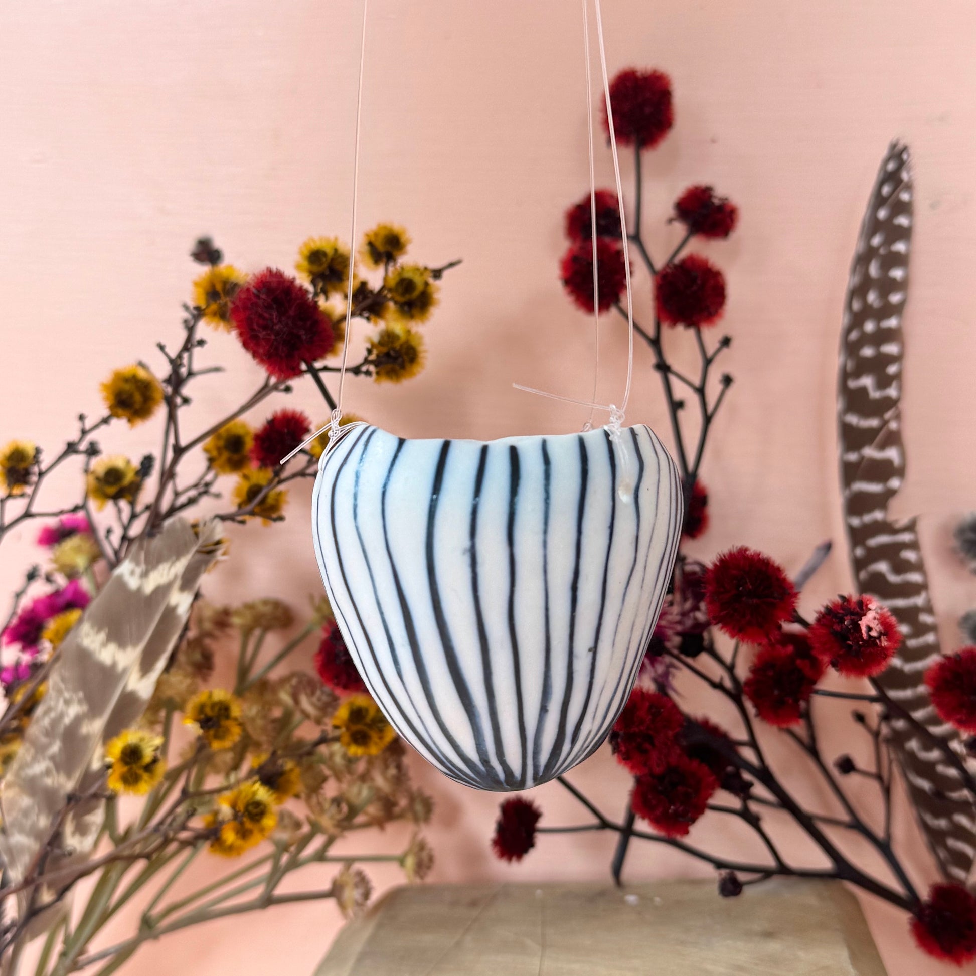 A one of a kind porcelain hanging vase, made by Katherine in her home studio in castlemaine, central Vic. These small pods hang from a strong clear thread.