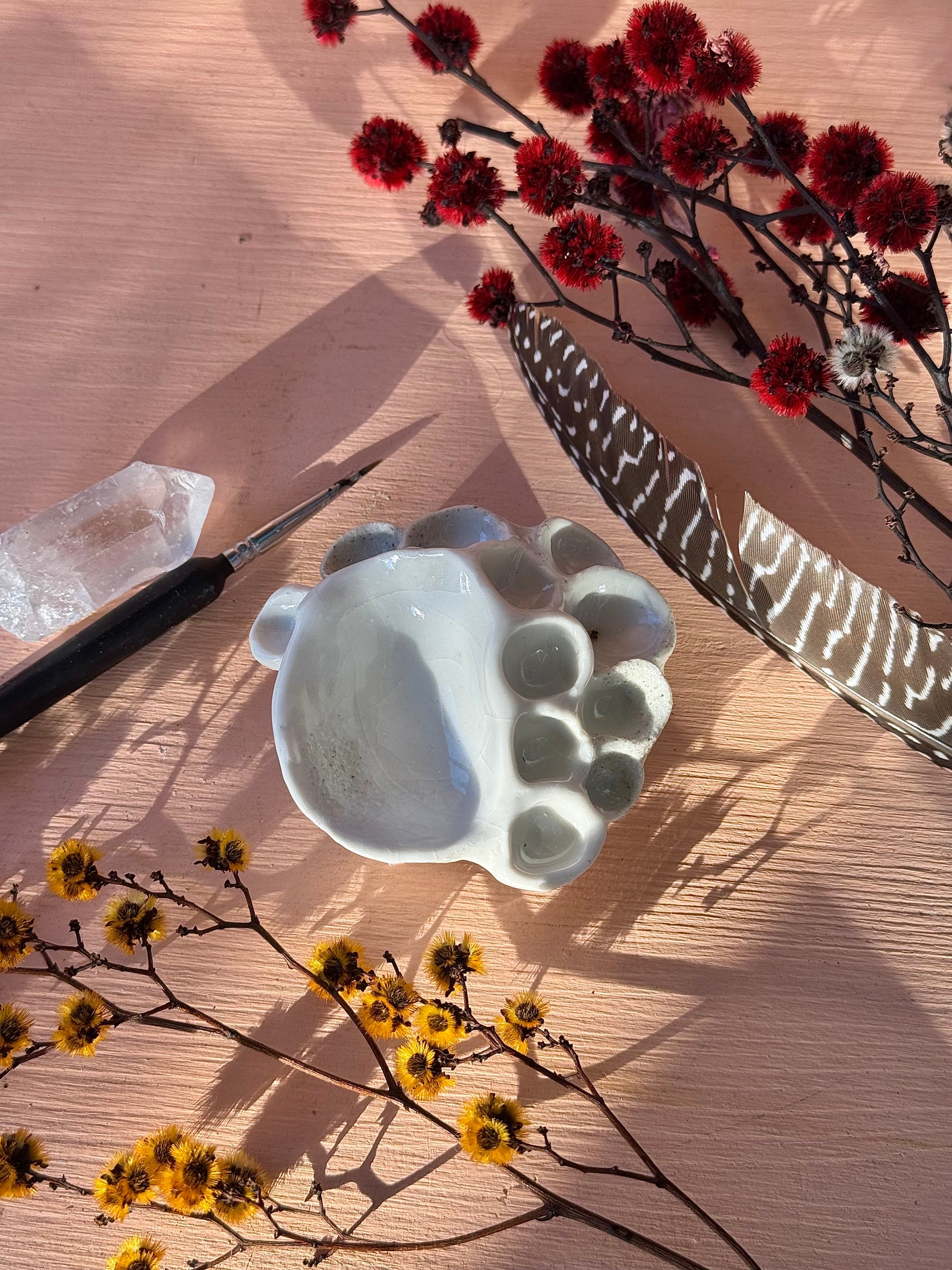 Care: These pieces are fired to high stoneware temperatures, (1280 to 1300 degrees c) to ensure that they are strong and durable. They will withstand normal wear and tear - but will most likely not survive being dropped on hard surfaces ie: tiles or concrete. They can be washed in warm water and soap if they become dirty - especially on any unglazed /matte surfaces. *Gold luster must be treated carefully, as it is on top of the glaze it can lose it's shine with anything abrasive or solvent based products.