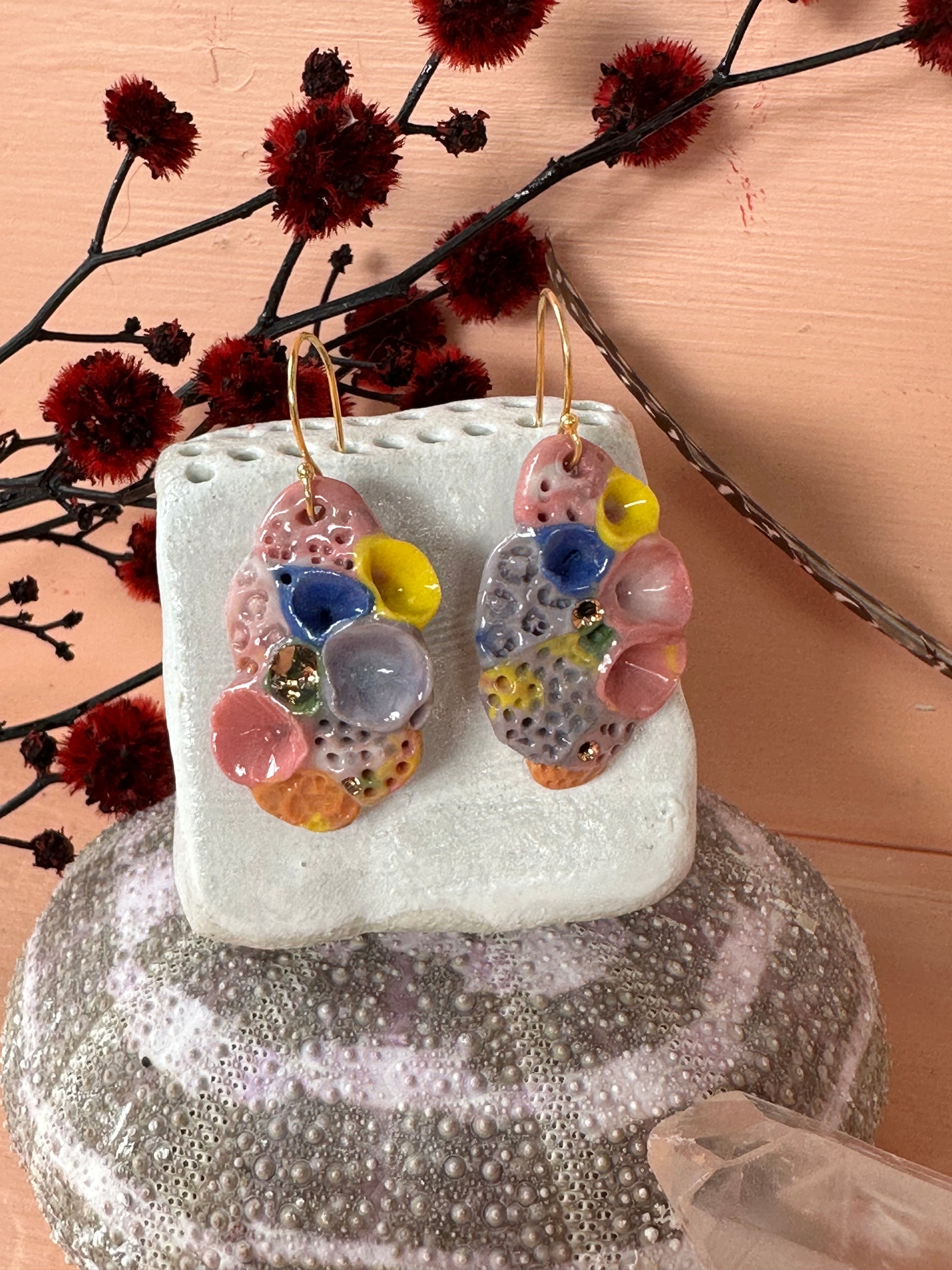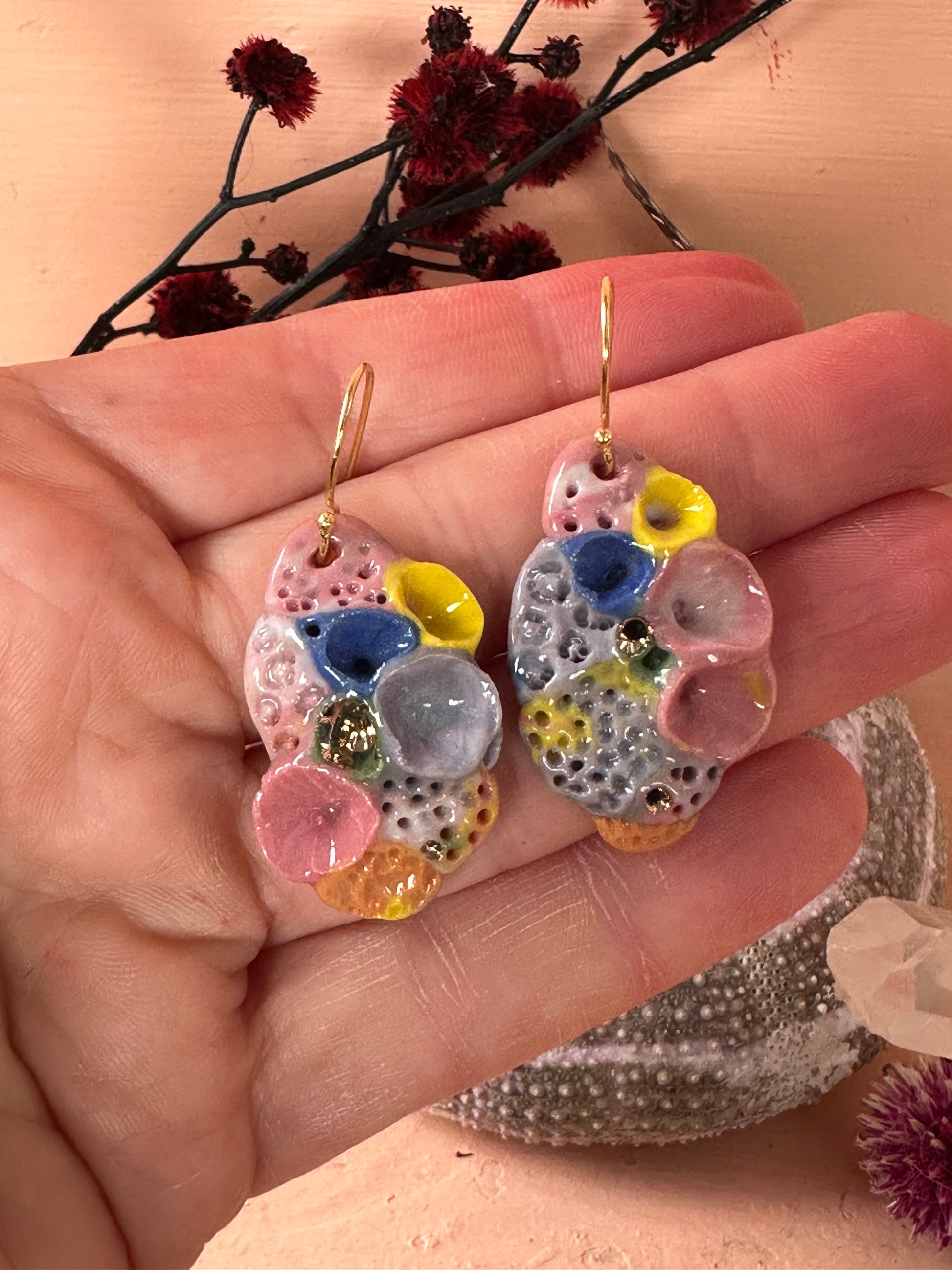 A pair of one of a kind hand crafted coloured porcelain earrings with gold lustre detail, and gold plated sterling silver hooks.