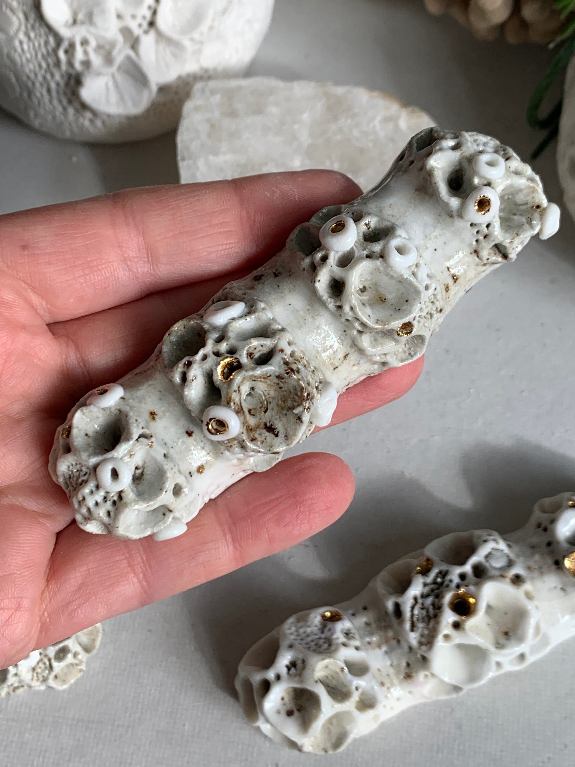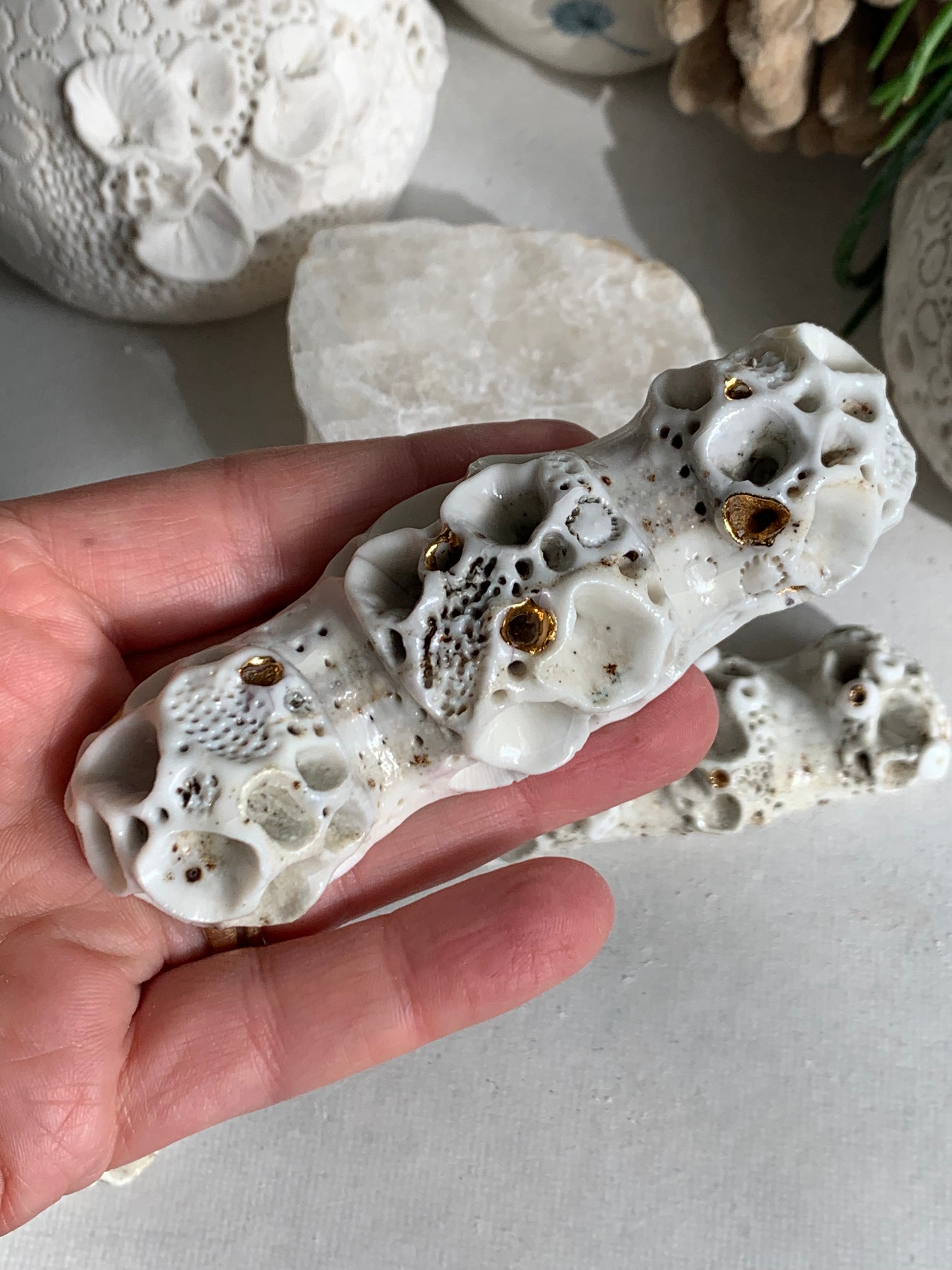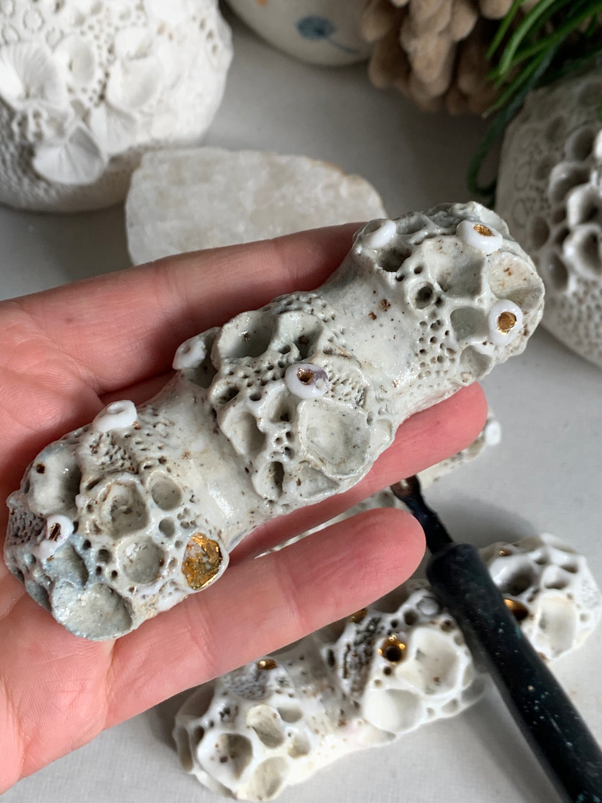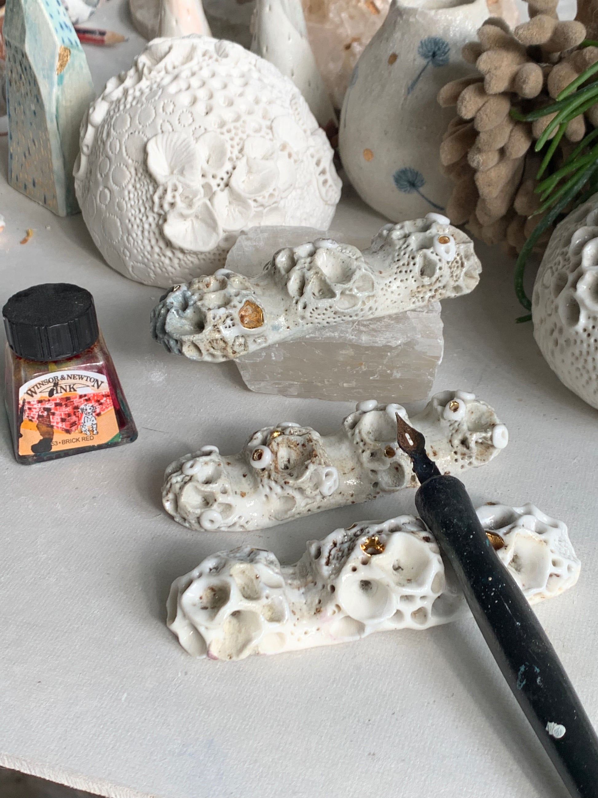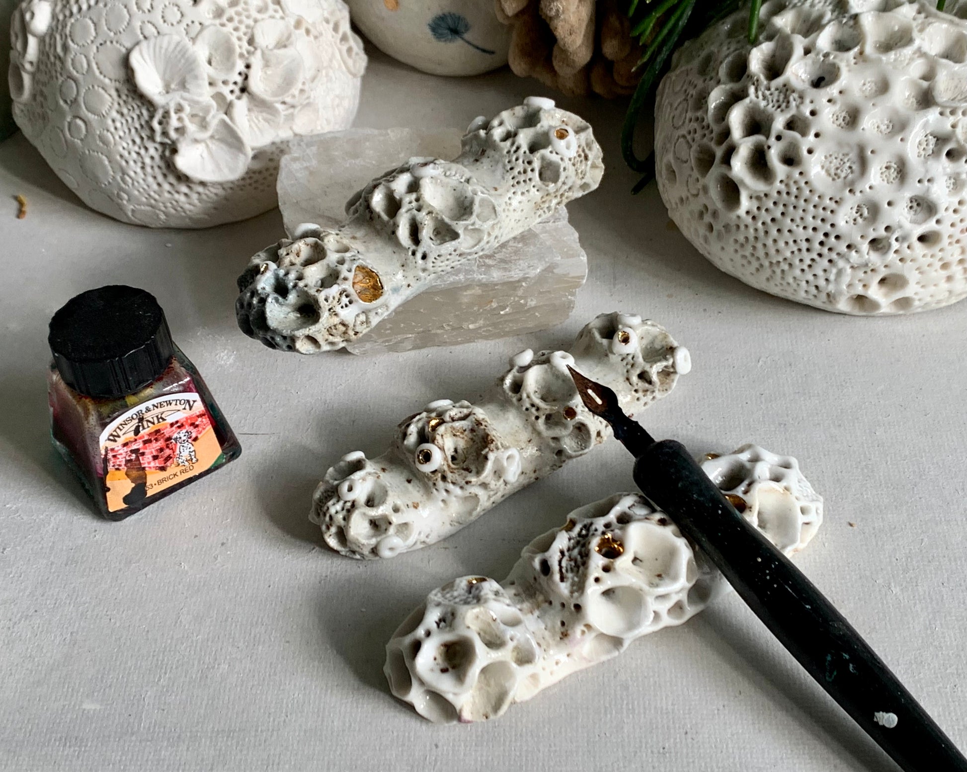 Hand formed and textured porcelain paintbrush/ pen rest, textured to give a ‘coral’ feel.